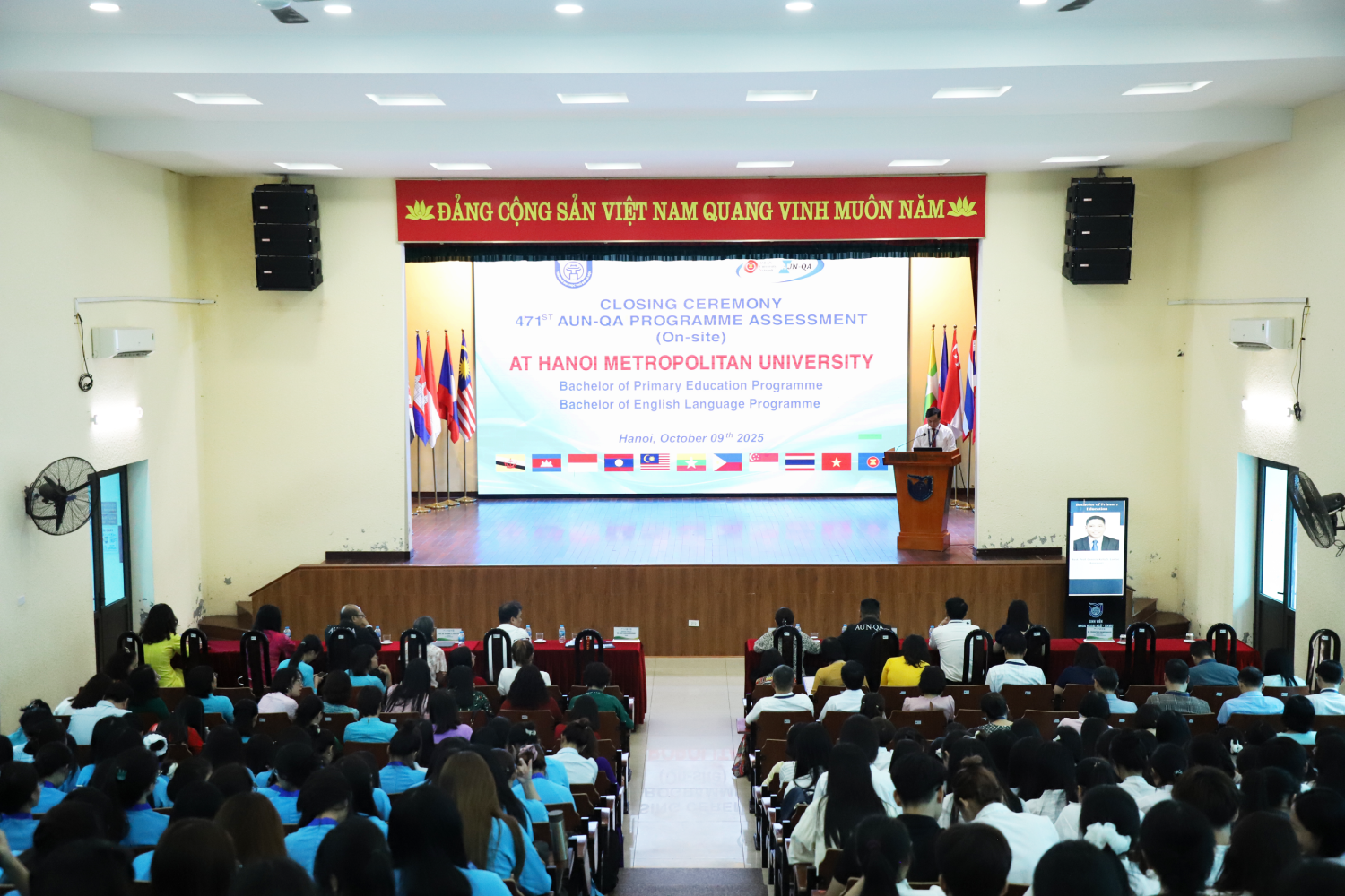 Sau thời gian làm việc khẩn trương, nghiêm túc, trách nhiệm và hiệu quả, sáng ngày 9/10, Trường Đại học Thủ đô Hà Nội phối hợp với Đoàn đánh giá ngoài theo tiêu chuẩn AUN-QA tổ chức Bế mạc đợt khảo sát chính thức đánh giá chất lượng giáo dục đối với hai chương trình đào tạo đại học: Cử nhân Ngôn ngữ Anh và Cử nhân Giáo dục Tiểu học.