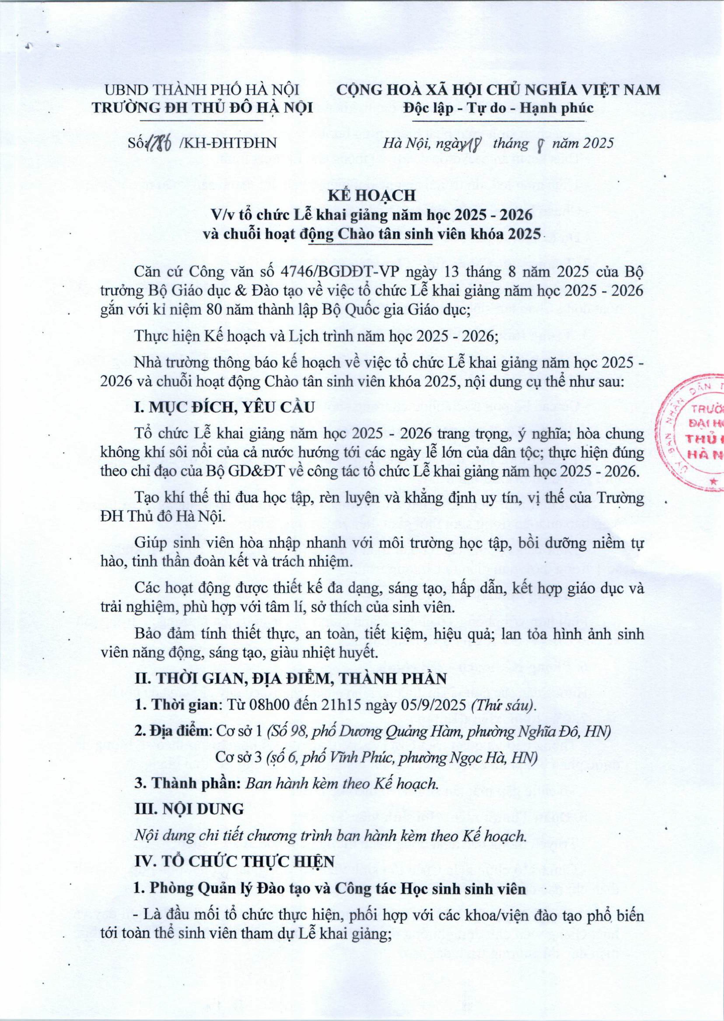 Nhà trường thông báo về việc tổ chức Lễ khai giảng năm học 2025-2026 và chuỗi hoạt động Chào tân sinh viên khóa 2025