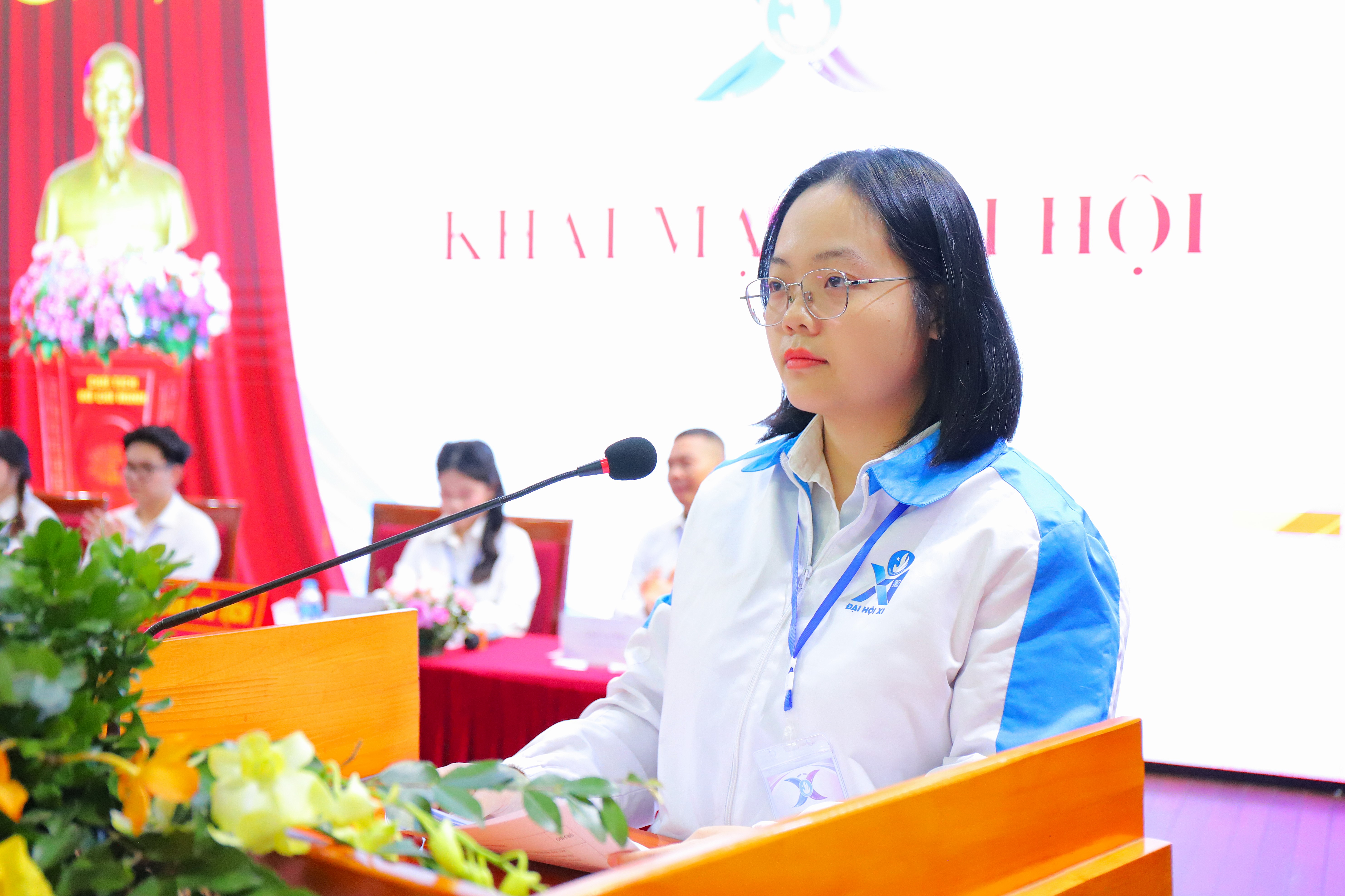 Đồng chí Trương Thị Minh Huyền – Chủ tịch Hội Sinh viên Trường khóa X báo cáo tổng kết công tác Hội và phong trào sinh viên nhiệm kỳ 2023 – 2025.