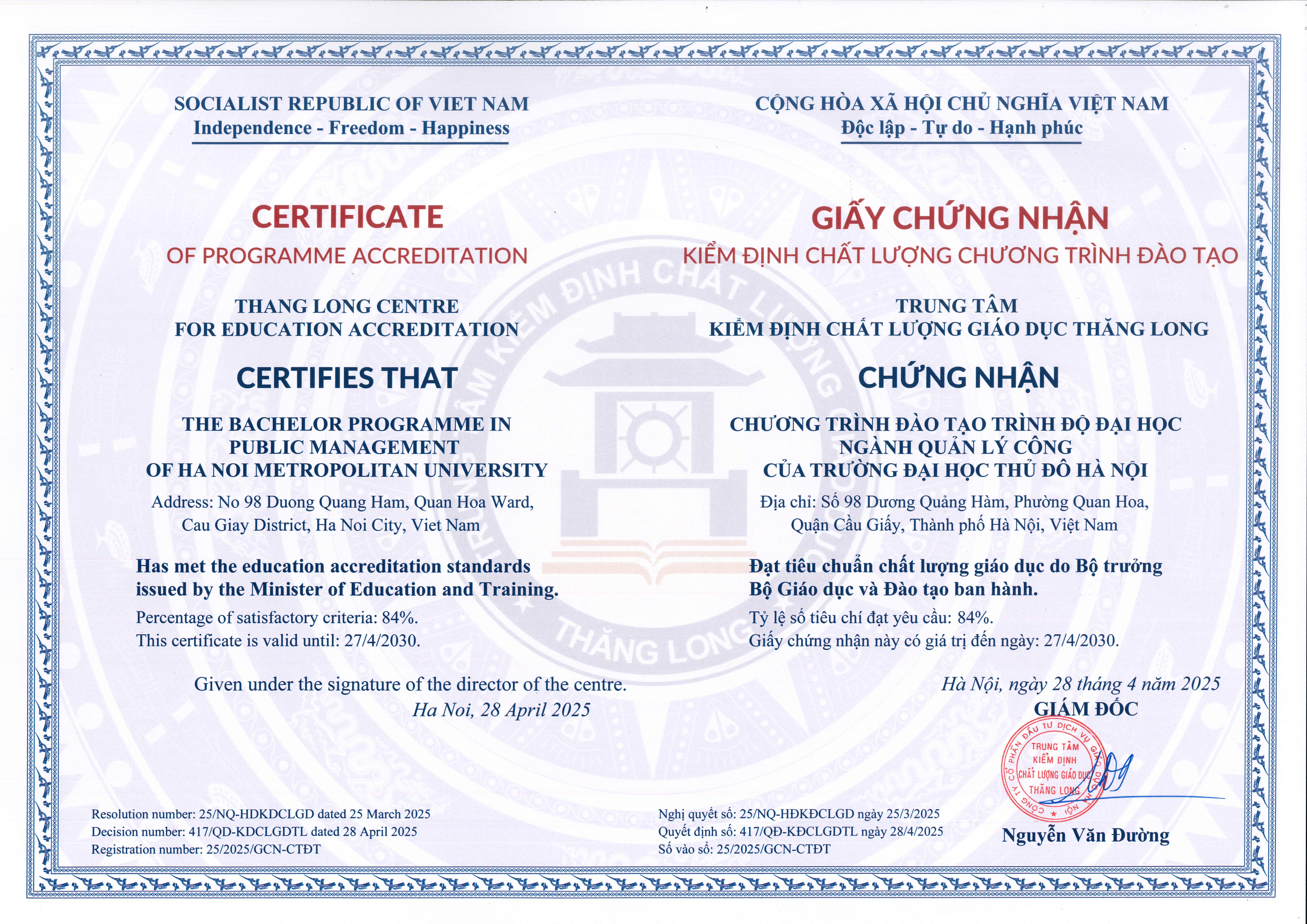 15. Certificate of Quality Accreditation for the Training Program in Vietnam Studies