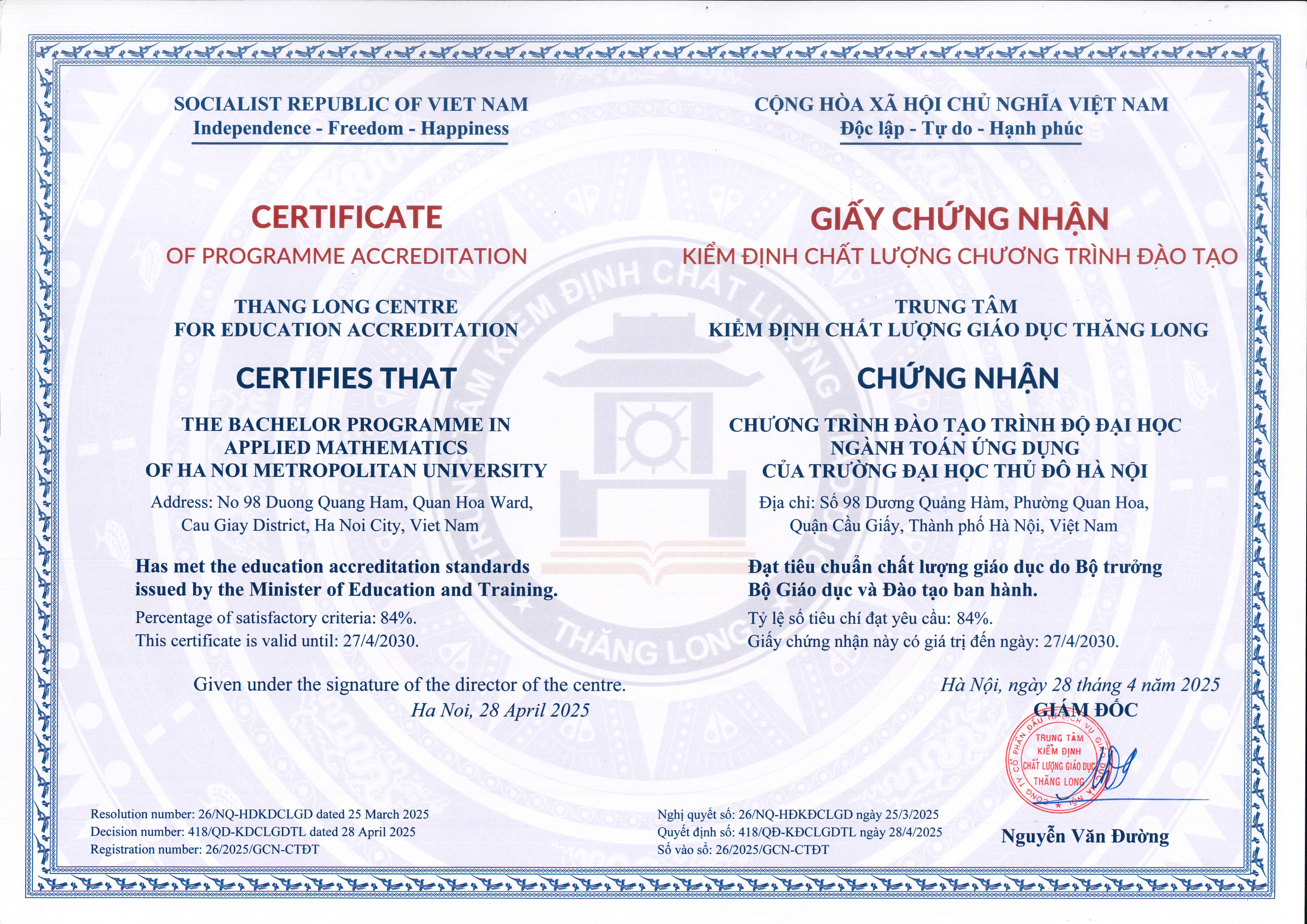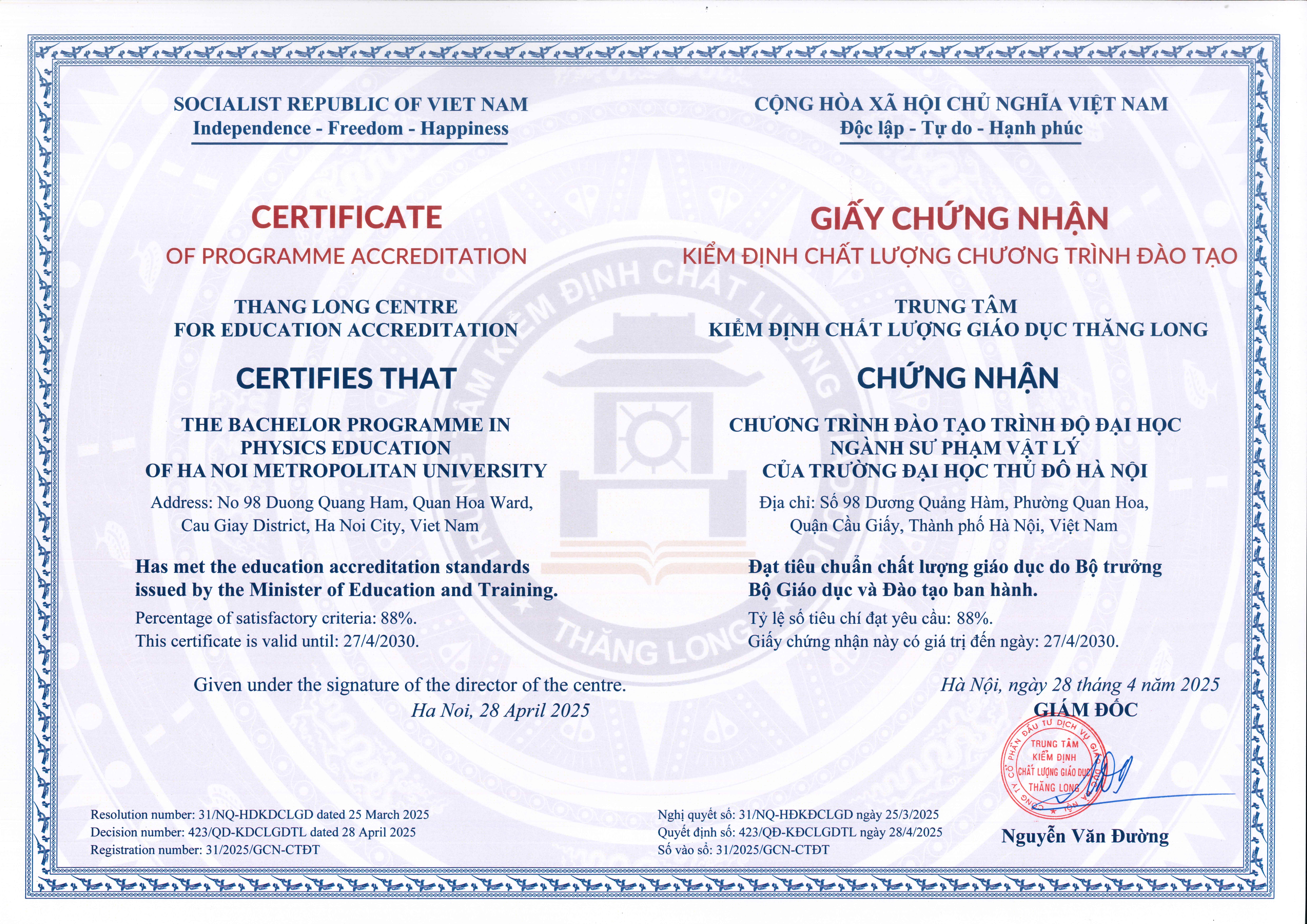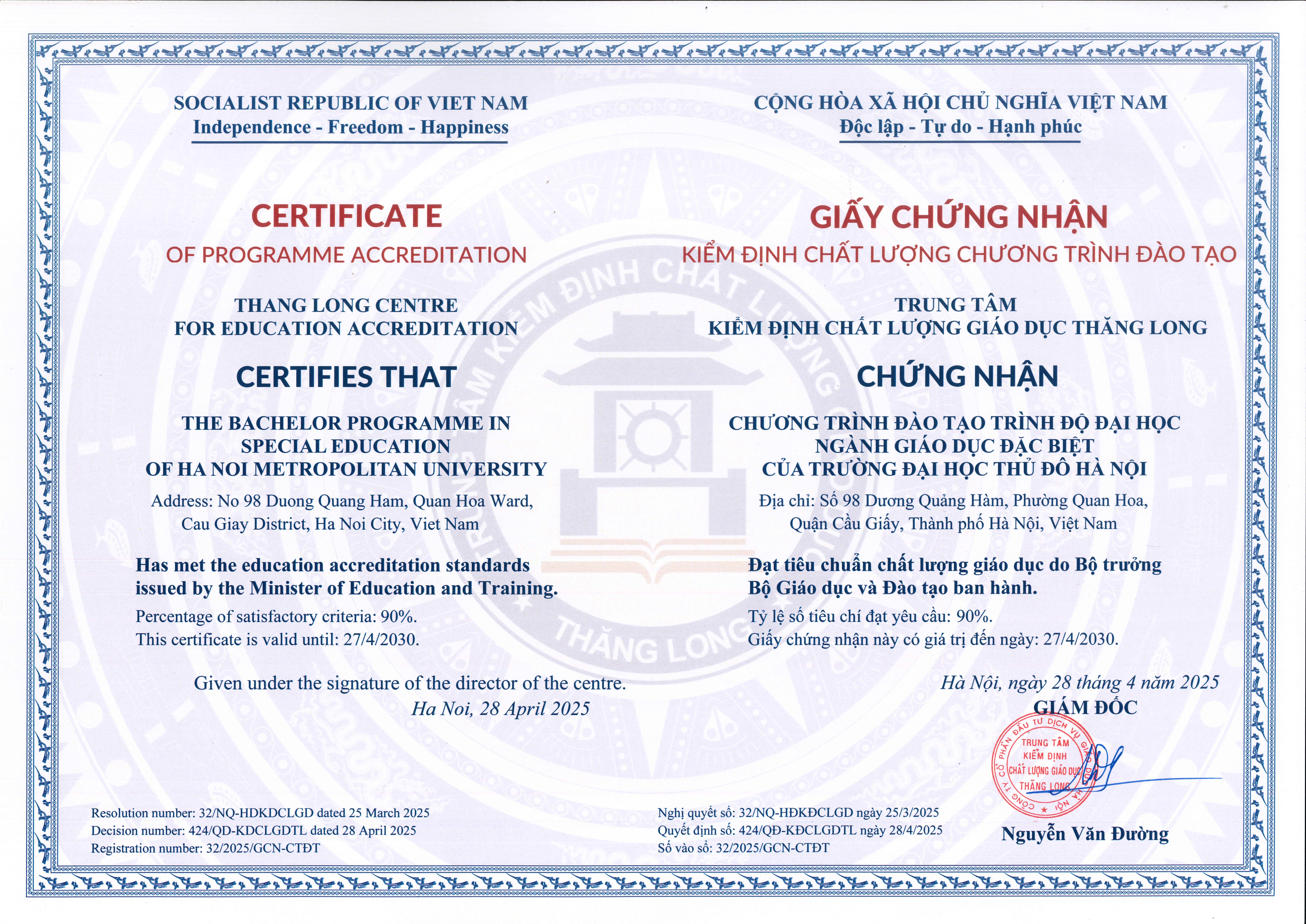 7. Certificate of Quality Accreditation for the Training Program in Vietnamese Language Teacher Education