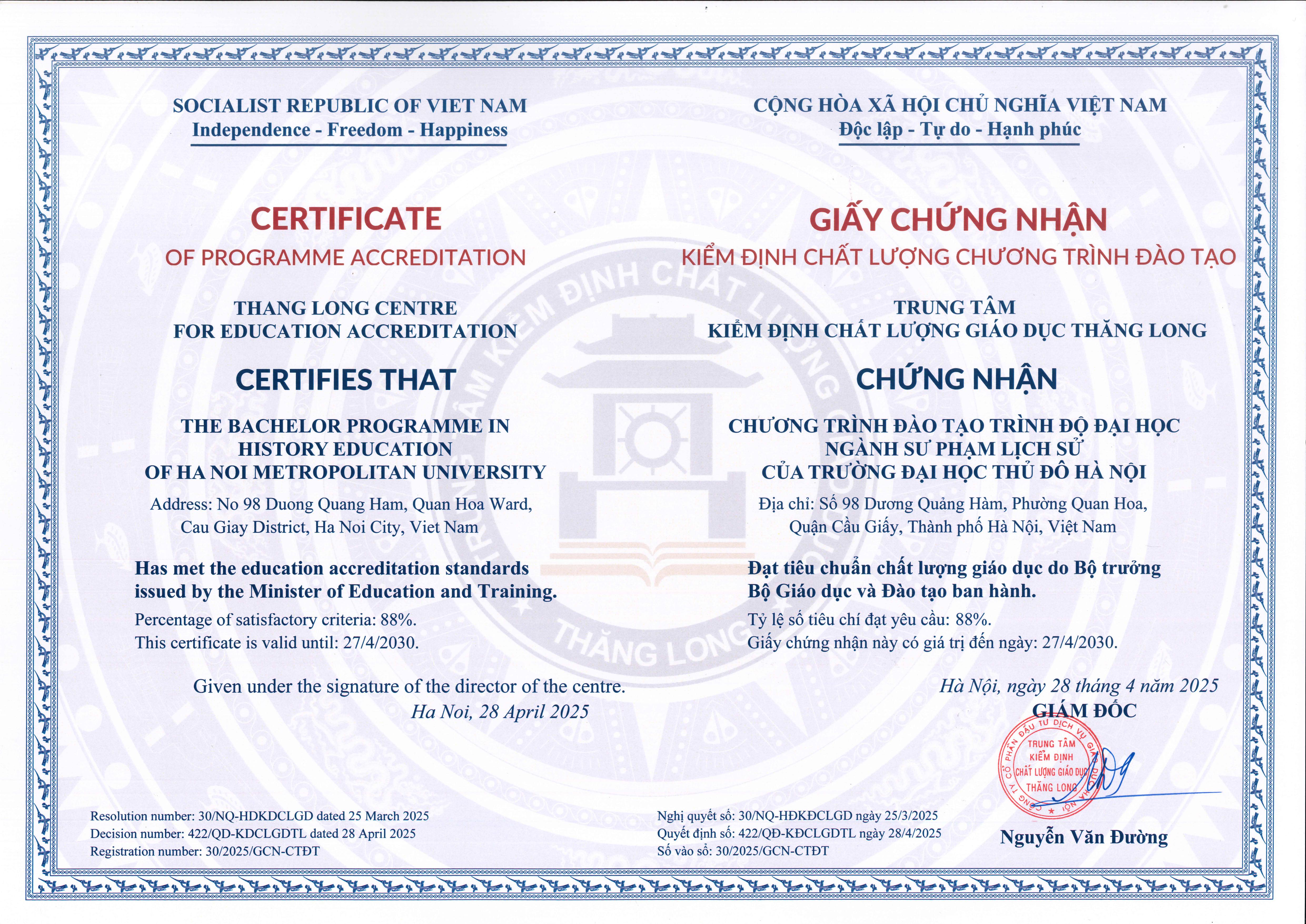 17. Giấy chứng nhận kiểm định chất lượng Chương trình đào tạo ngành Ngôn ngữ Lịch sử