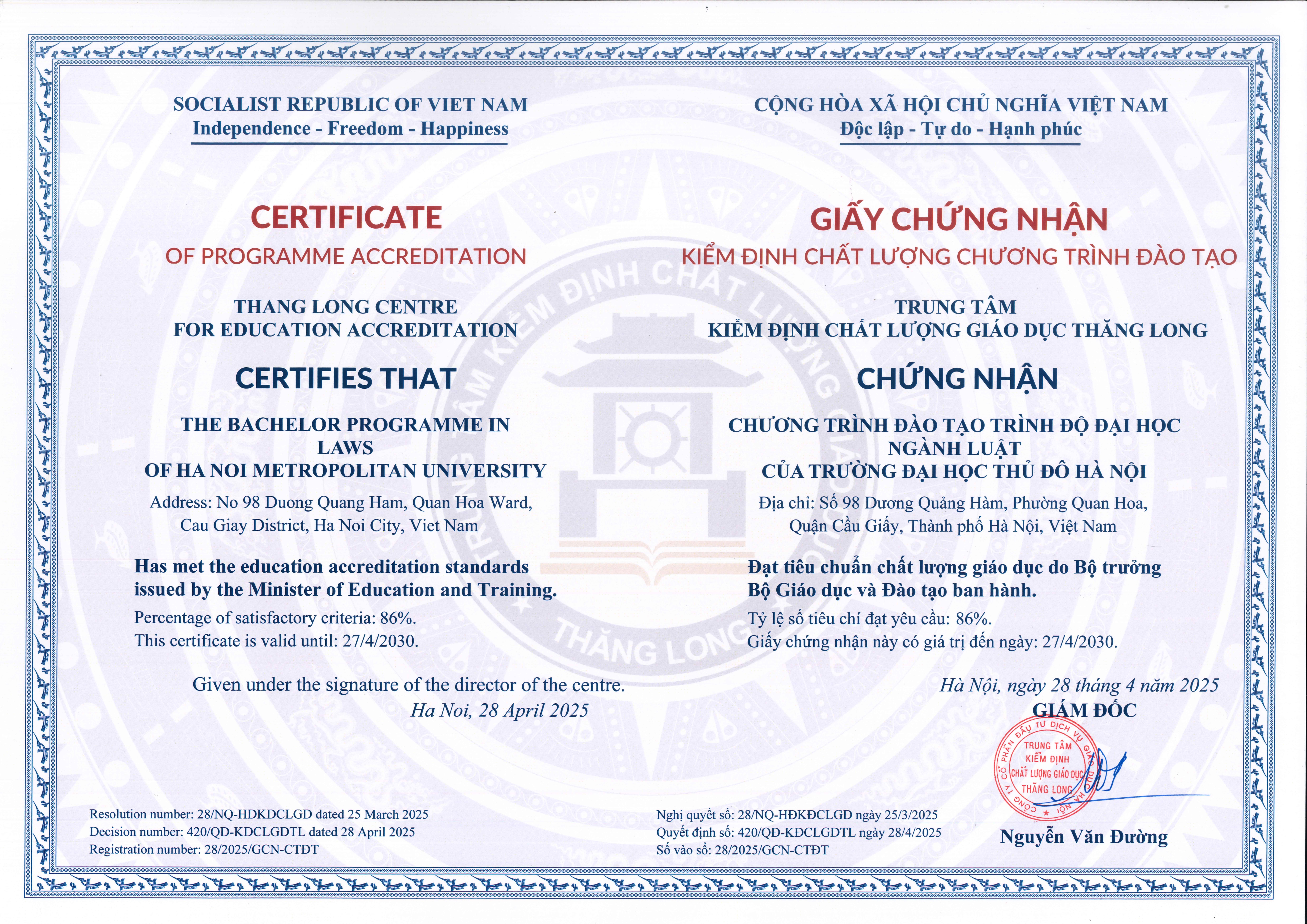 23. Giấy chứng nhận kiểm định chất lượng Chương trình đào tạo ngành Luật