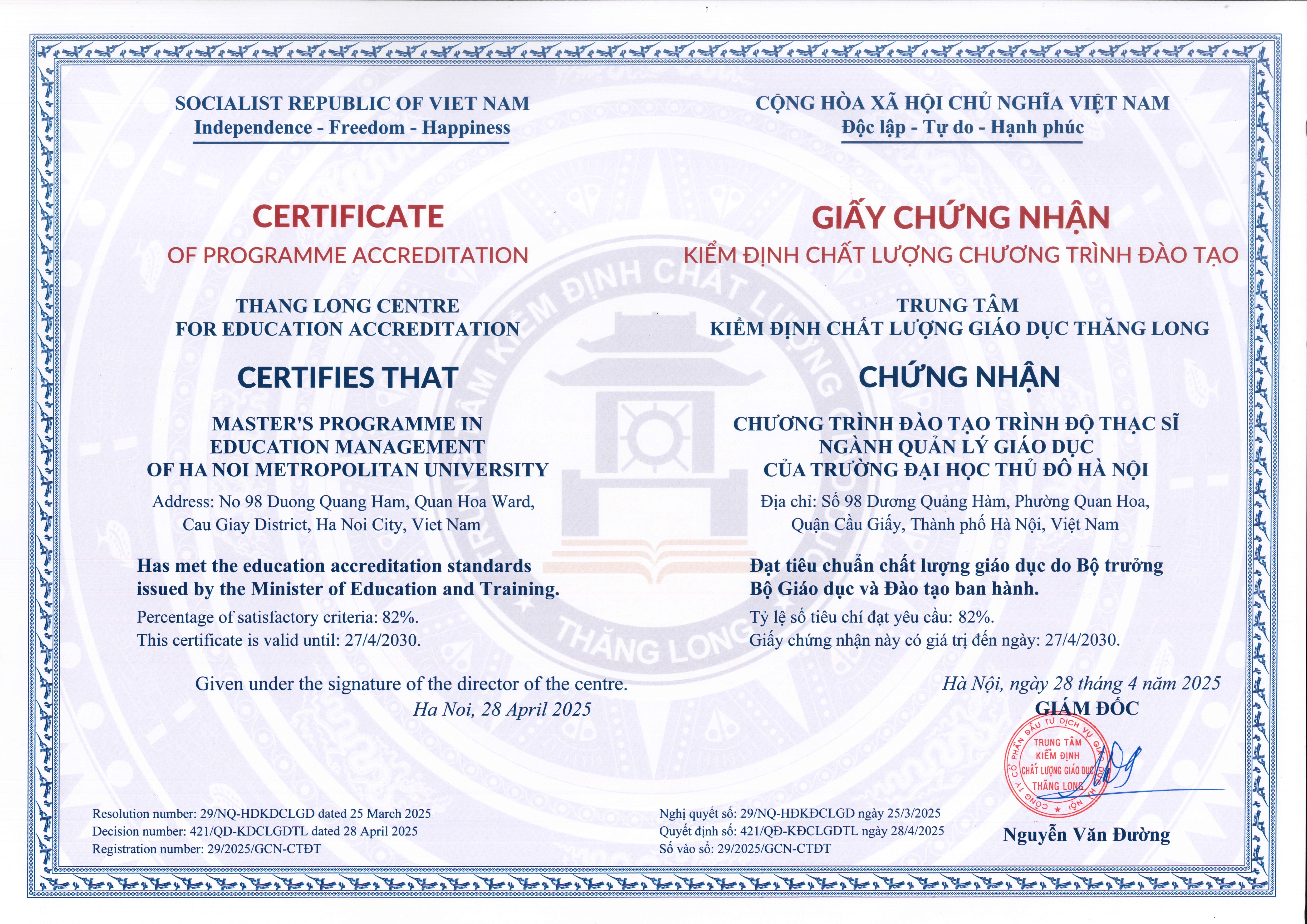 24. Giấy chứng nhận kiểm định chất lượng Chương trình đào tạo ngành Quản lý giáo dục trình độ Thạc sĩ