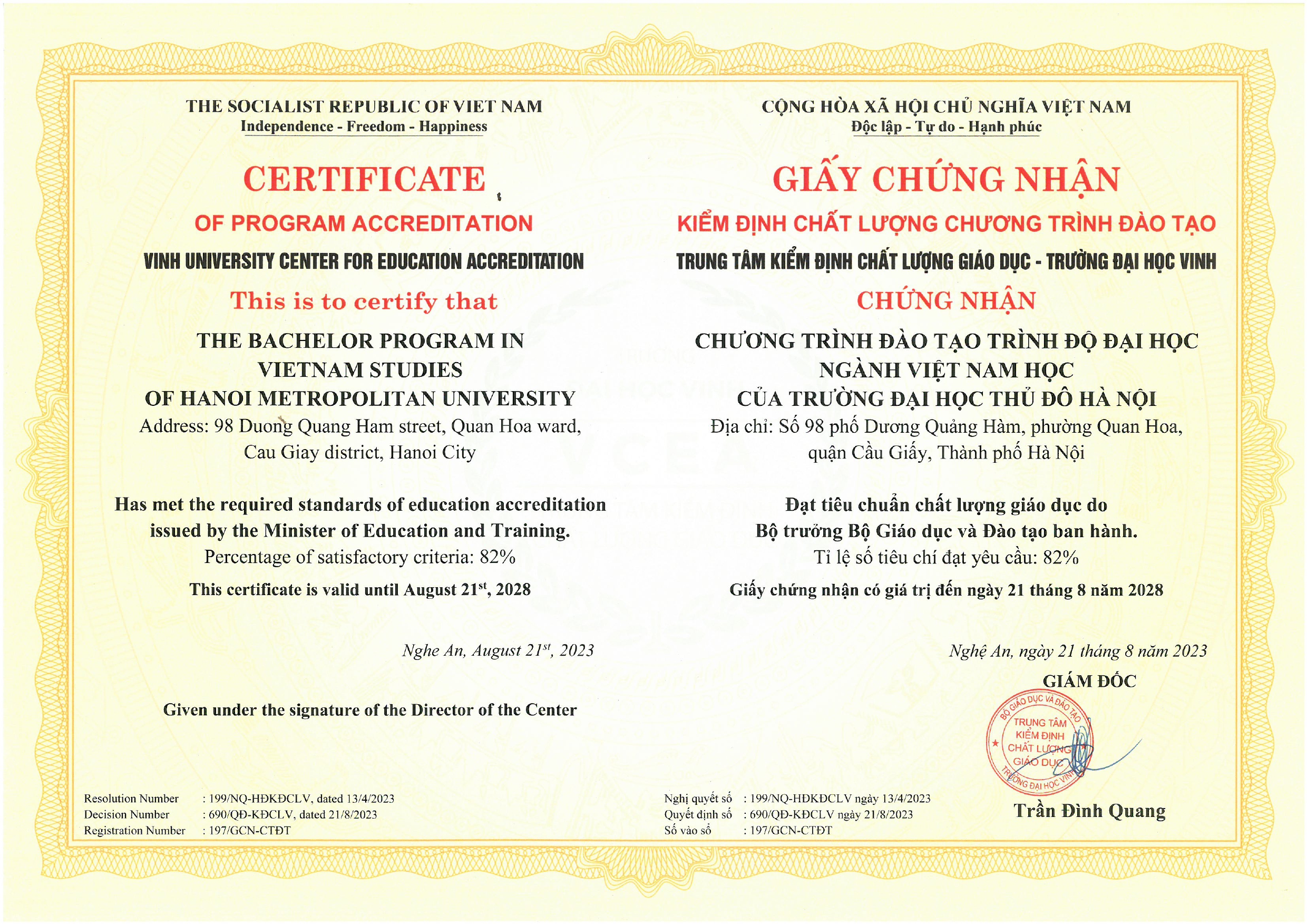 15. Giấy chứng nhận kiểm định chất lượng Chương trình đào tạo ngành Việt Nam học
