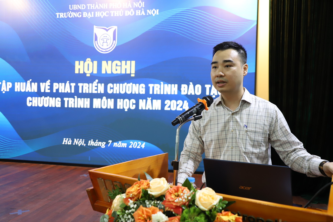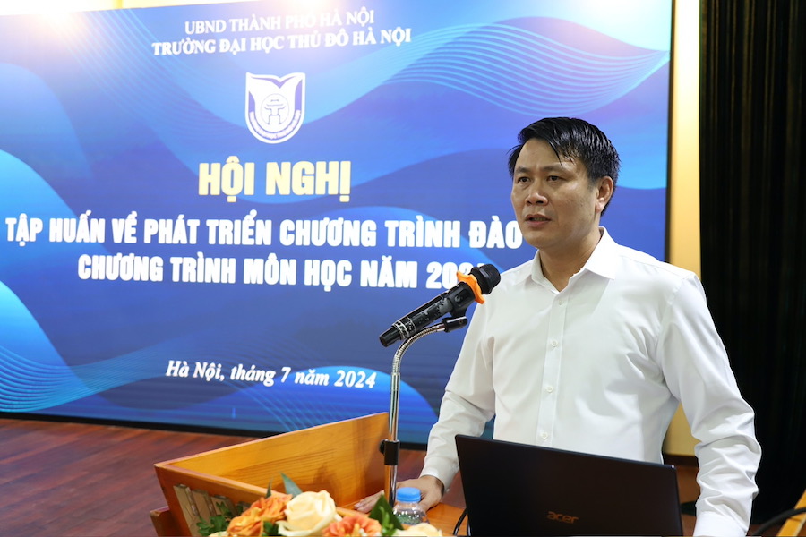 Phát biểu khai mạc Hội nghị tập huấn, PGS.TS. Nguyễn Văn Tuân, Phó Hiệu trưởng Nhà trường nhấn mạnh, Trường Đại học Thủ đô Hà Nội tổ chức các lớp bồi dưỡng phát triển chương trình đào tạo, chương trình môn học năm 2024 nhằm trang bị kiến thức, nâng cao năng lực chuyên môn, nghiệp vụ đối với đội ngũ cán bộ, giảng viên của Nhà trường về phát triển chương trình đào tạo, chương trình dạy học, trong đó chú trọng bồi dưỡng về năng lực phát triển chương trình đào tạo, tổ chức giảng dạy, đánh giá người học theo phương pháp hiện đại, theo chuẩn đầu ra. Đáp ứng yêu cầu đổi mới chương trình đào tạo, góp phần nâng cao chất lượng đạo của Trường Đại học Thủ đô trong giai đoạn hiện nay. Phó Hiệu trưởng Nguyễn Văn Tuân yêu cầu, việc tổ chức lớp bồi dưỡng phải theo đúng quy định hiện hành; cán bộ, giảng viên tham dự lớp bồi dưỡng phải thực hiện nghiêm túc nội quy học tập, đảm bảo đầy đủ, đạt yêu cầu.