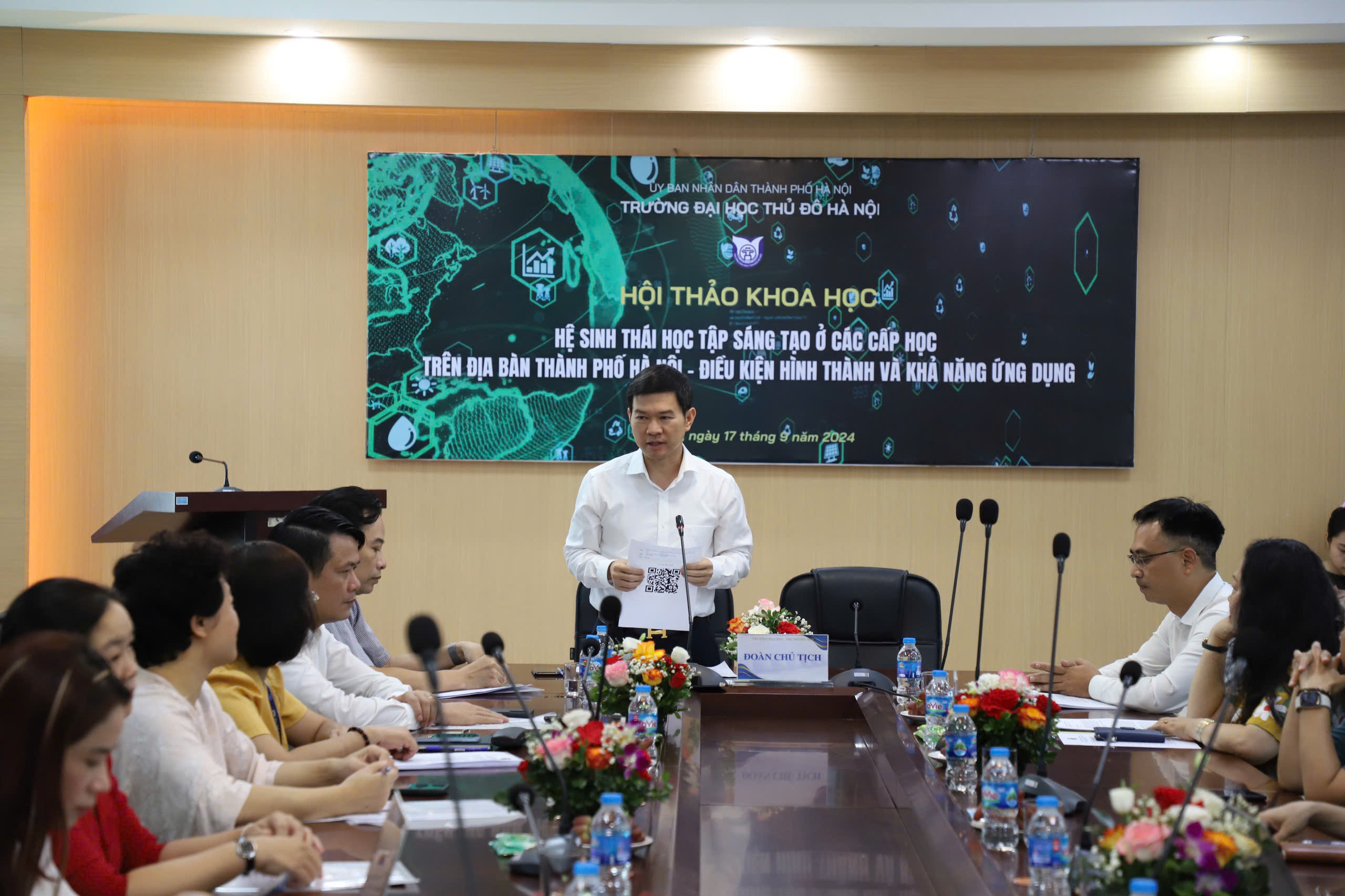 Tại Hội thảo, PGS.TS. Nguyễn Anh Tuấn, Chủ tịch Hội đồng trường Trường Đại học Thủ đô Hà Nội đã trình bày báo cáo đề dẫn, nêu rõ tầm quan trọng của việc xây dựng một hệ sinh thái học tập sáng tạo. Chủ tịch Nguyễn Anh Tuấn nhấn mạnh, hệ sinh thái này không chỉ bao gồm trường học, mà còn cả các tổ chức giáo dục, doanh nghiệp và cộng đồng cùng hợp tác để tạo ra một môi trường học tập liên tục, sáng tạo và mang tính thực tiễn cao. Đồng thời, báo cáo đề dẫn cũng chỉ ra những thách thức và cơ hội khi áp dụng mô hình này trong bối cảnh của Thủ đô Hà Nội. Theo đó, hệ sinh thái học tập sáng tạo gồm 5 thành tố, 3 cấp độ. 5 thành tố đó là: Chủ thể học tập sáng tạo, tri thức học tập sáng tạo, công nghệ học tập sáng tạo, bối cảnh học tập sáng tạo, văn hoá – thể chế - chiến lược. 3 cấp độ của hệ sinh thái học tập gồm: Cấp Trường – Cấp Quận/Huyện – Cấp Thành phố.
