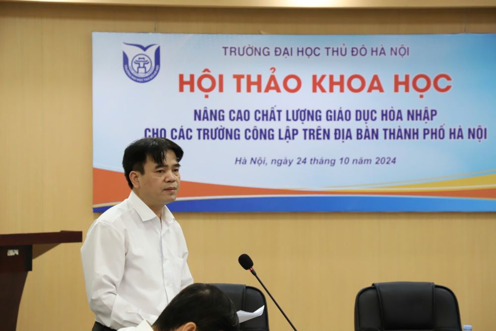 Phát biểu khai mạc Hội thảo, PGS.TS. Nguyễn Anh Tuấn, Chủ tịch Hội đồng trường Trường Đại học Thủ đô Hà Nội đã nhấn mạnh vai trò quan trọng của giáo dục hòa nhập trong việc xây dựng một hệ thống giáo dục thân thiện, nơi mọi học sinh, dù có hoàn cảnh đặc biệt, đều có quyền được học tập và phát triển toàn diện. Đồng thời, Chủ tịch Hội đồng trường Nguyễn Anh Tuấn cũng chỉ ra các thách thức hiện nay đối với việc giáo dục hòa nhập cho trẻ khuyết tật như cơ sở vật chất chưa đồng bộ, đội ngũ giáo viên thiếu kiến thức chuyên môn về giáo dục hòa nhập và nhận thức xã hội về nhu cầu của trẻ khuyết tật vẫn còn hạn chế.