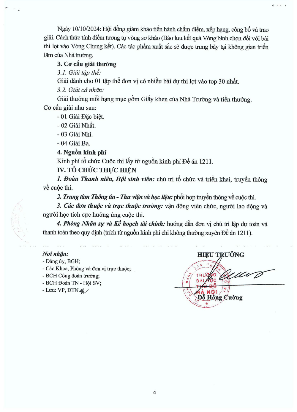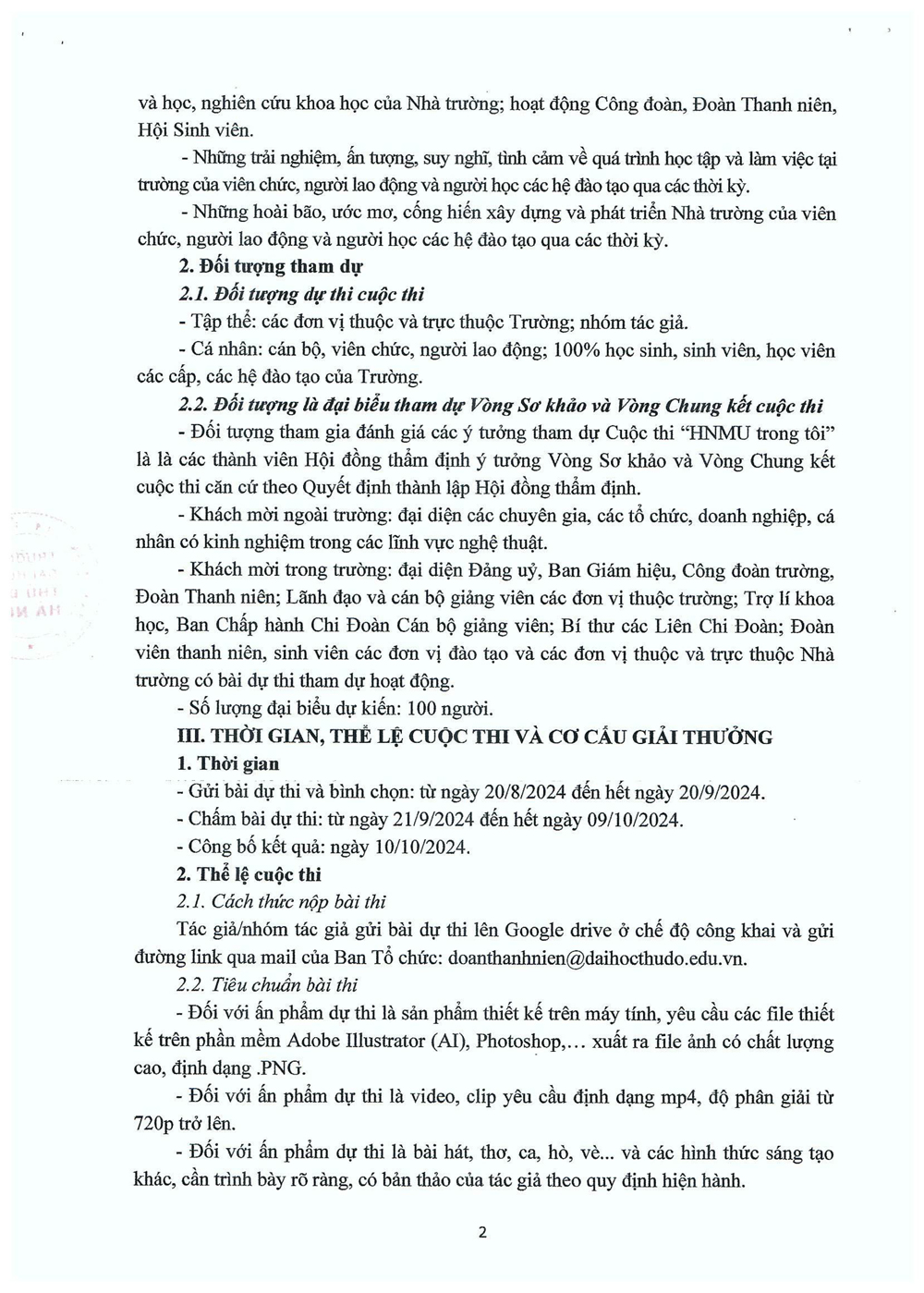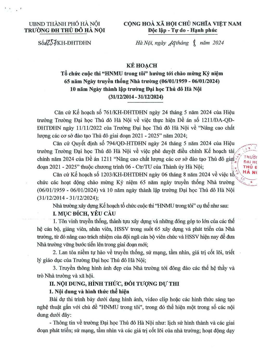 Kế hoạch tổ chức cuộc thi "HNMU trong tôi" hướng tới chào mừng Kỷ niệm 65 năm Ngày truyền thống Nhà trường (06/01/1959 - 06/01/2024) 10 năm Ngày thành lập trường Đại học Thủ đô Hà Nội