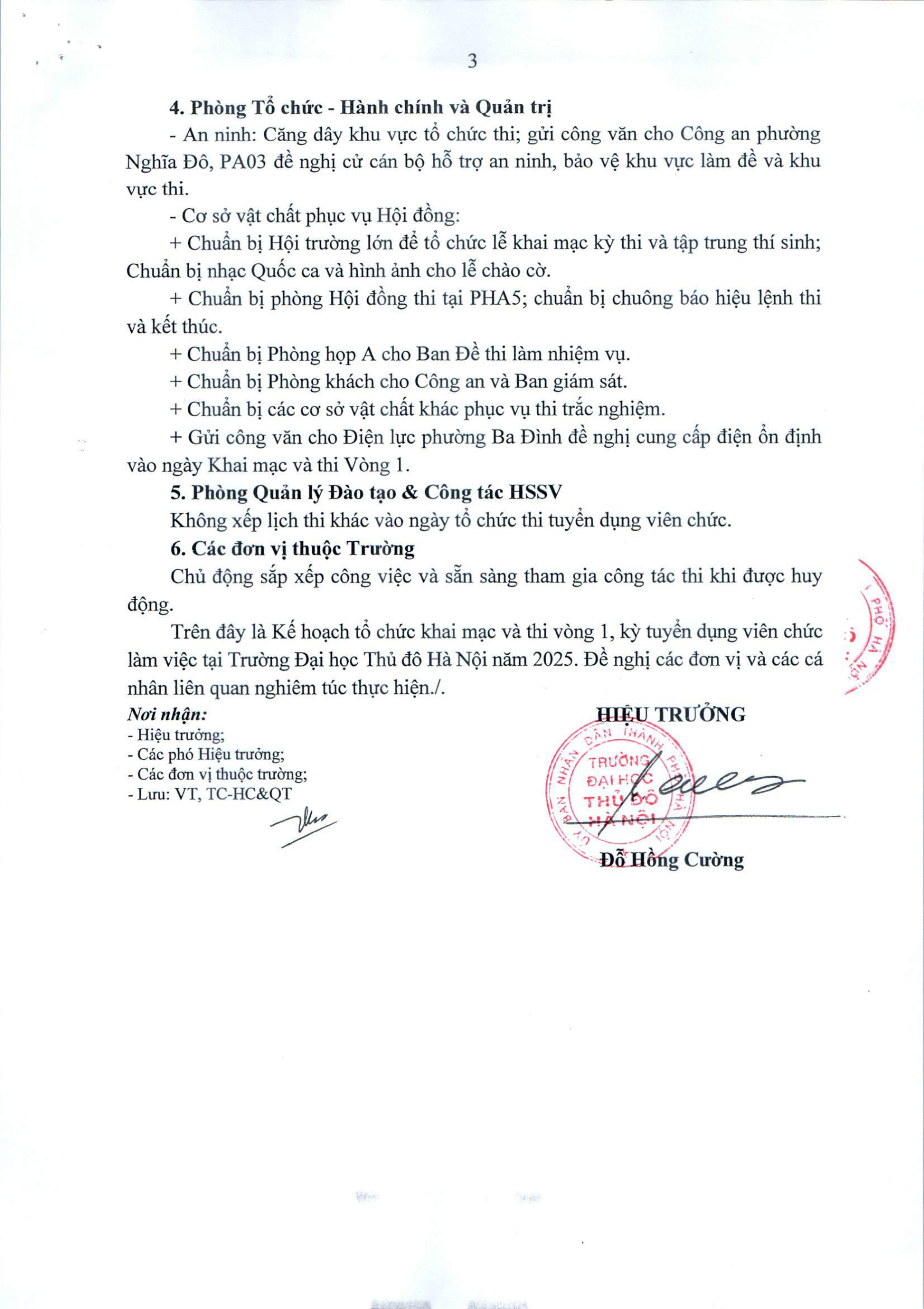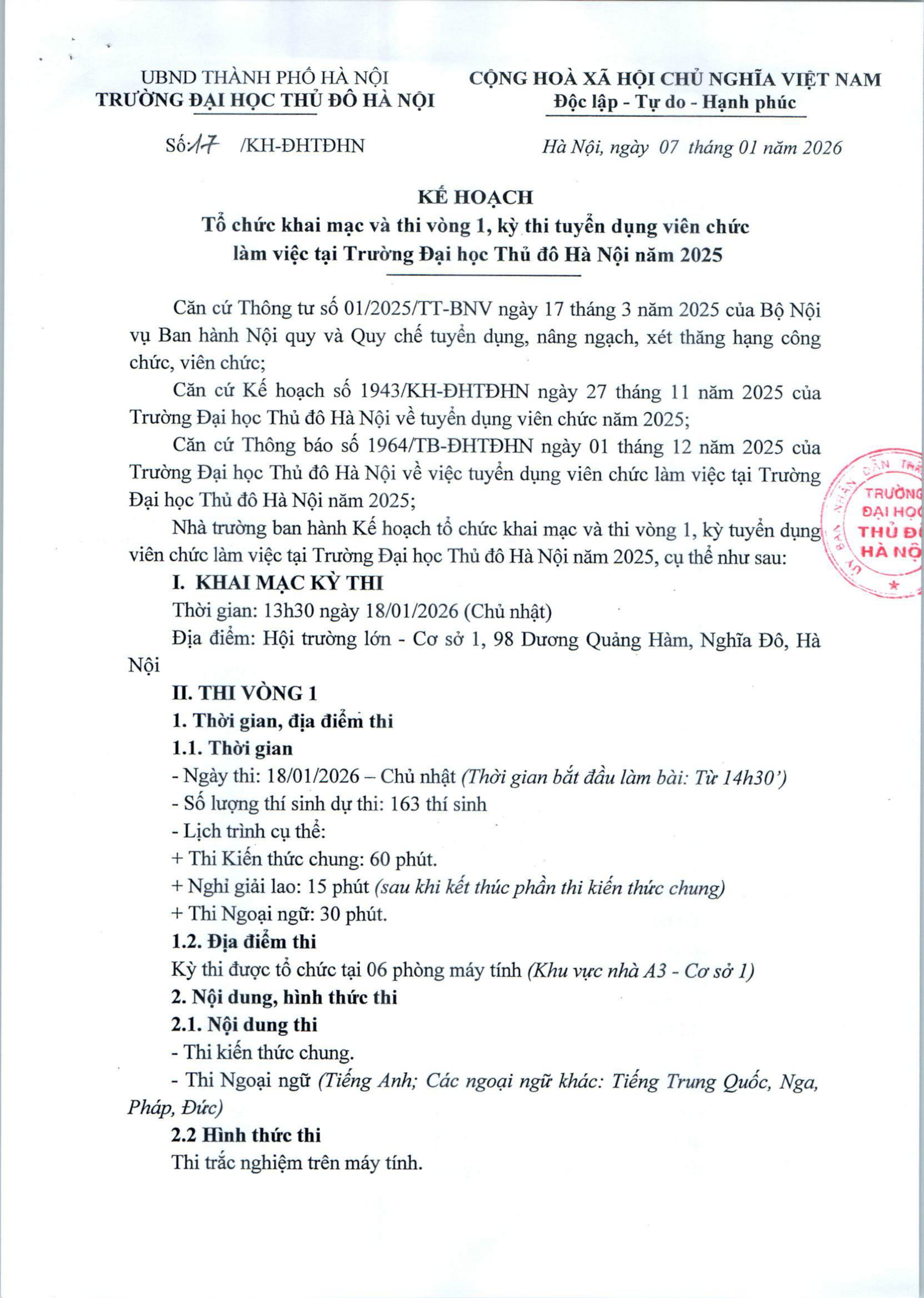 Kế hoạch tổ chức khai mạc và thi vòng 1, kỳ thi tuyển dụng viên chức làm việc tại Trường Đại học Thủ đô Hà Nội năm 2025
