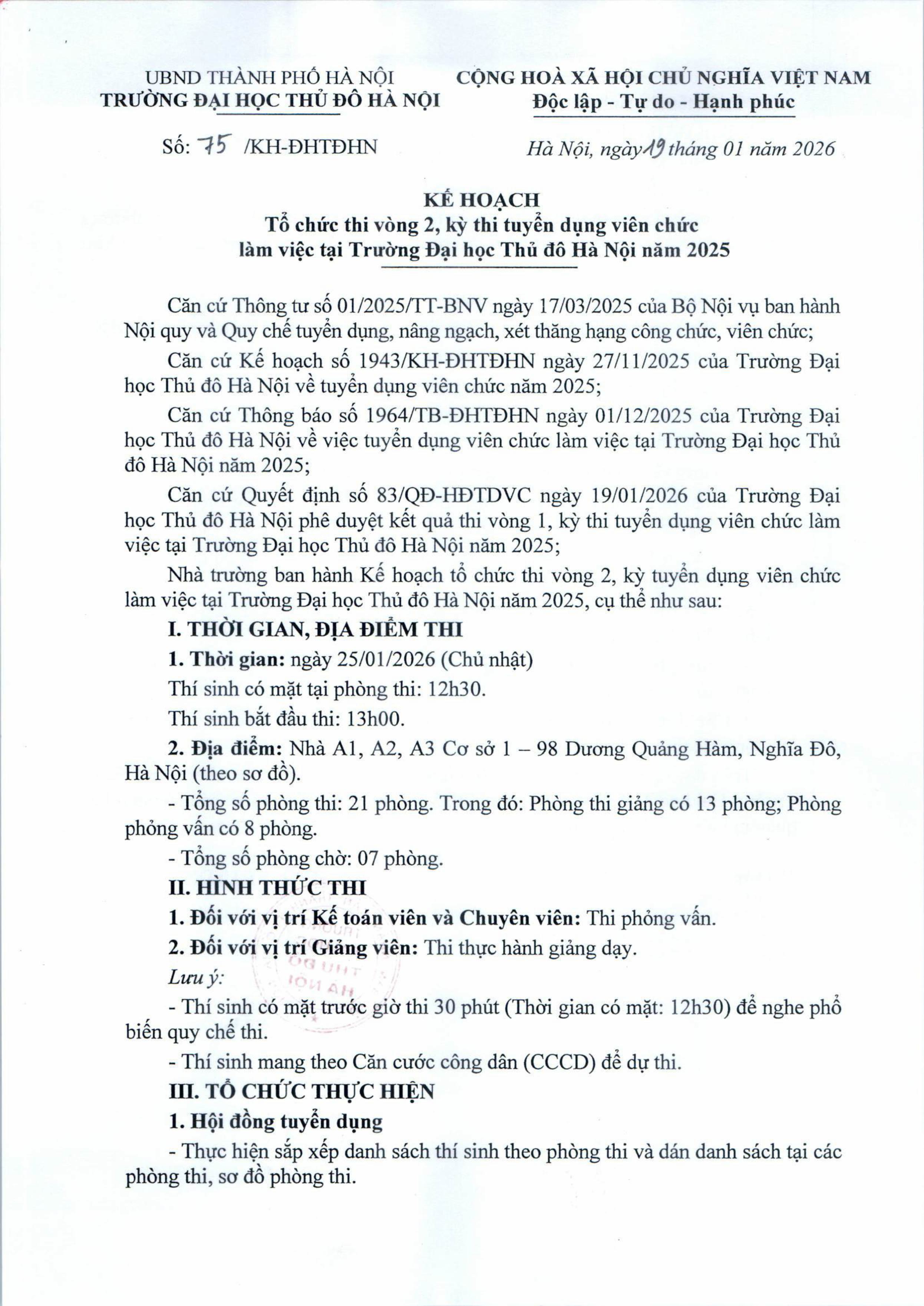 Kế hoạch tổ chức thi vòng 2, kỳ thi tuyển dụng viên chức làm việc tại Trường Đại học Thủ đô Hà Nội năm 2025