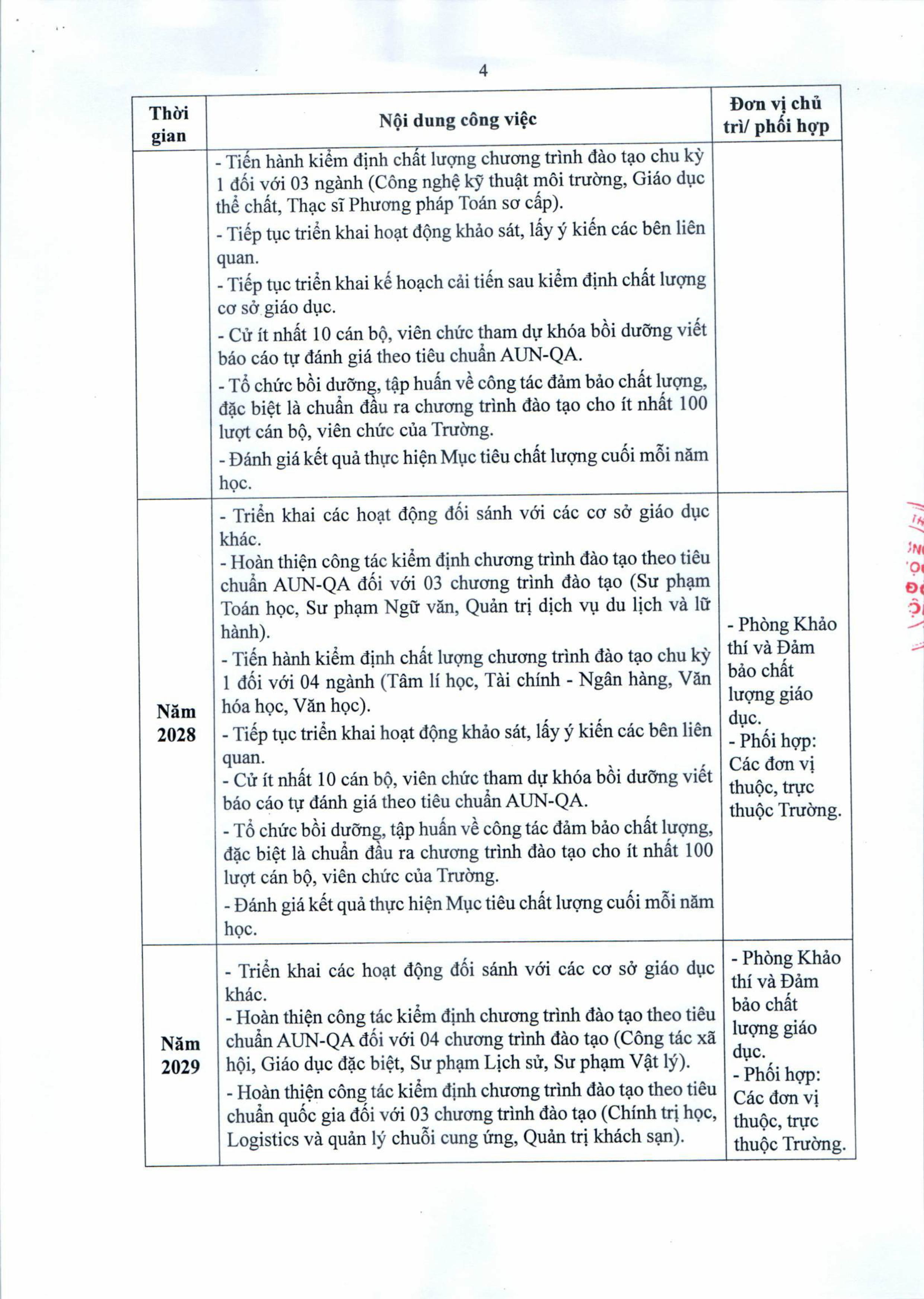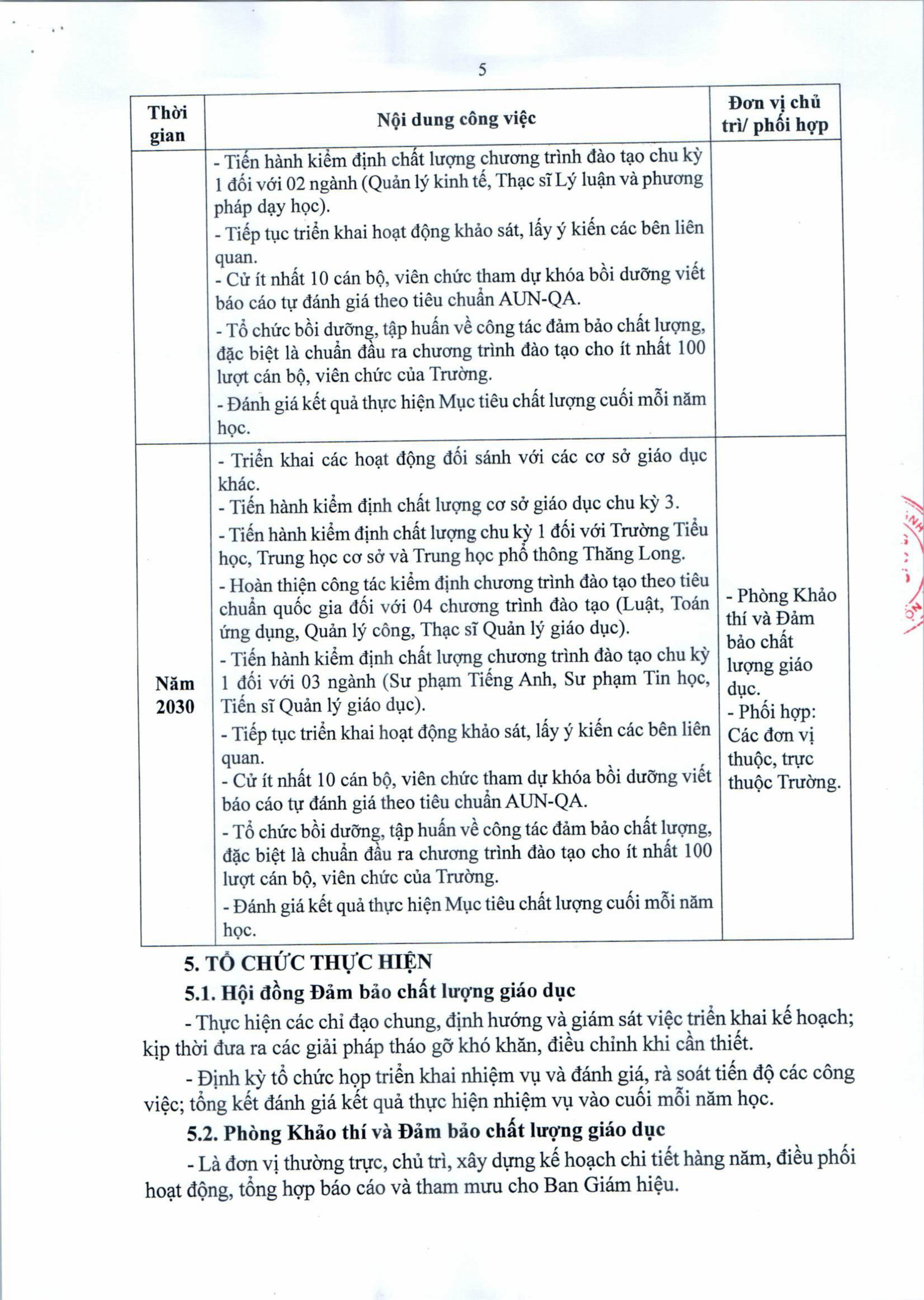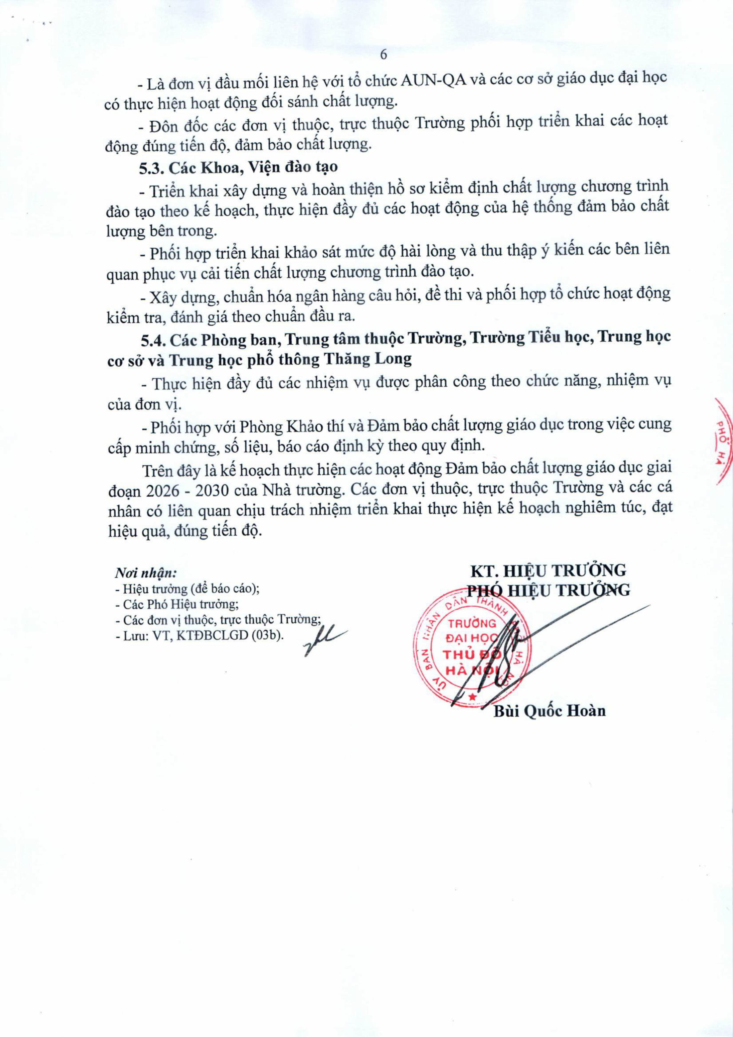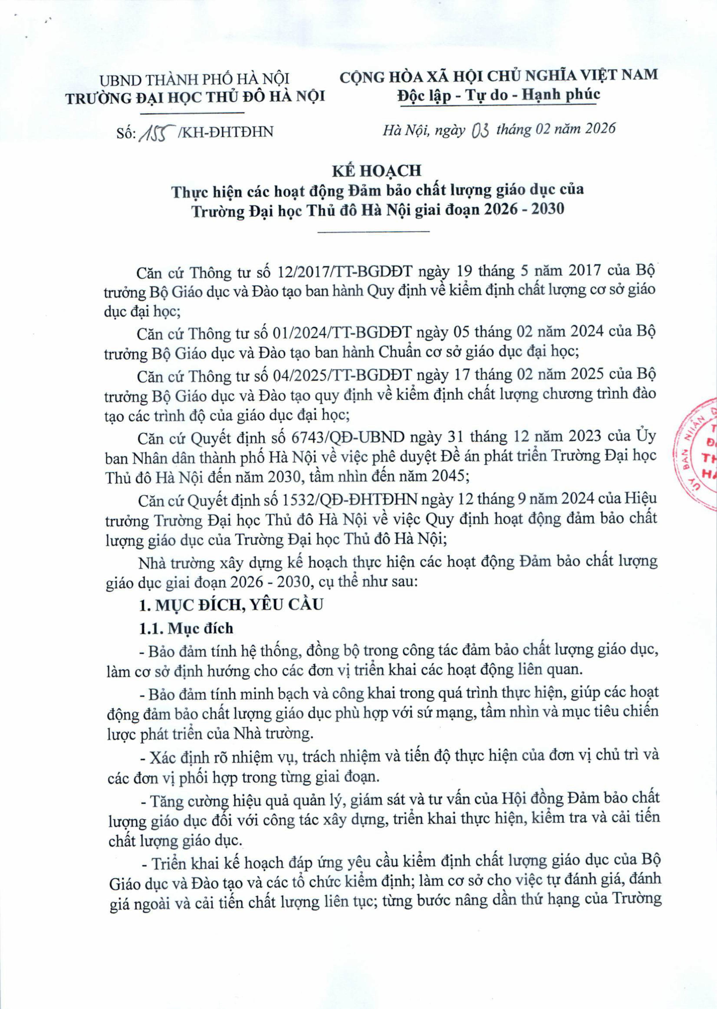 kế hoạch thực hiện các hoạt động Đảm bảo chất lượng giáo dục Trường Đại học Thủ đô Hà Nội giai đoạn 2026-2030