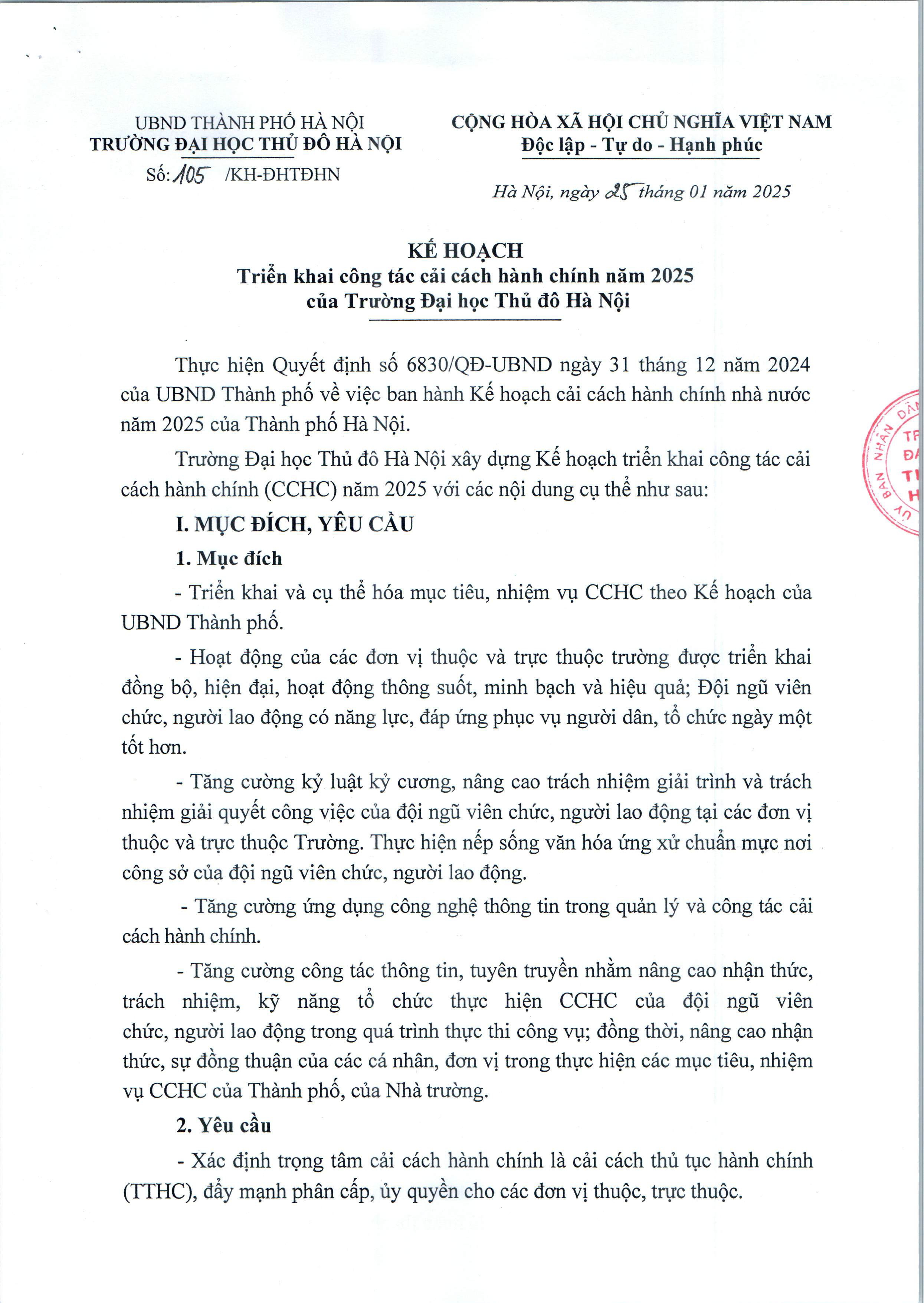 Kế hoạch triển khai công tác cải cách hành chính của Trường Đại học Thủ đô Hà Nội năm 2025 14/04/2025 14:26:53 | Số lần xem: 44 1 phút