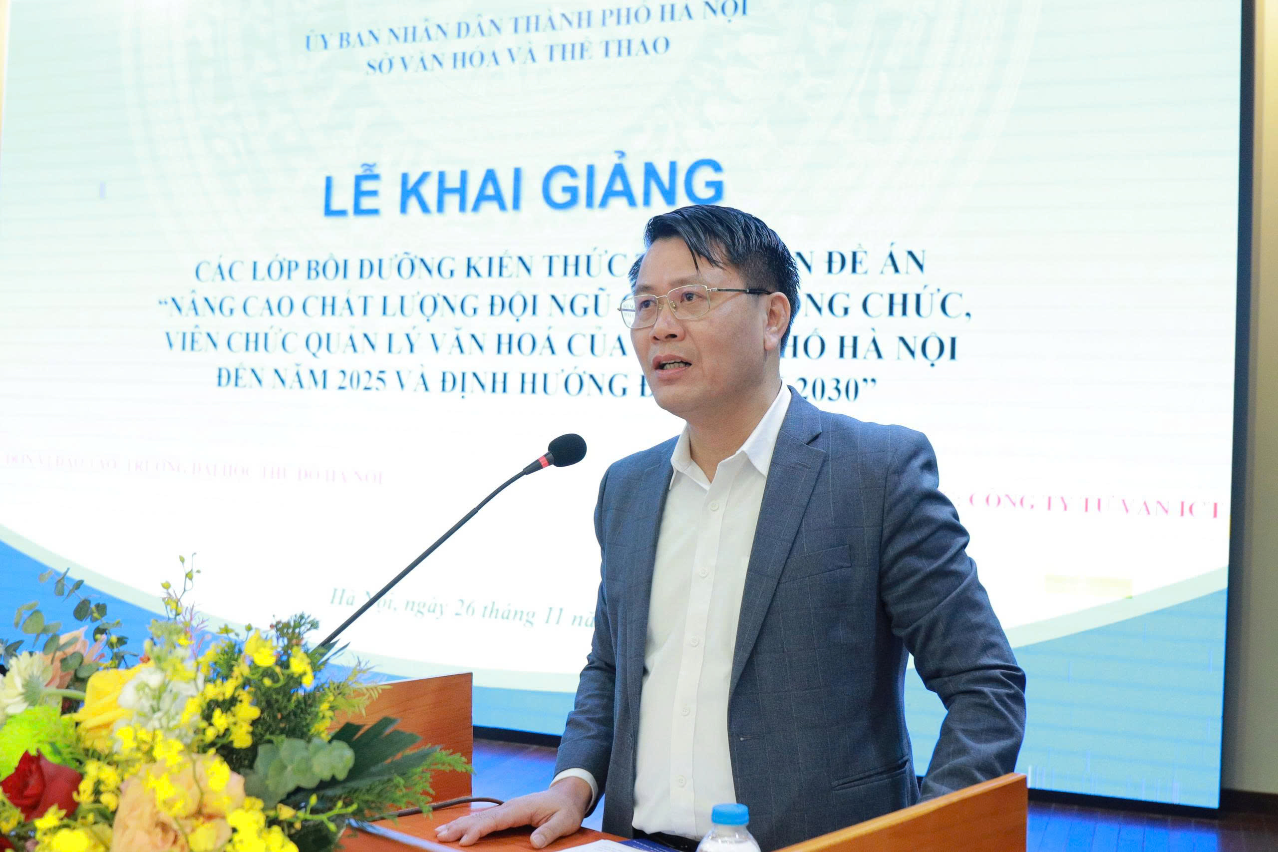 Phát biểu khai giảng, PGS.TS. Nguyễn Văn Tuân, Phó Hiệu trưởng Trường Đại học Thủ đô Hà Nội nhấn mạnh vai trò then chốt của đội ngũ cán bộ văn hóa trong bối cảnh Hà Nội đang tích cực triển khai các nhiệm vụ lớn của Thành phố như Chương trình 06-CTr/TU, xây dựng Thành phố sáng tạo và phát triển công nghiệp văn hóa. Phó Hiệu trưởng khẳng định văn hóa vừa là nền tảng tinh thần, vừa là động lực nội sinh của sự phát triển Thủ đô. Vì vậy, đội ngũ cán bộ văn hóa cần không chỉ nắm chắc tri thức về truyền thống, di sản và đời sống đô thị, mà còn phải thành thạo công nghệ số, phương pháp quản trị hiện đại, truyền thông số, kỹ năng tổ chức sự kiện và khả năng phối hợp liên ngành trong phát triển văn hóa – du lịch – công nghiệp sáng tạo. Điều này chính là mục tiêu trọng tâm của Đề án “Nâng cao chất lượng đội ngũ cán bộ quản lý văn hóa Thành phố Hà Nội đến năm 2025, định hướng đến năm 2030”. Phó Hiệu trưởng cũng khẳng định Trường Đại học Thủ đô Hà Nội vinh dự được Thành phố giao trọng trách là đơn vị đào tạo nòng cốt và Nhà trường cam kết huy động đội ngũ chuyên gia uy tín, chương trình hiện đại, phương pháp giảng dạy tích cực để đảm bảo chất lượng các khóa bồi dưỡng.