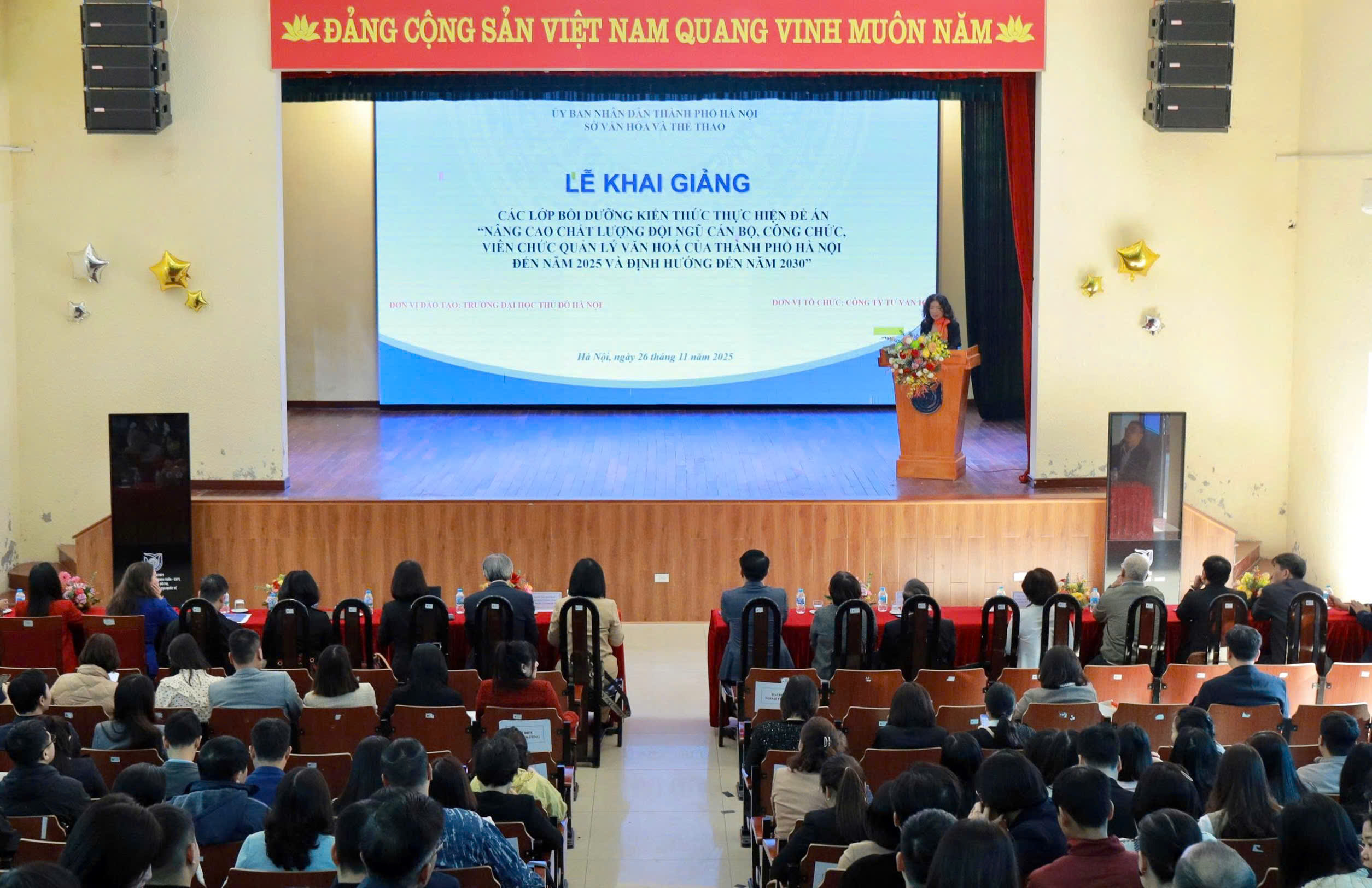 Sáng ngày 26/11, Trường Đại học Thủ đô Hà Nội long trọng tổ chức Lễ khai giảng các lớp bồi dưỡng trong nước năm 2025, thuộc Đề án “Nâng cao chất lượng đội ngũ cán bộ, công chức, viên chức quản lý văn hóa của thành phố Hà Nội đến năm 2025, định hướng đến năm 2030”. Chương trình được tổ chức theo kế hoạch của Sở Văn hóa và Thể thao Hà Nội nhằm triển khai hiệu quả các nhiệm vụ đã được UBND Thành phố phê duyệt trong Đề án số 5673/QĐ-UBND.