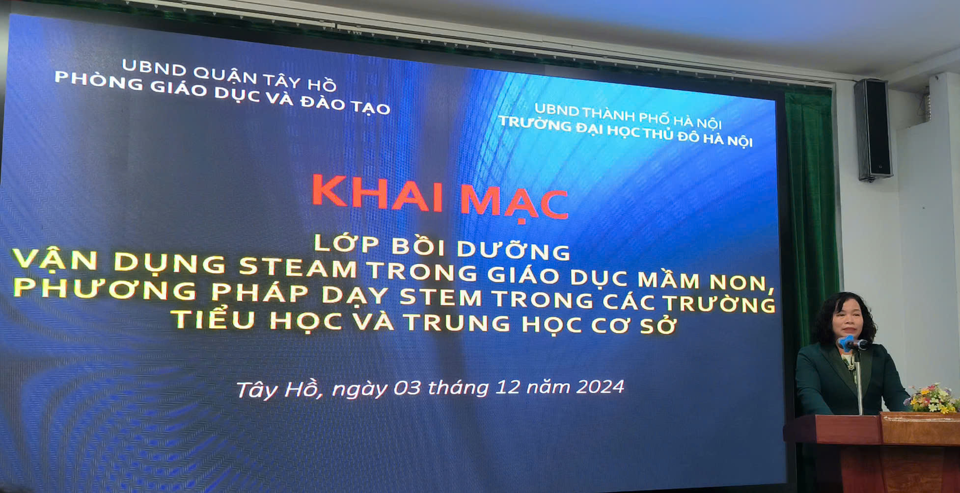 Chiều 3/12, Trường Đại học Thủ đô Hà Nội phối hợp Phòng Giáo dục và Đào tạo quận Tây Hồ đã tổ chức khai giảng khóa “Bồi dưỡng vận dụng STEAM trong Giáo dục Mầm non và phương pháp dạy STEM trong các trường Tiểu học và Trung học cơ sở”. Dự chương trình khai giảng có bà Trần Thị Hương, Trưởng phòng Phòng Giáo dục và Đào tạo quận Tây Hồ; TS. Bùi Quốc Hoàn, Phó Hiệu trưởng Trường Đại học Thủ đô Hà Nội; ThS. Phạm Ngọc Bằng, Phó Giám đốc phụ trách TT Bồi dưỡng nghề nghiệp và Đánh giá năng lực cùng cán bộ, giảng viên và giáo viên quận Tây Hồ.