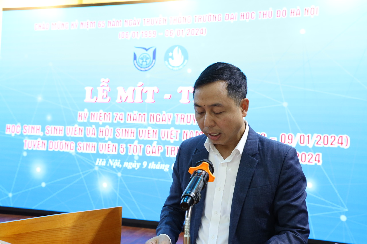 Phát biểu tại buổi lễ, đồng chí Trần Hoàng Anh - Chánh Văn phòng Hội Sinh viên Thành phố Hà Nội đã chúc mừng tới Đảng ủy, Ban Giám hiệu Nhà trường và thành tích của Hội Sinh viên Trường về phong trào “sinh viên 5 tốt”. Đồng chí Trần Hoàng Anh nhấn mạnh, Đại học Thủ đô Hà Nội là một ngôi trường có bề dày truyền thống đào tạo chuyên môn cũng như trang bị các kĩ năng mềm cho sinh viên, phát huy thế mạnh đó, các thế hệ sinh viên của Nhà trường hãy tiếp tục viết tiếp truyền thống vẻ vang và trở thành những công dân toàn cầu, có tri thức, đạo đức và khả năng hội nhập.