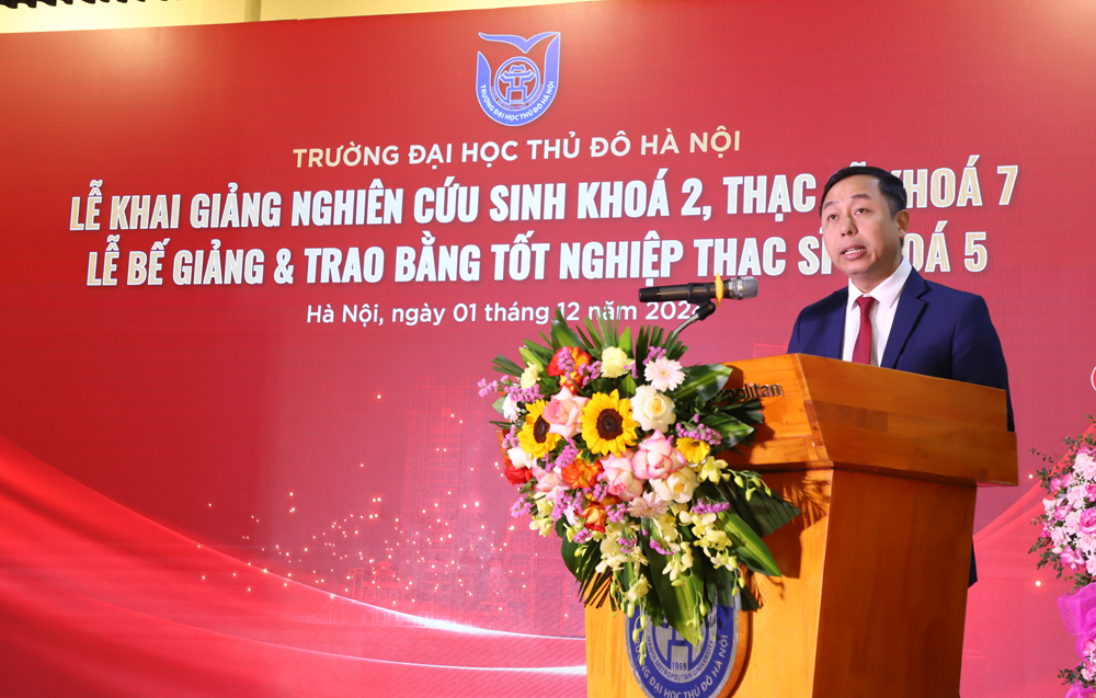 Phát biểu tại buổi lễ, PGS.TS Đỗ Hồng Cường, Hiệu trưởng Trường Đại học Thủ đô Hà Nội vui mừng chia sẻ, trong lễ Khai giảng nghiên cứu sinh khóa 2, thạc sĩ khóa 7; lễ bế giảng và trao Bằng tốt nghiệp thạc sĩ khóa 5, trường có 09 nghiên cứu sinh và 210 học viên cao học; 150 học viên cao học tốt nghiệp. Trong đó hơn 30 bài báo khoa học của học viên đã được công bố trên các tạp chí chuyên ngành.Kết quả này đã thể hiện sự tin tưởng của các thí sinh lựa chọn Trường Đại học Thủ đô Hà Nội là nơi tiếp tục con đường học tập và nghiên cứu, nâng cao trình độ chuyên môn của mình và hơn thế nữa chất lượng đầu vào của các thí sinh năm nay được các thành viên Hội đồng tuyển sinh đánh giá rất cao.
