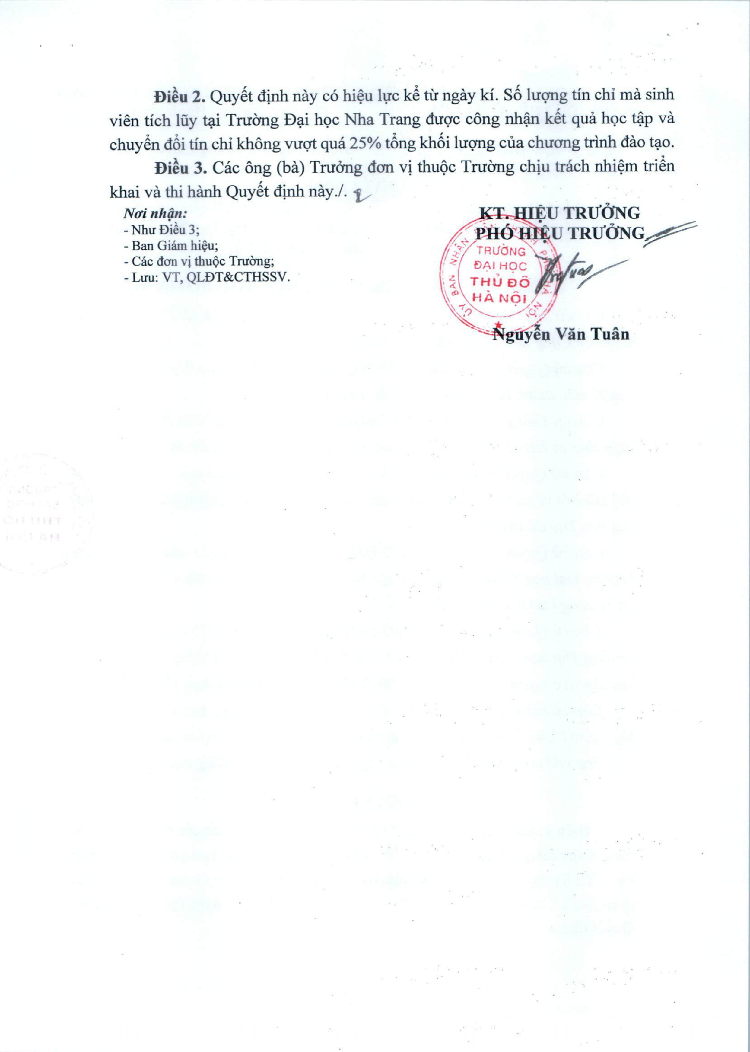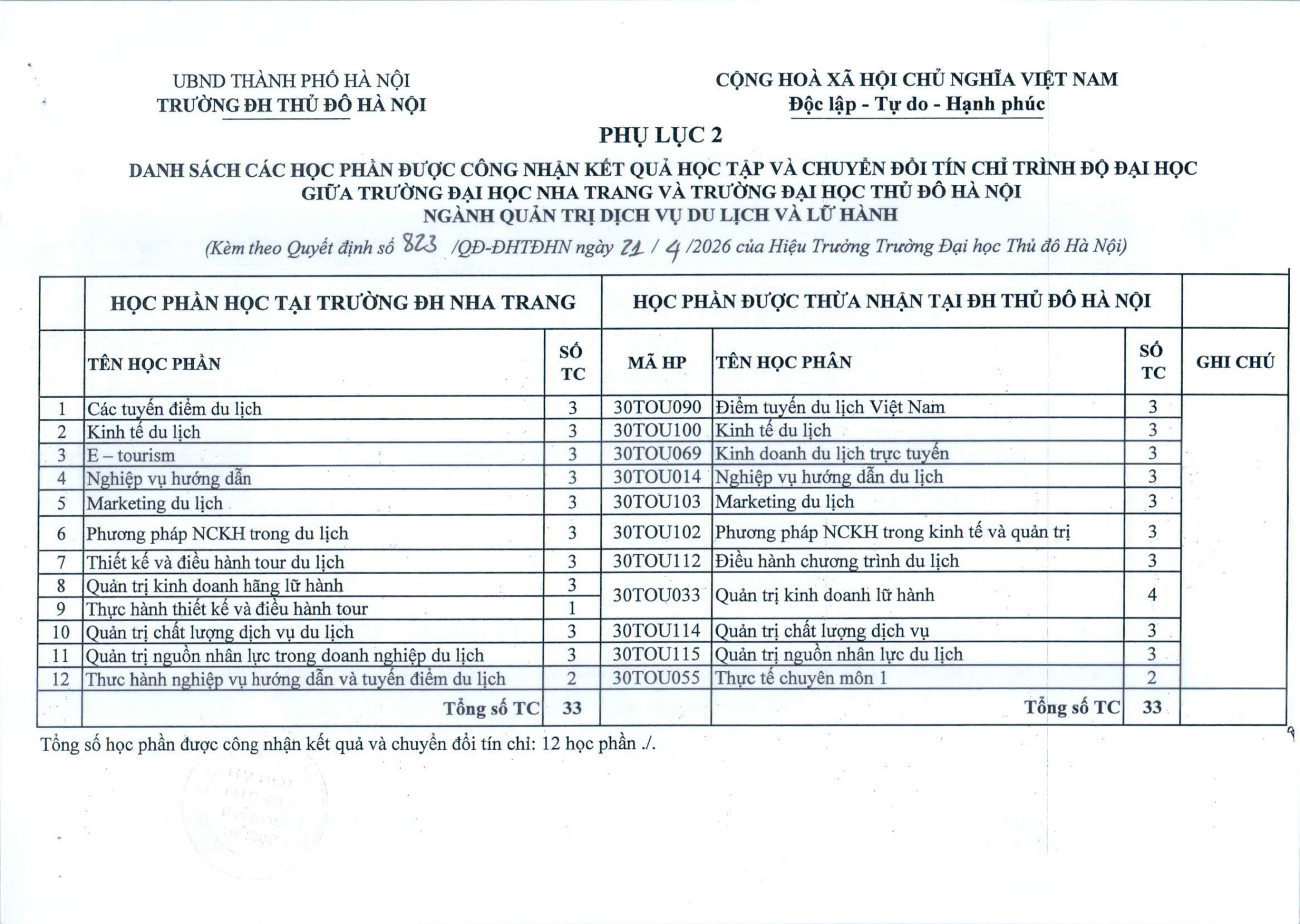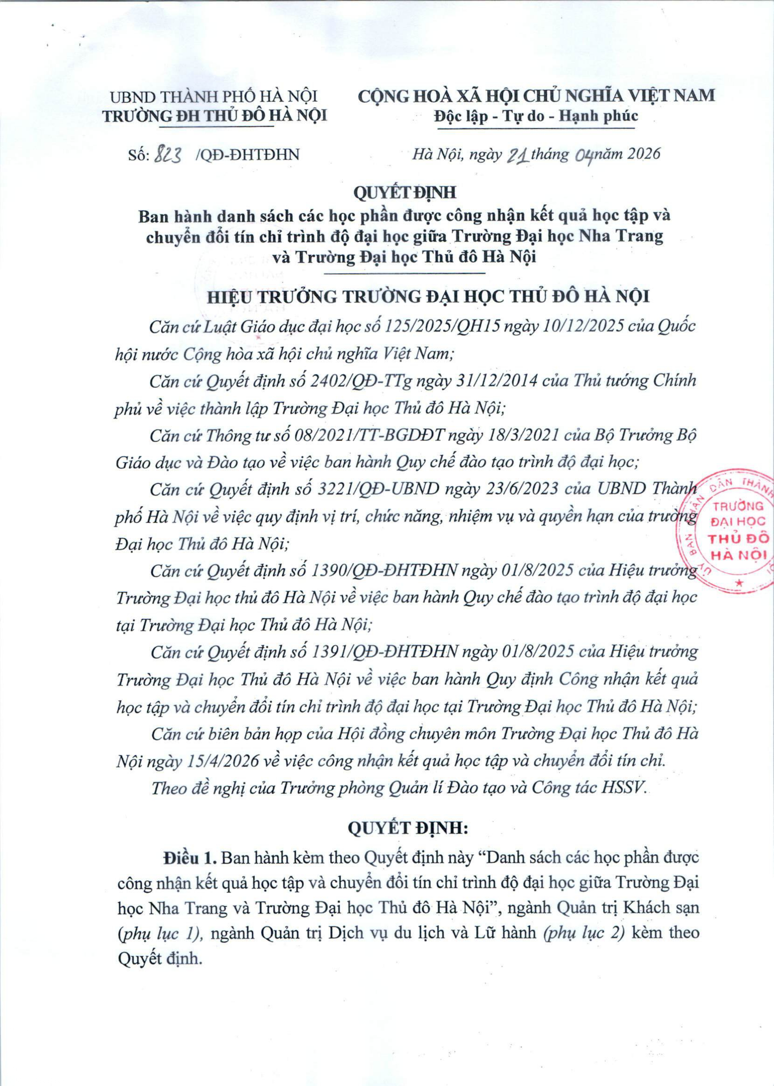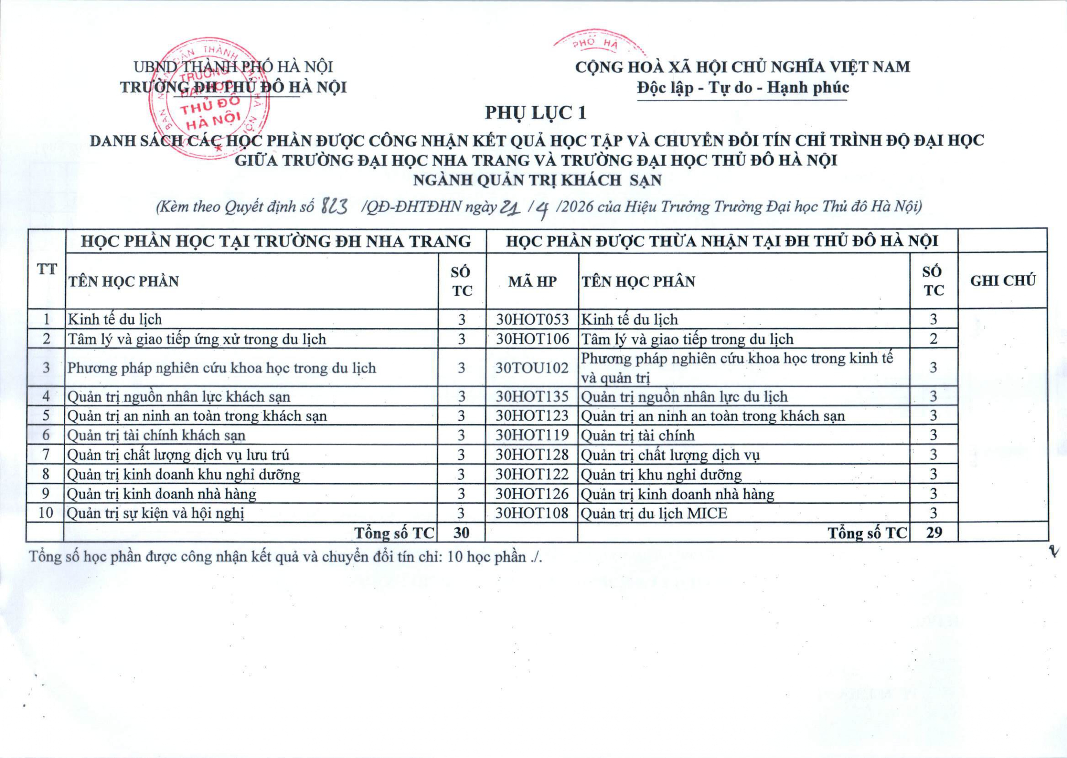Quyết định ban hành danh sách các học phần được công nhận kết quả học tập và chuyển đổi tín chỉ trình độ đại học giữa Trường Đại học Nha Trang và Trường Đại học Thủ đô Hà Nội