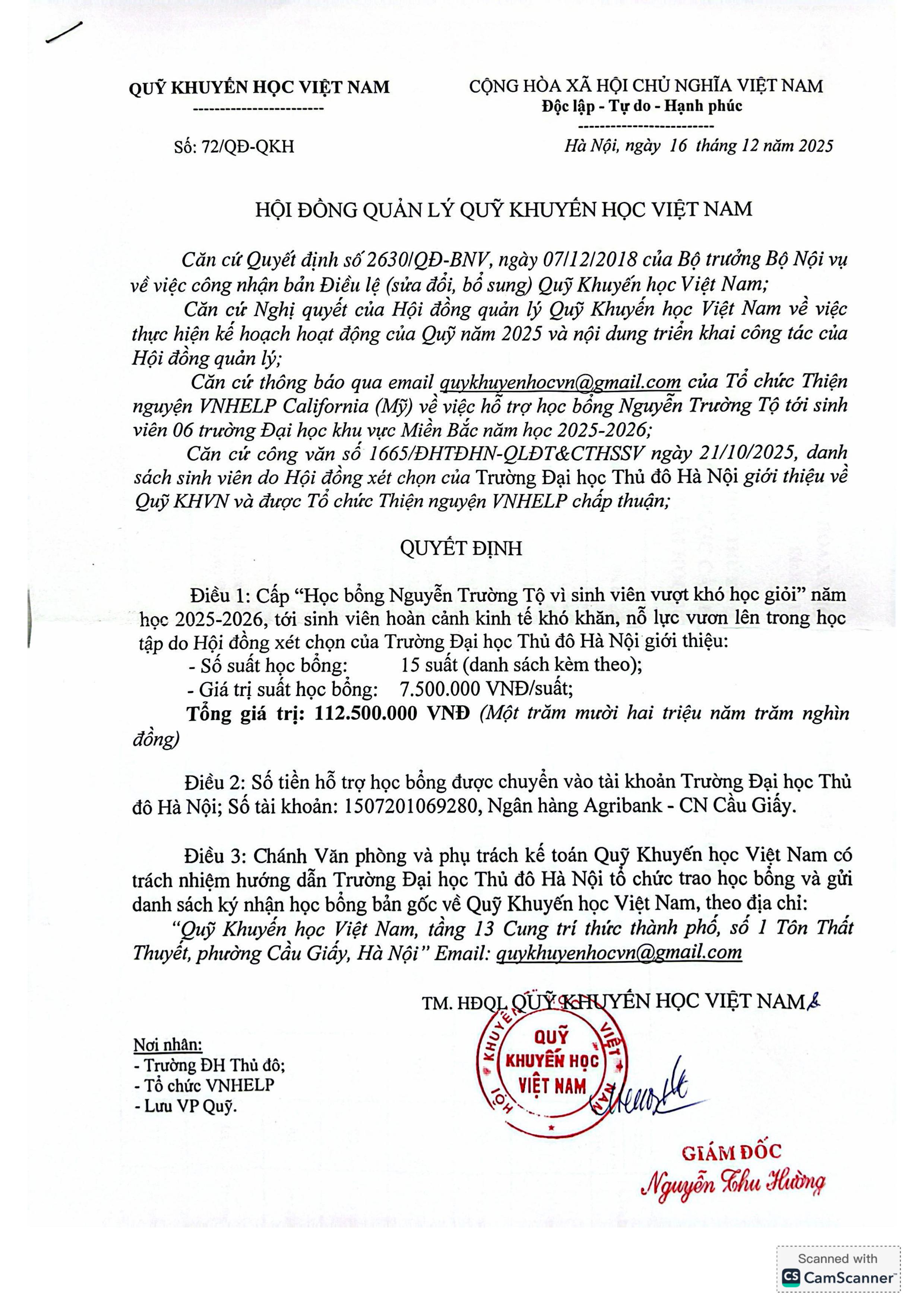 Quyết định cấp học bổng trường Nguyễn Trường Tộ năm 2025 - 2026