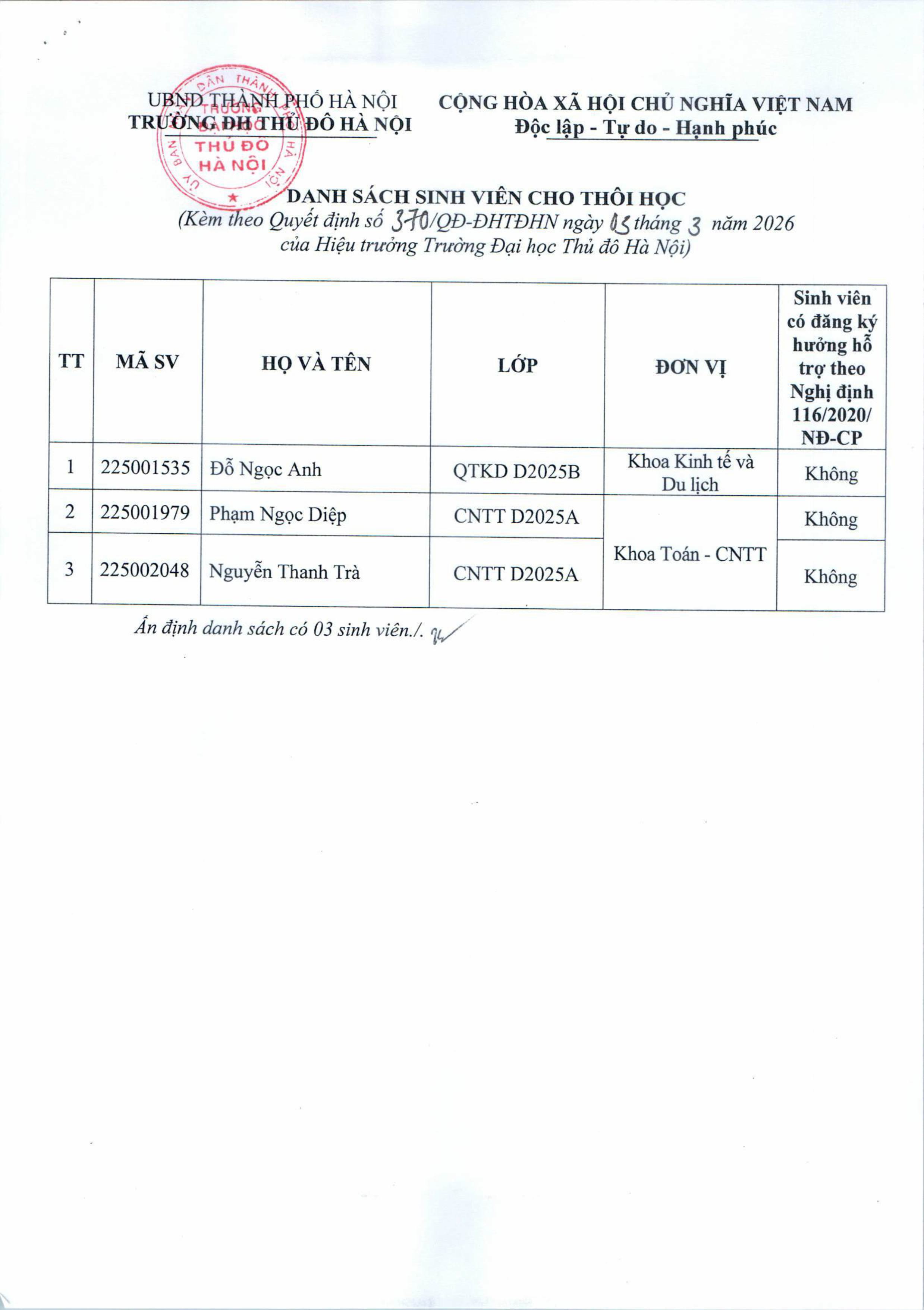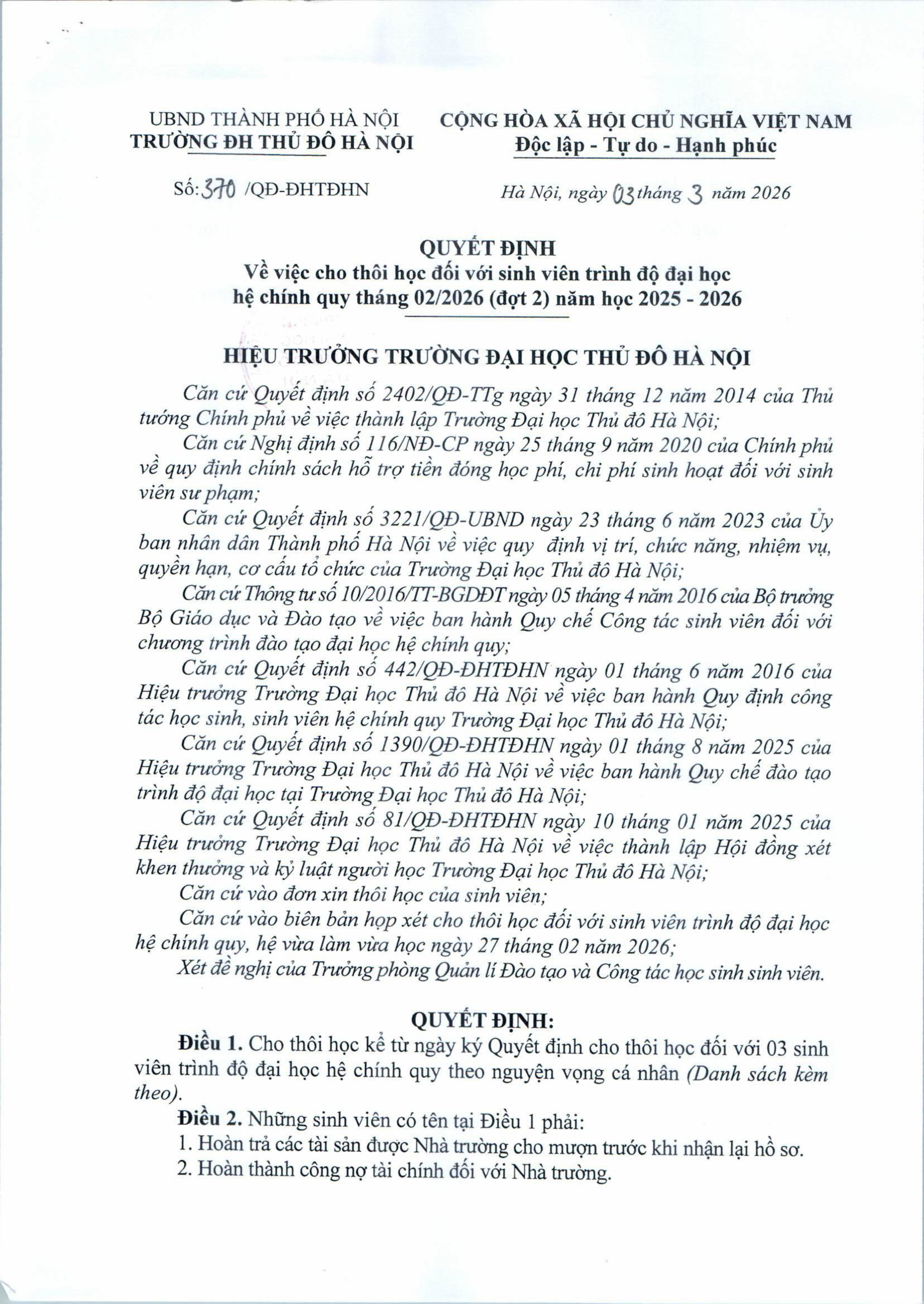 Quyết định cho thôi học đối với sinh viên trình độ đại học hệ chính quy tháng 02/2026 (đợt 2) năm học 2025 - 2026