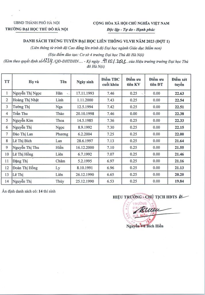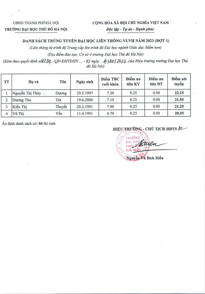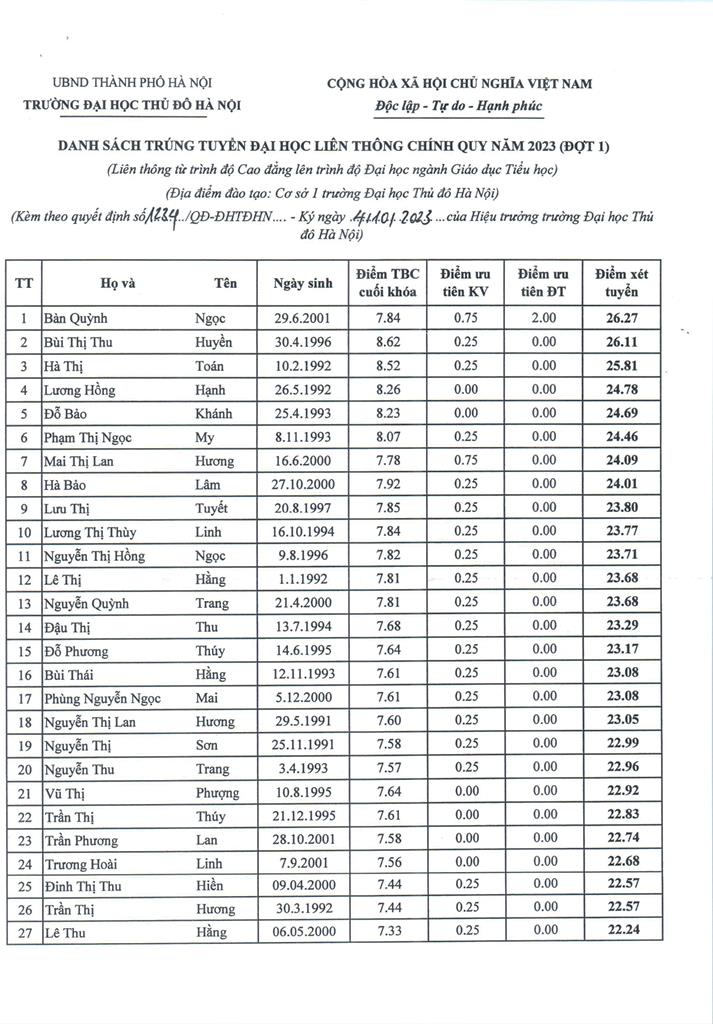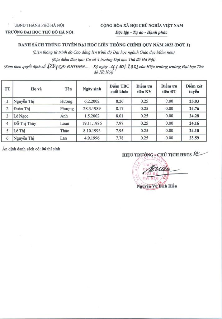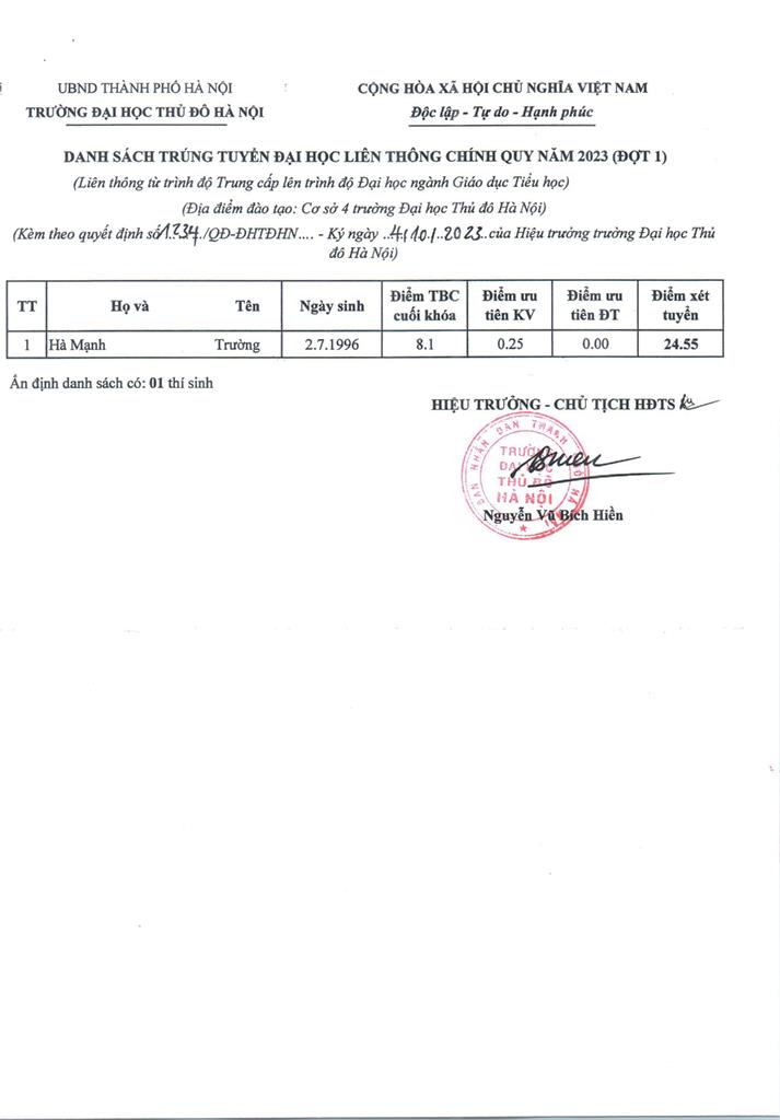 Quyết định công bố công nhận thí sinh trúng tuyển trình độ Đai học liên thông chính quy và vừa làm vừa học đối tượng tốt nghiệp từ Trung cấp trở lên năm 2023