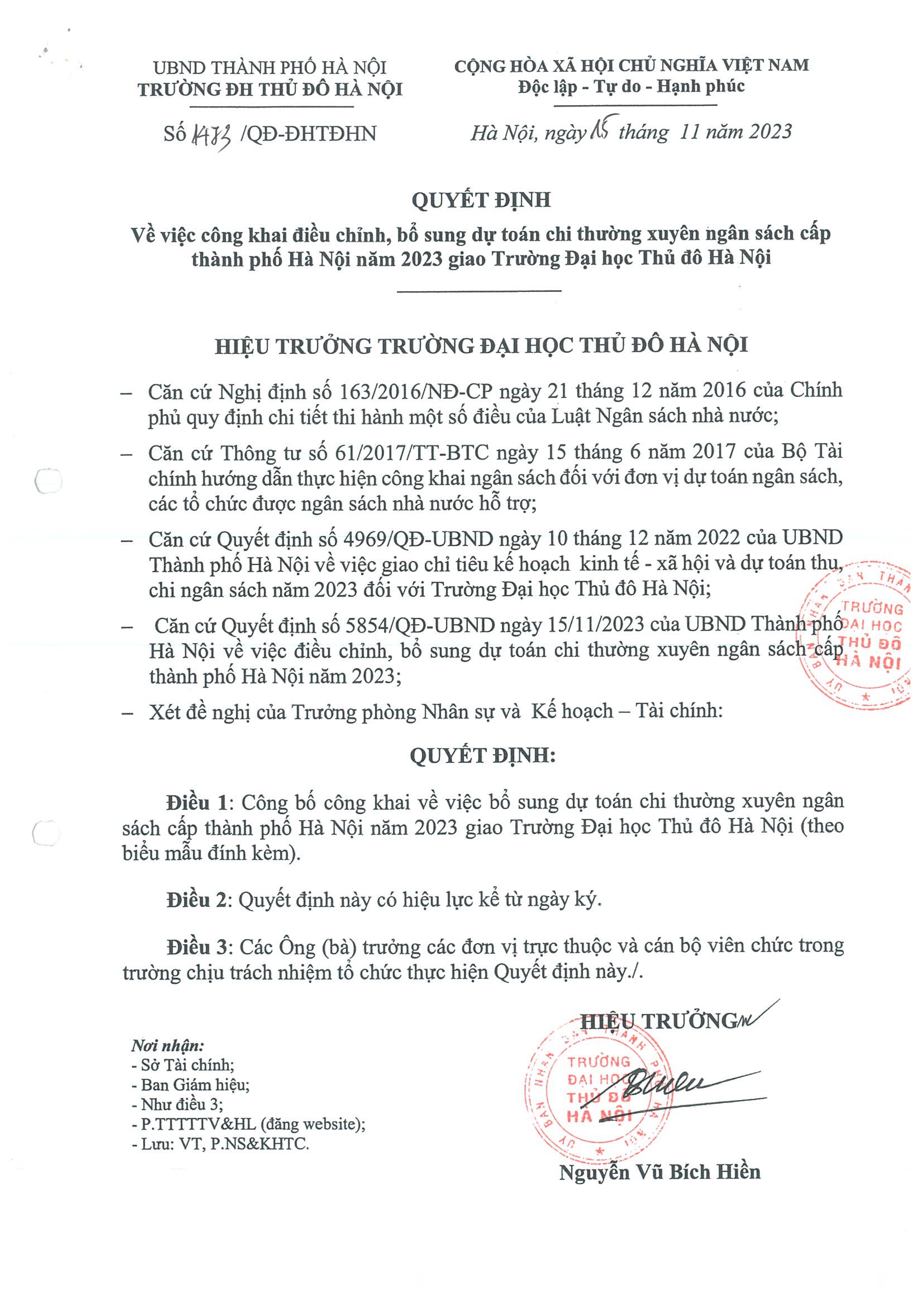 Quyết định công khai điều chỉnh, bổ sung dự toán chi thường xuyên ngân sách cấp thành phố Hà Nội năm 2023 giao cho trường Đại học Thủ đô Hà Nội