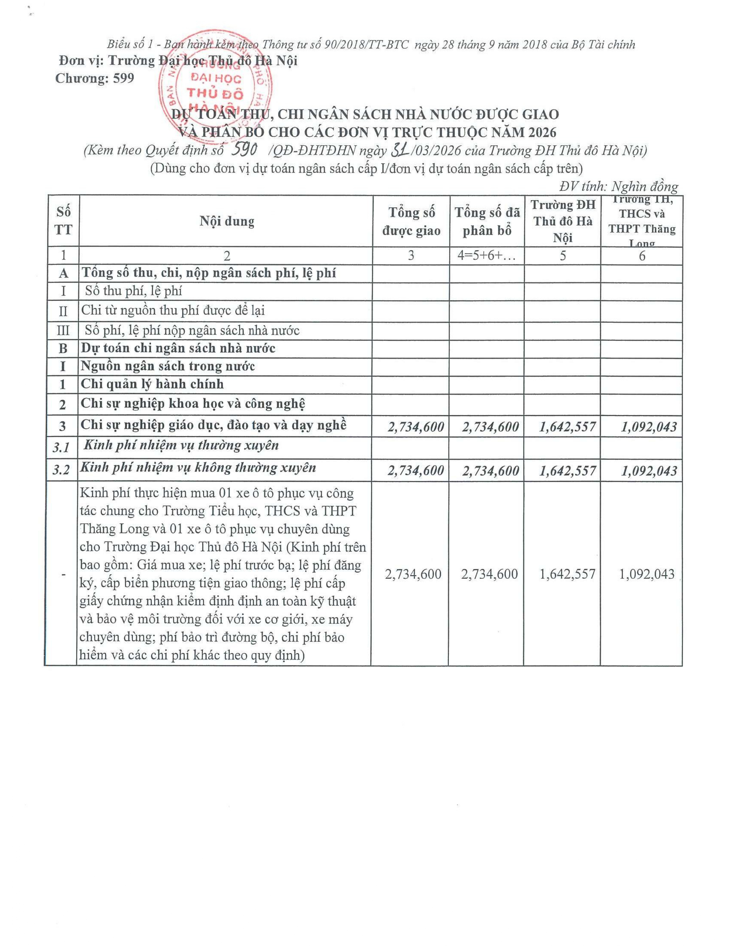 Quyết định công khai phân bổ và giao dự toán ngân sách nhà nước năm 2026 cho Trường Đại học Thủ đô Hà Nội