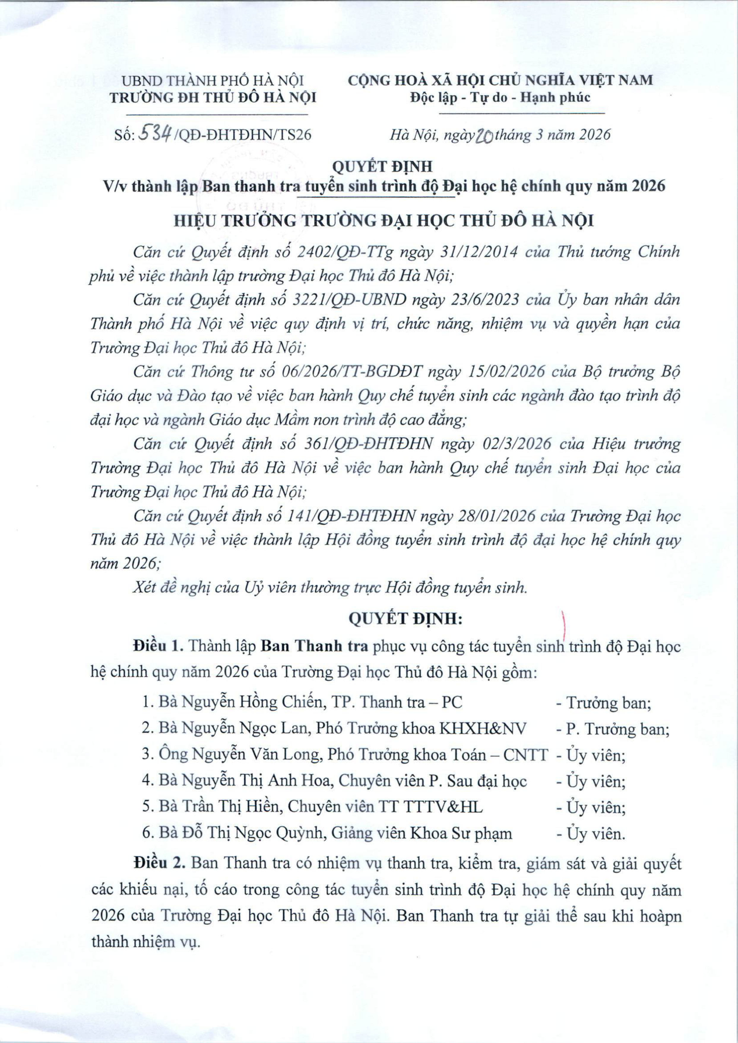 Quyết định thành lập Ban thanh tra tuyển sinh trình độ Đại học hệ chính quy năm 2026