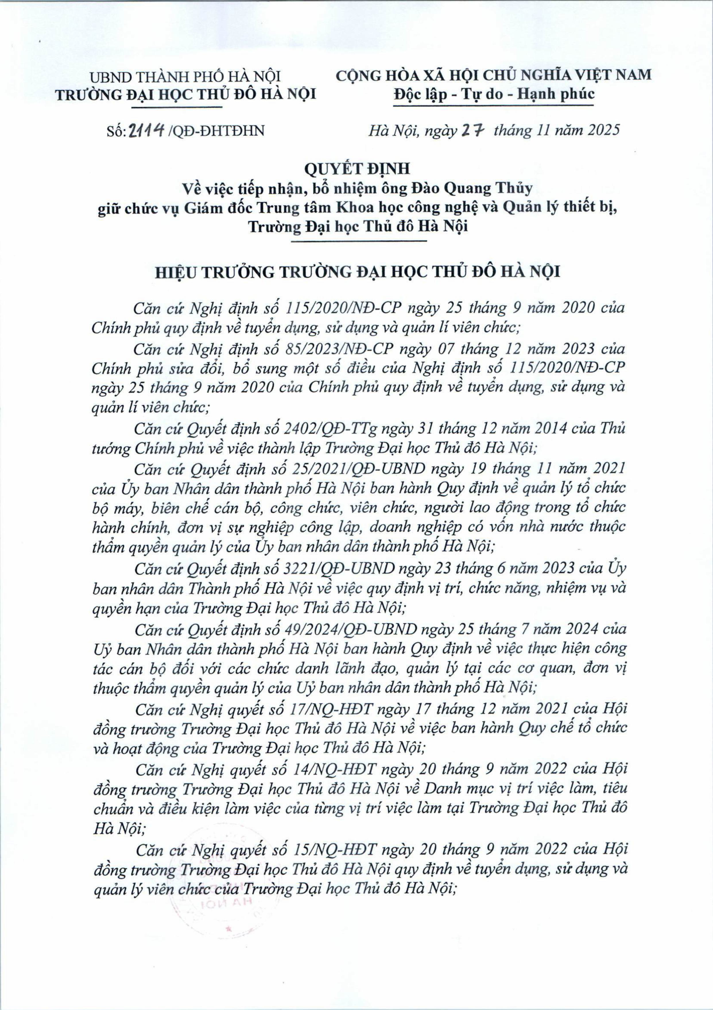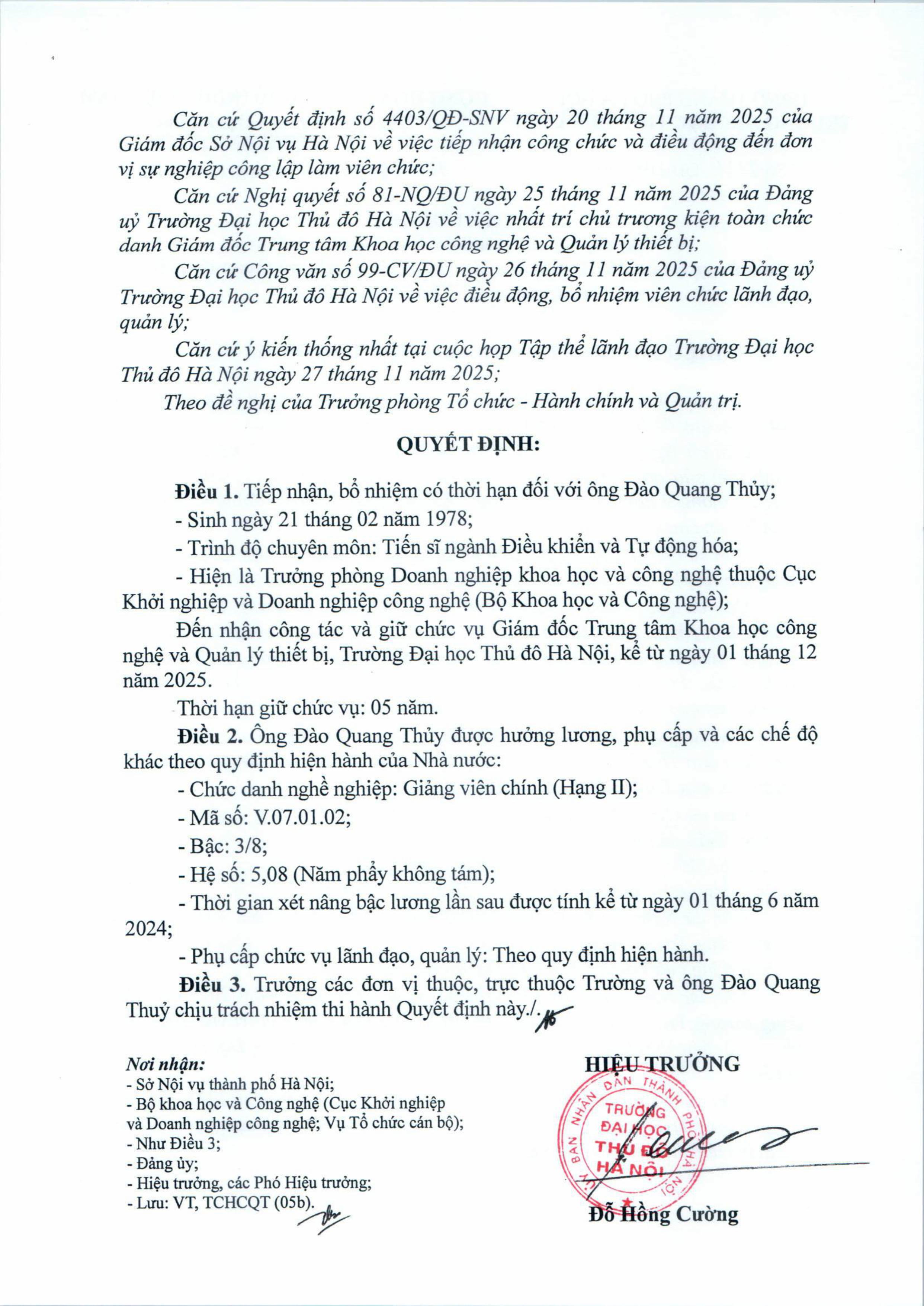 Quyết định tiếp nhận, bổ nhiệm ông Đào Quang Thủy giữ chúc vụ Giám đốc Trung tâm Khoa học công nghệ và Quản lí thiết bị