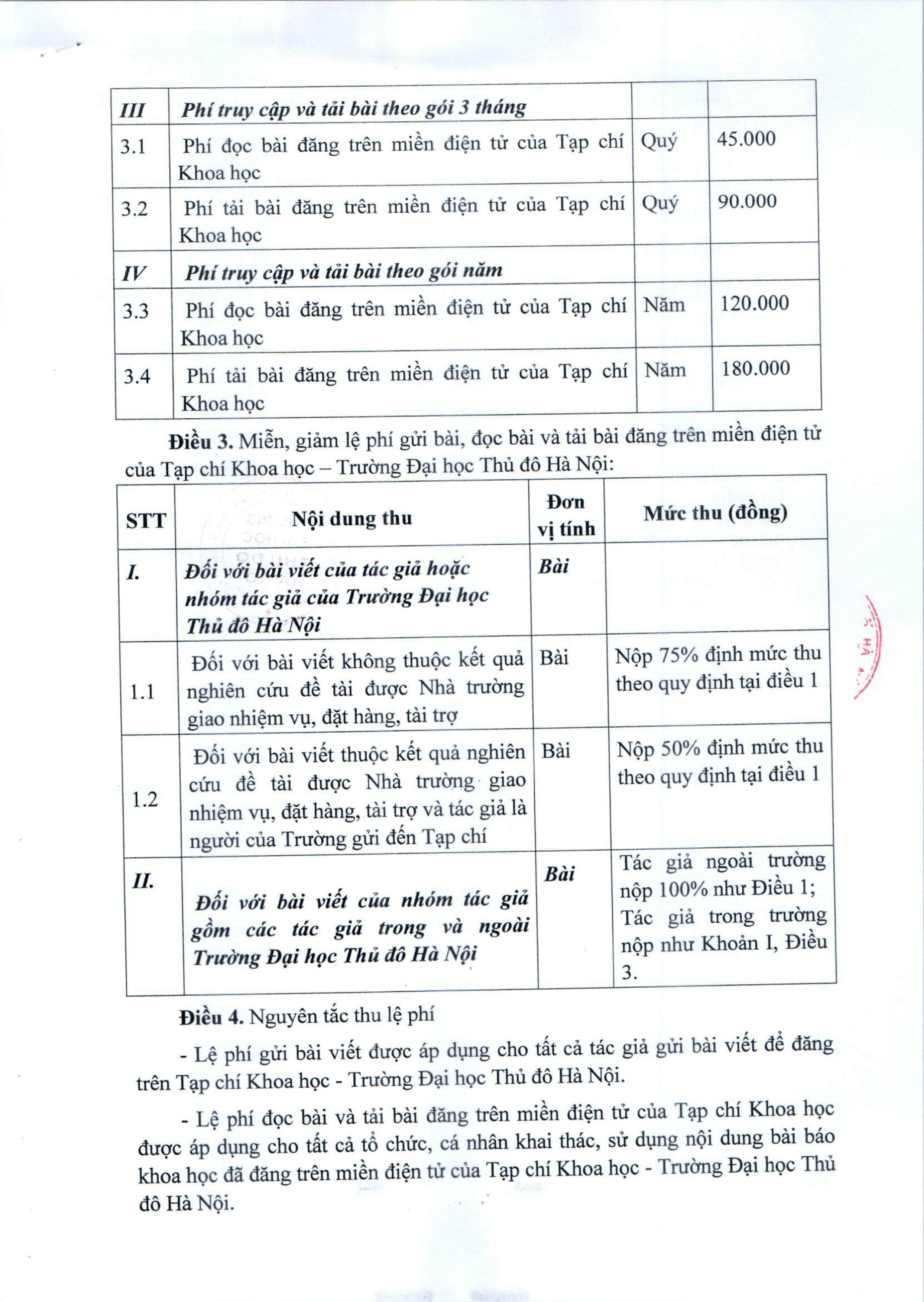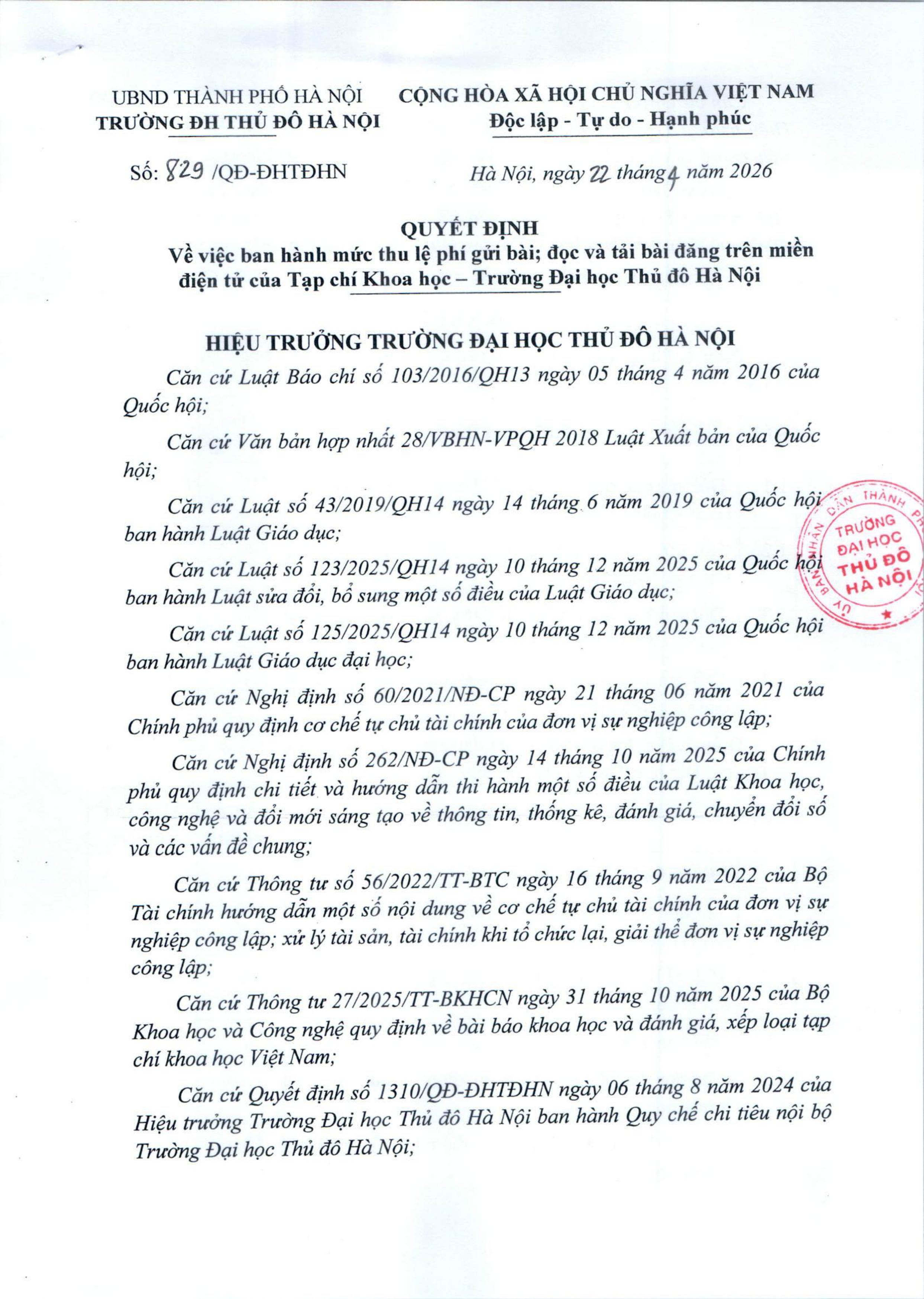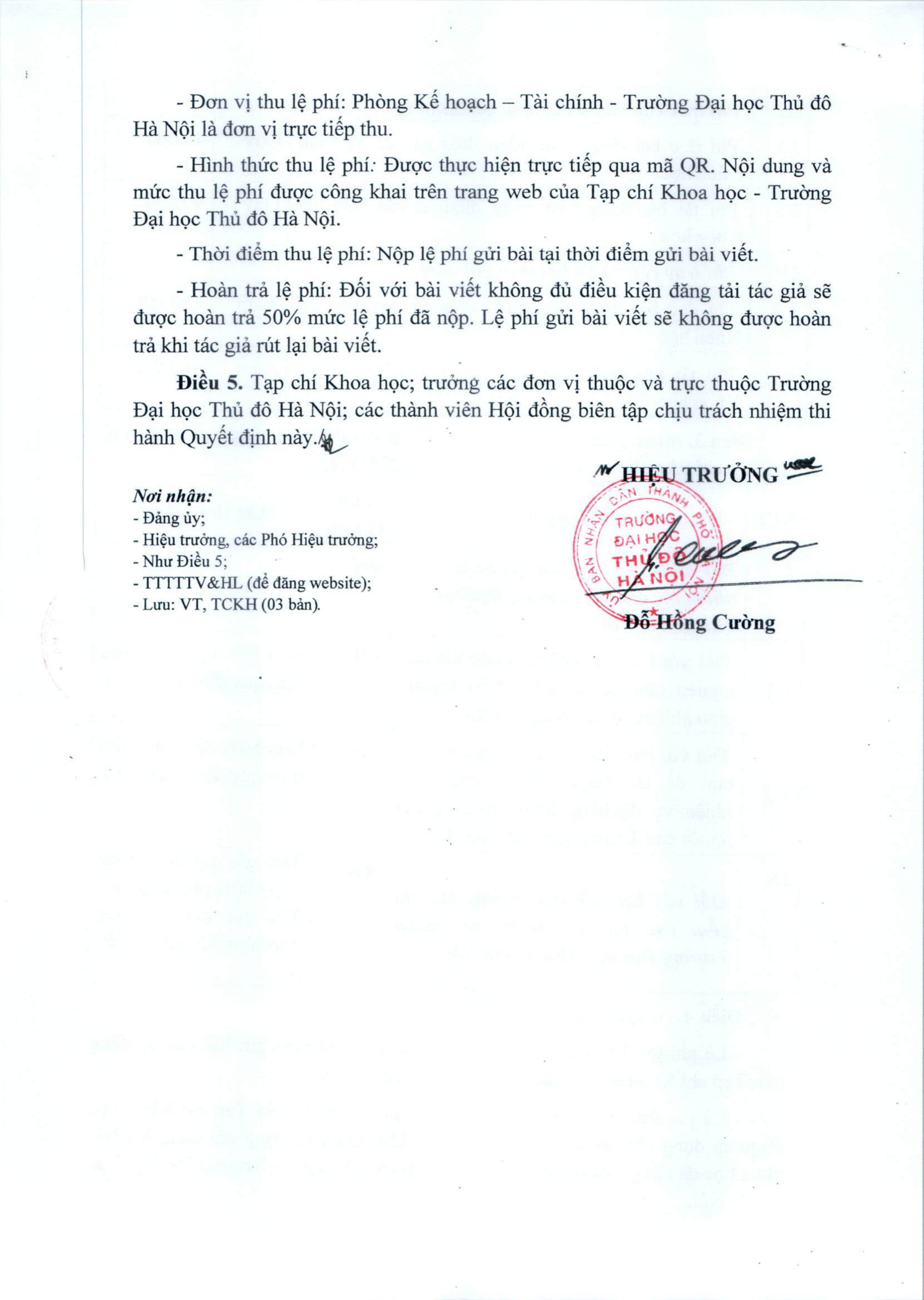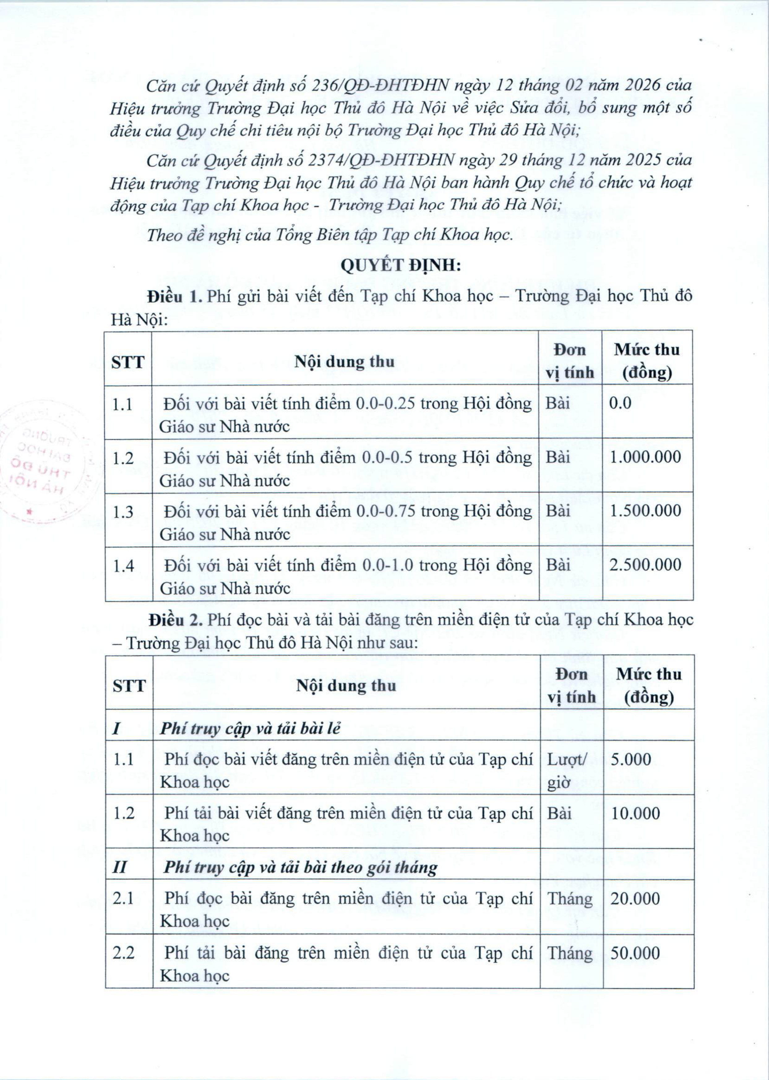 Quyết định về việc ban hành mức thu lệ phí gửi bài; đọc và tải bài đăng trên miền điện tử của Tạp chí Khoa học - Trường Đại học Thủ đô Hà Nội