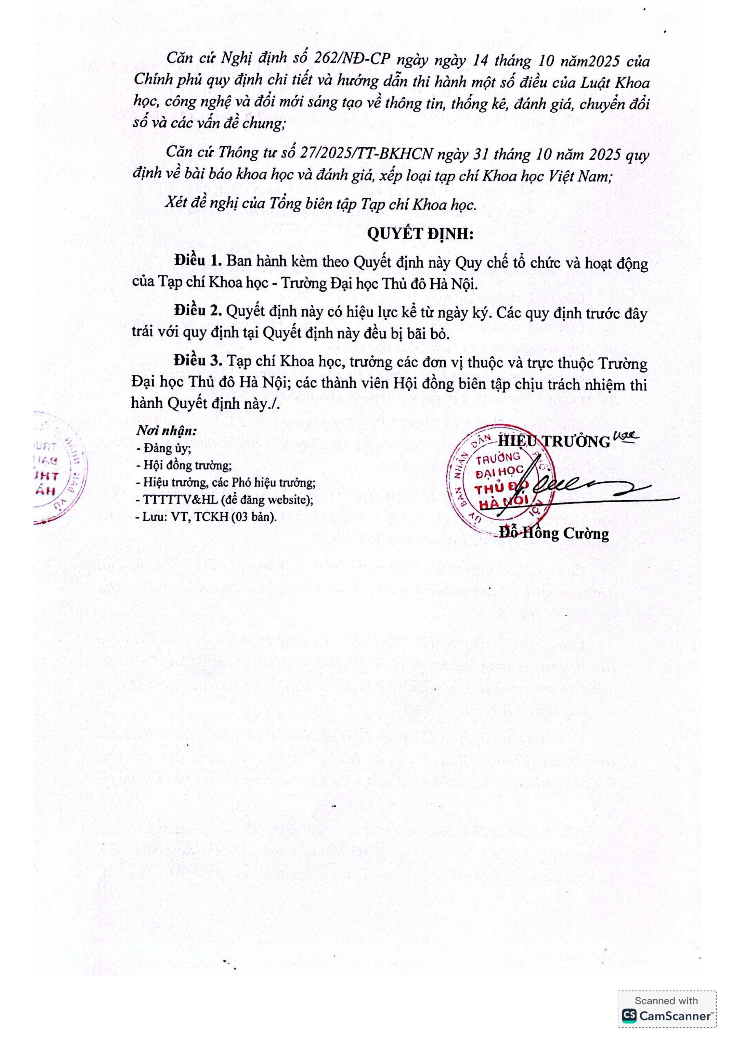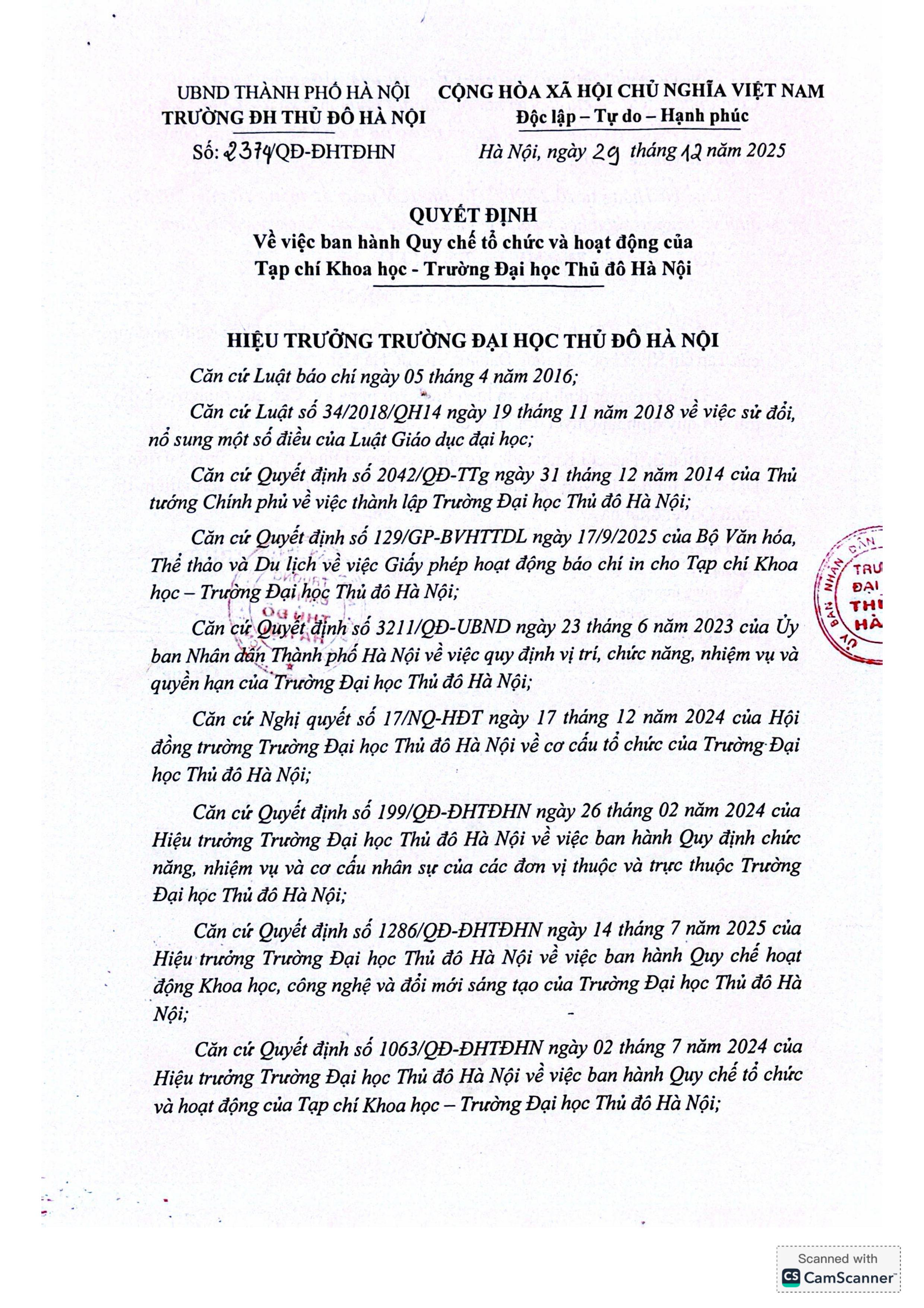Quyết định về việc ban hành Quy chế tổ chức và hoạt động của Tạp chí Khoa học - Trường Đại học Thủ đô Hà Nội