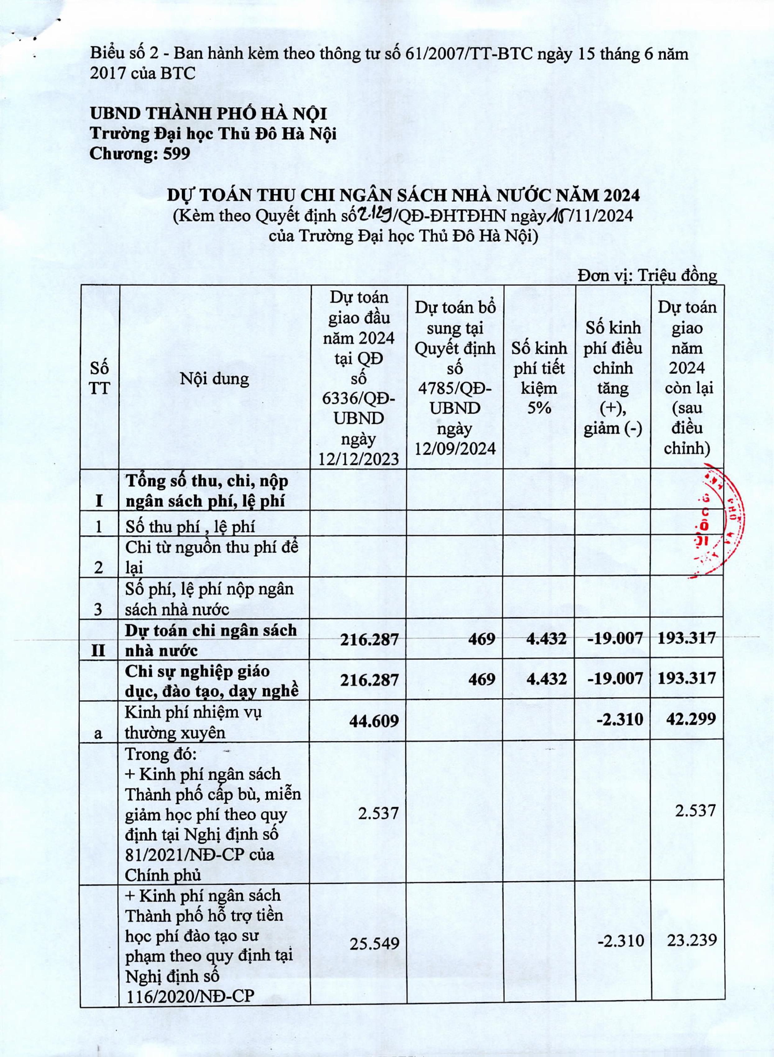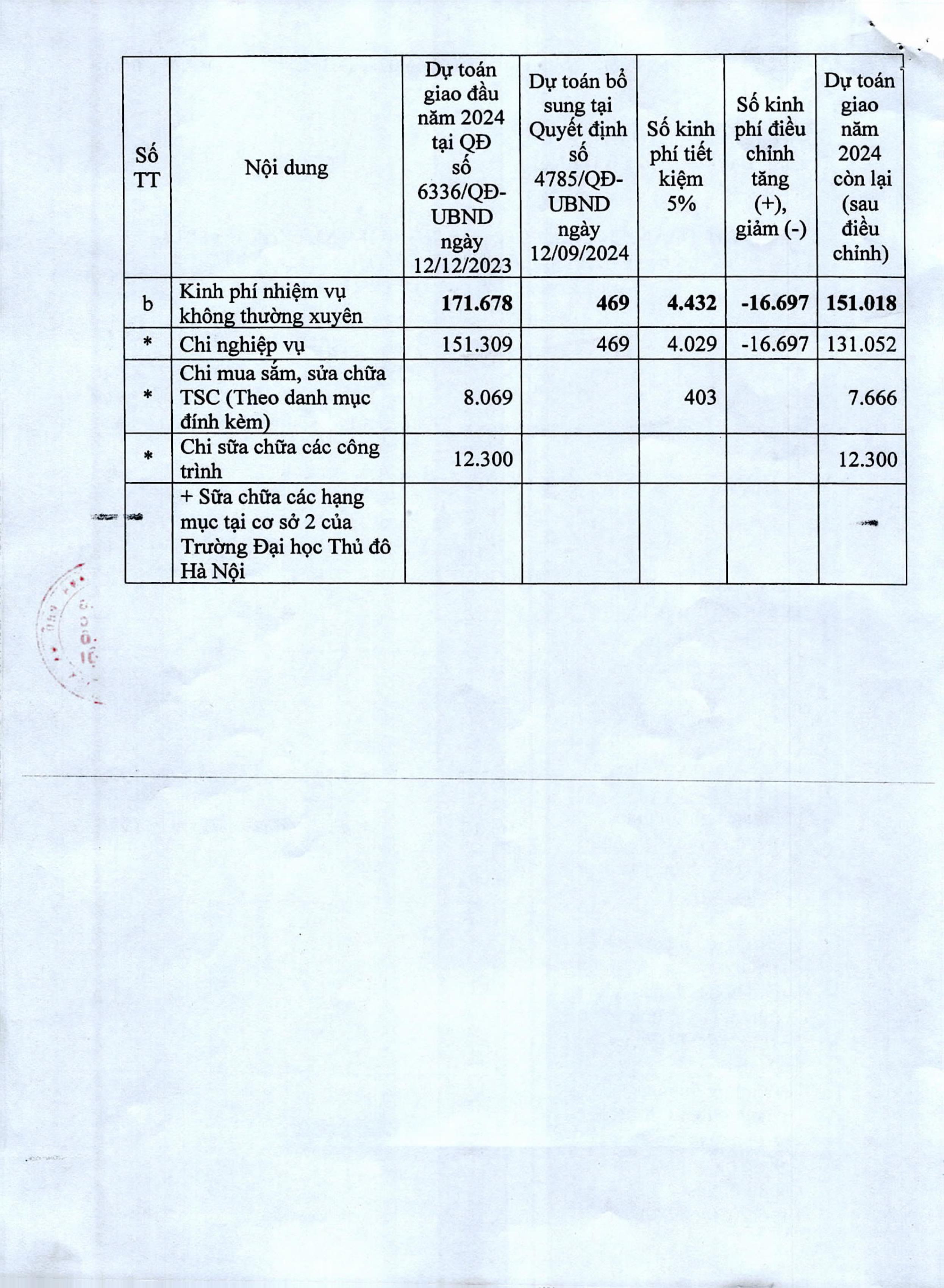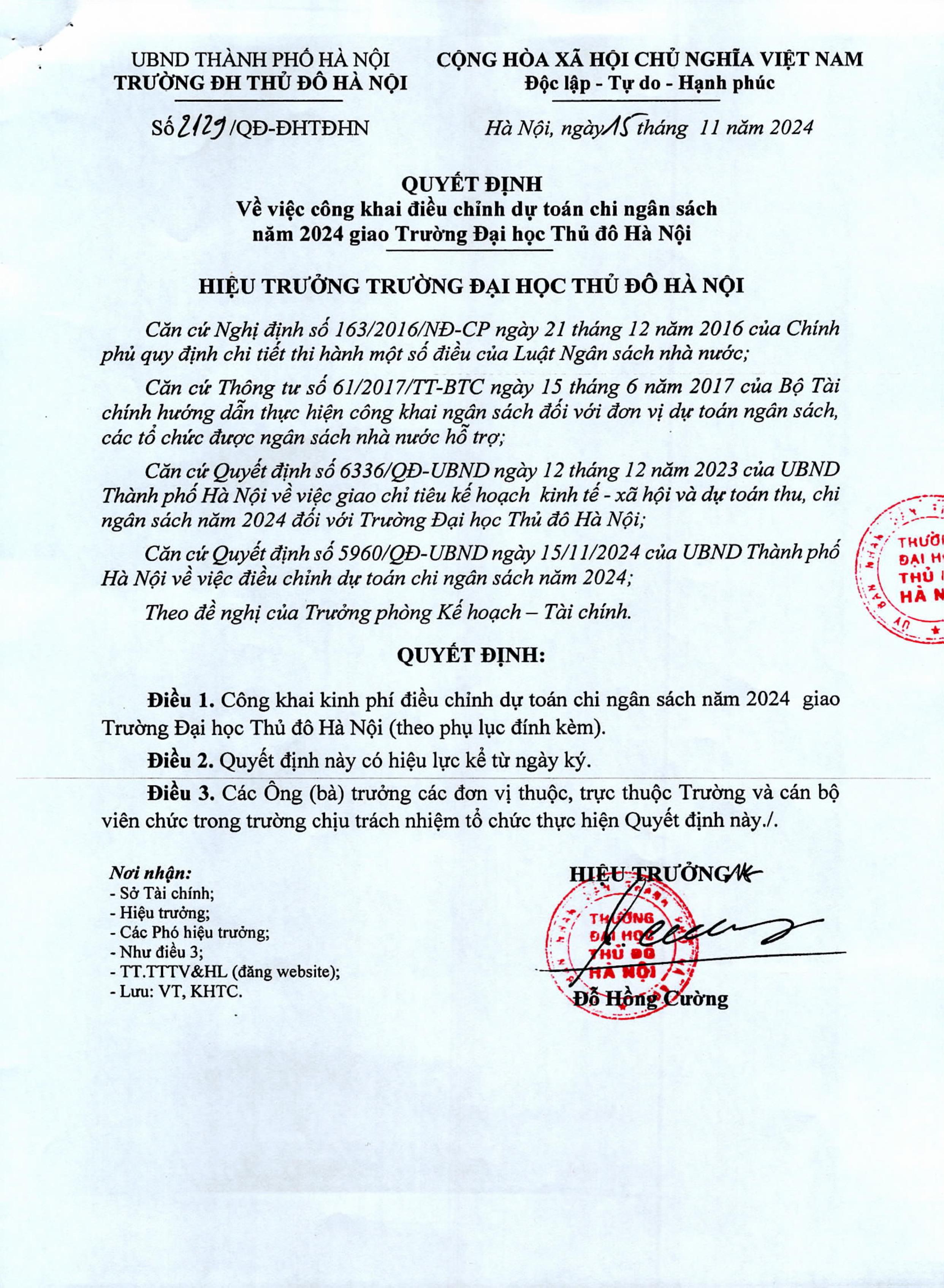 Quyết định về việc công khai điều chỉnh dự toán chi ngân sách năm 2024 giao Trường Đại học Thủ đô Hà Nội