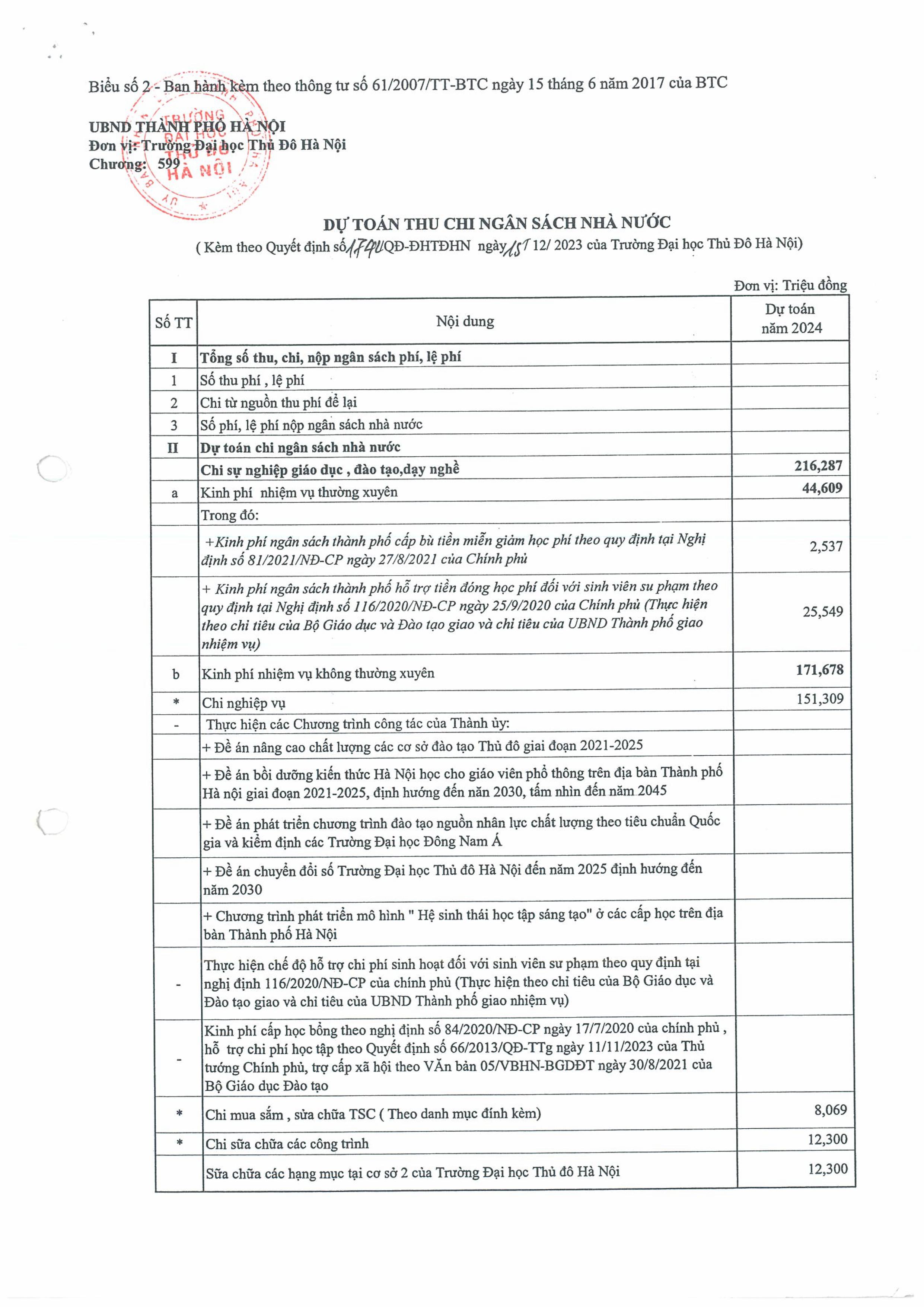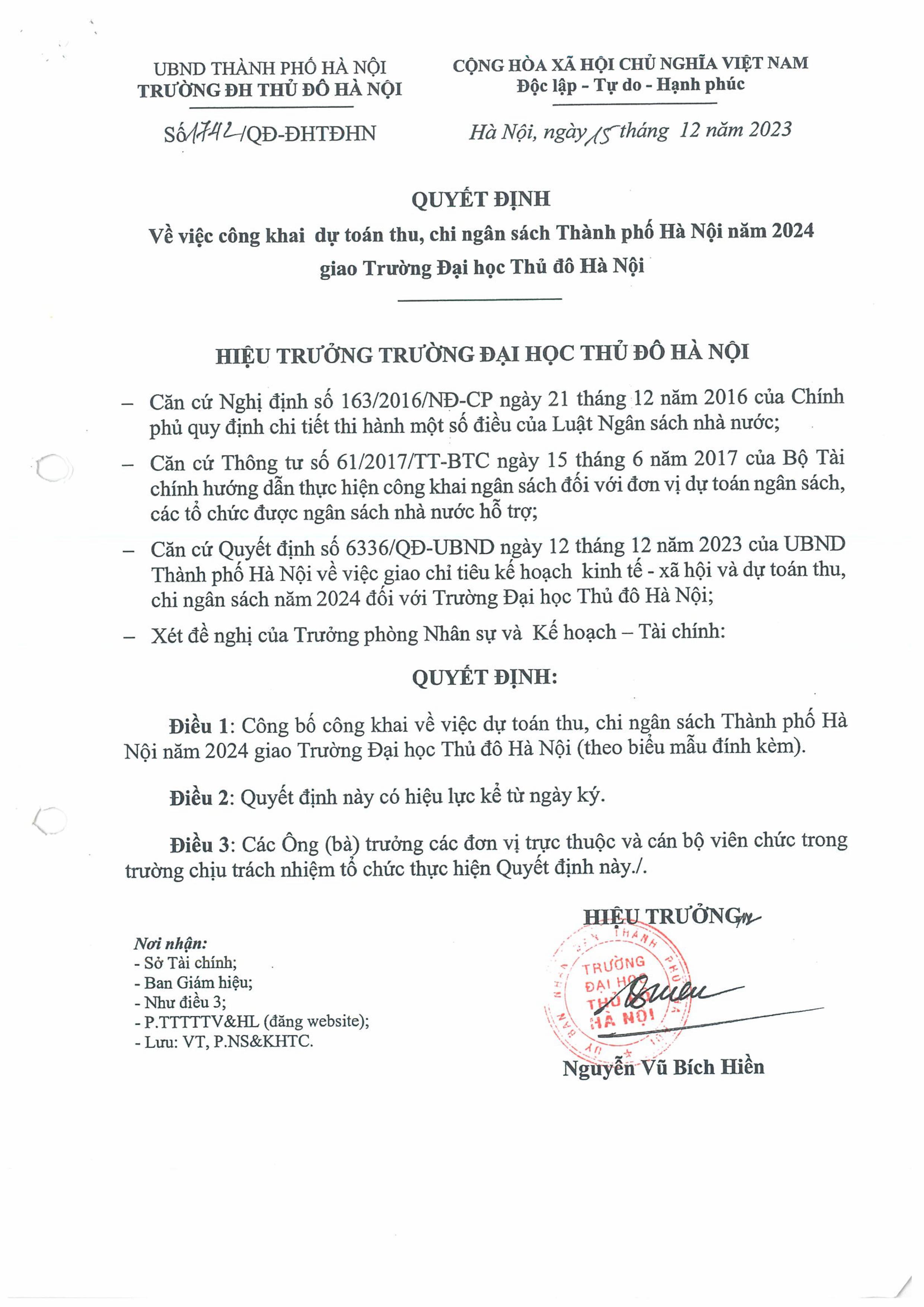Quyết định về việc công khai dự toán thu, chi ngân sách Thành phố Hà Nội năm 2024 giao Trường Đại học Thủ đô Hà Nội