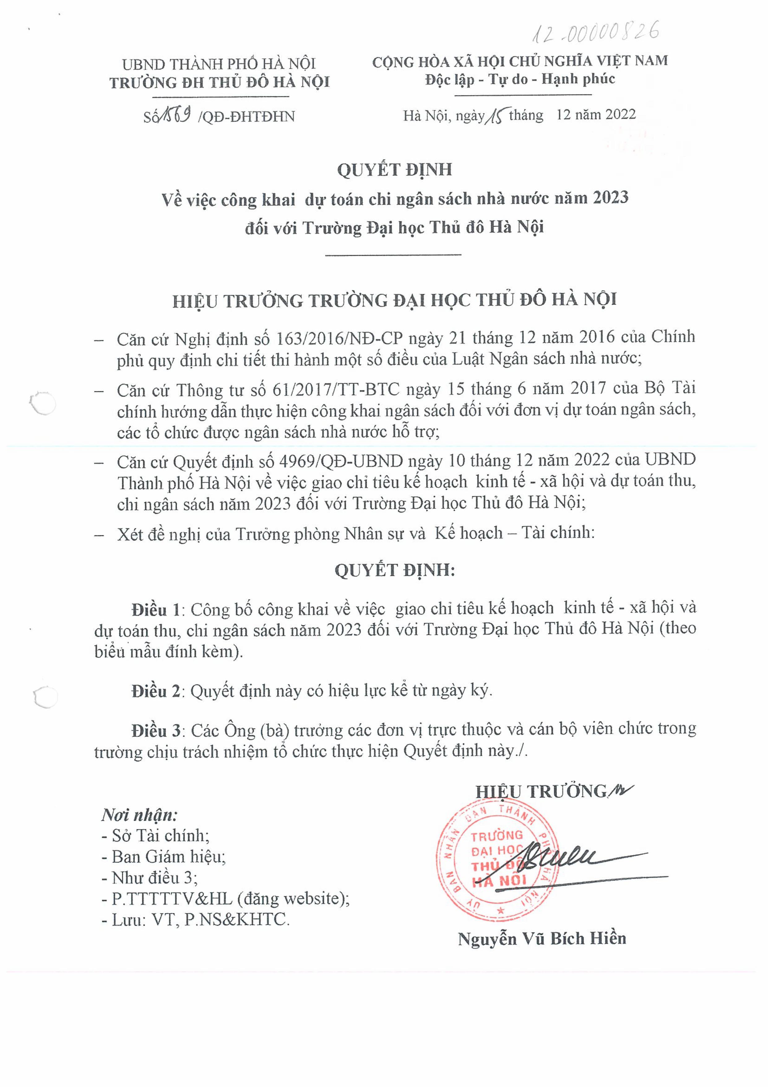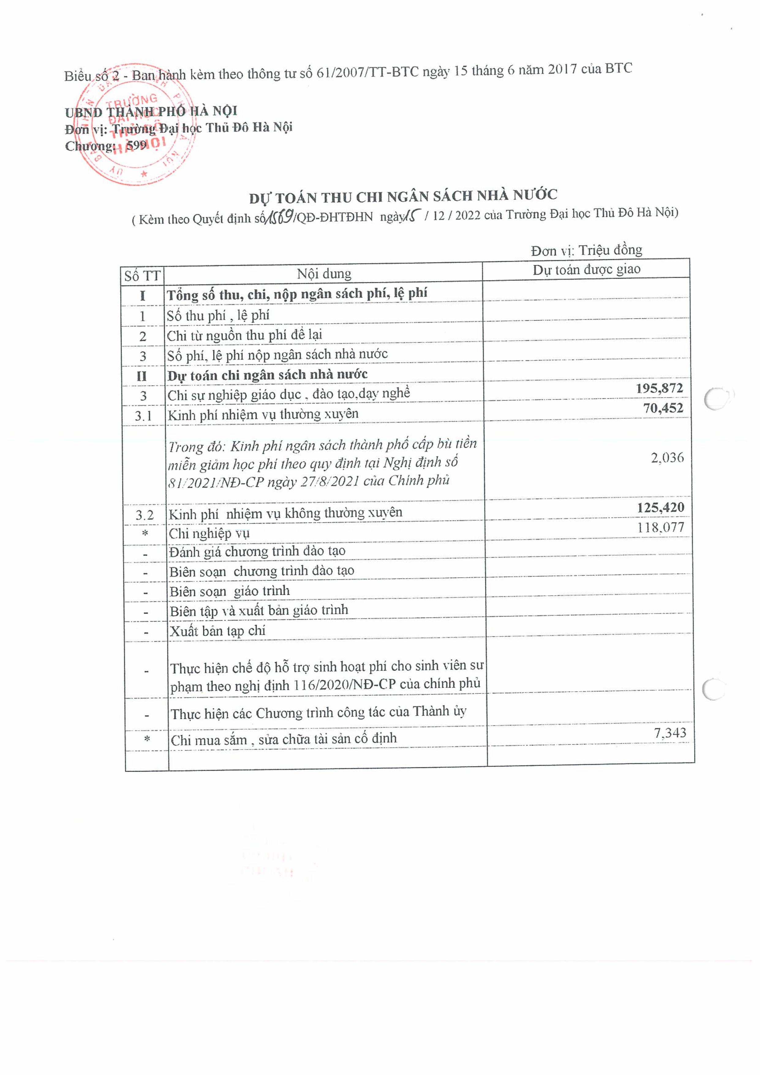 Quyết định về việc công khai giao dự toán chi ngân sách nhà nước năm 2023 đối với trường Đại học Thủ đô Hà Nội Lần 1
