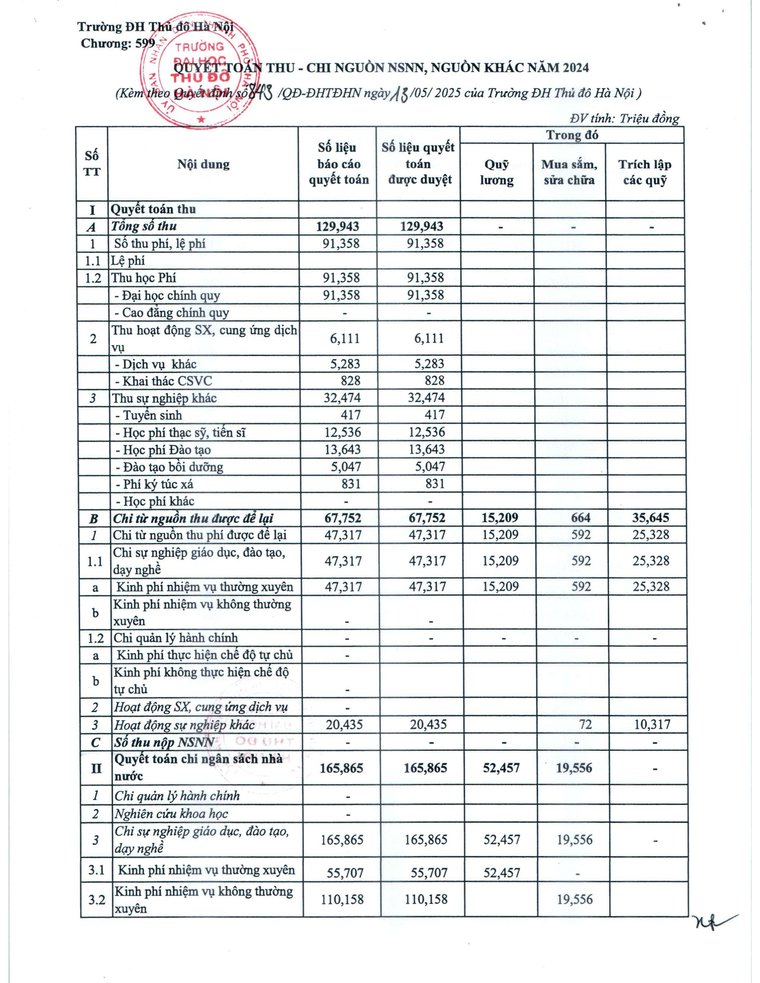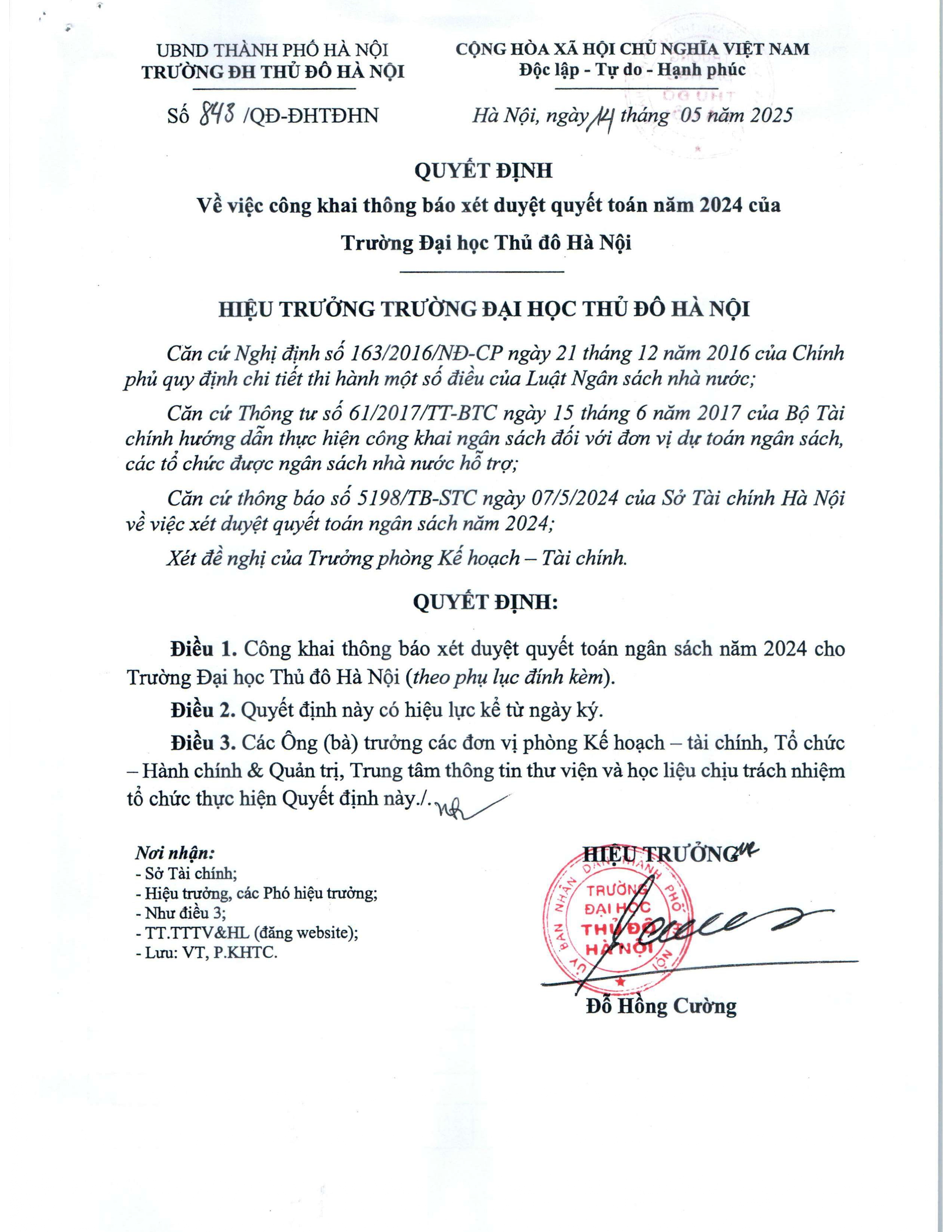 Quyết định về việc công khai thông báo xét duyệt quyết toán năm 2024 của với Trường Đại học Thủ đô Hà Nội
