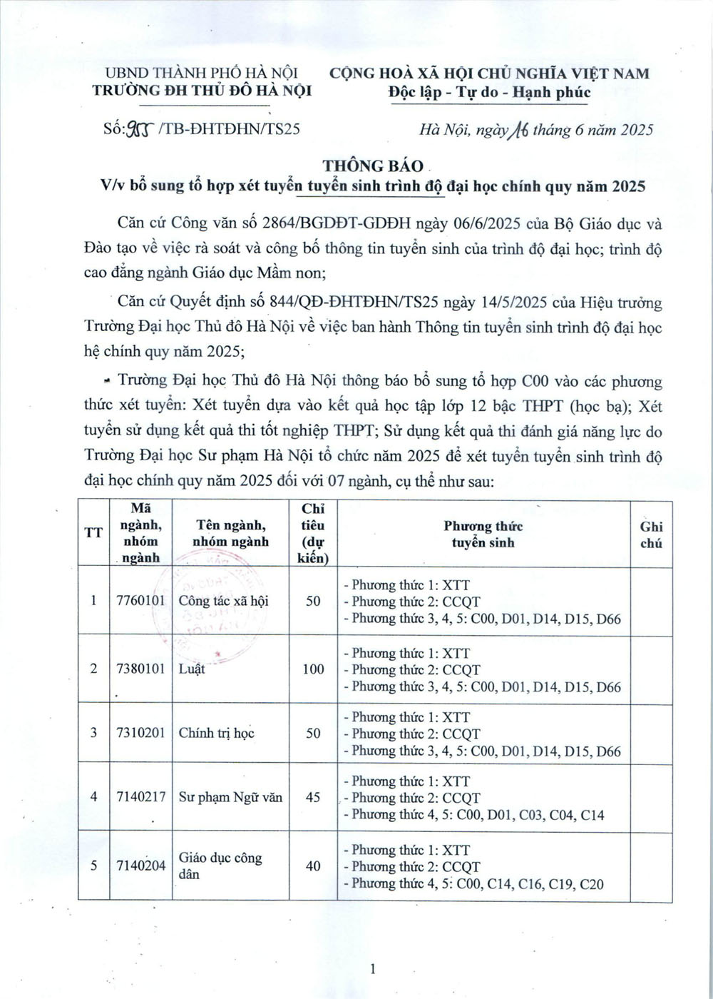 Thông báo bổ sung tổ hợp xét tuyển tuyển sinh trình độ đại học chính quy năm 2025