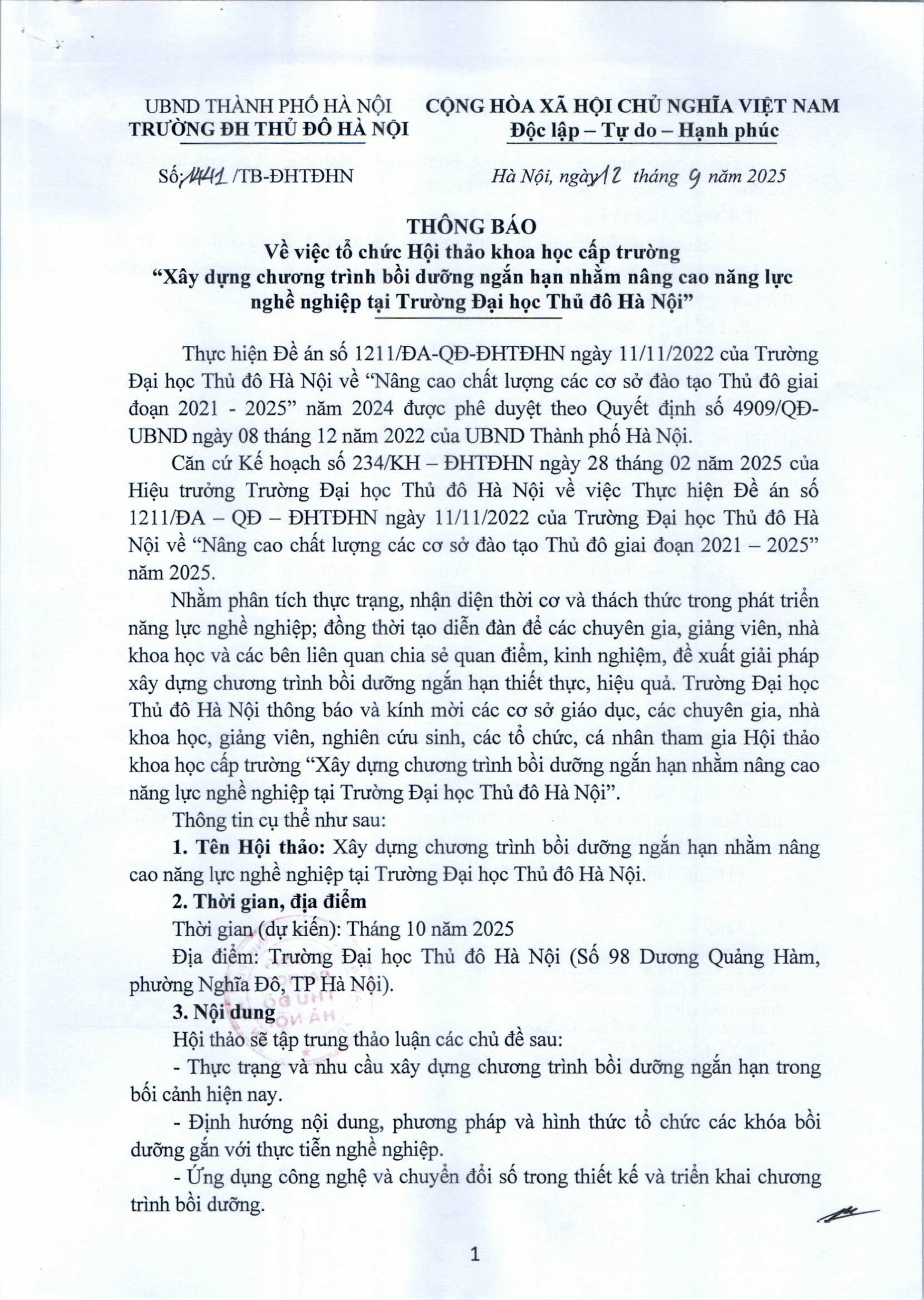 Thông báo tổ chức Hội thảo khoa học cấp trường "Xây dựng chương trình bồi dưỡng ngắn hạn nhằm nâng cao năng lực nghề nghiệp tại trường Đại học Thủ Đô Hà Nội"