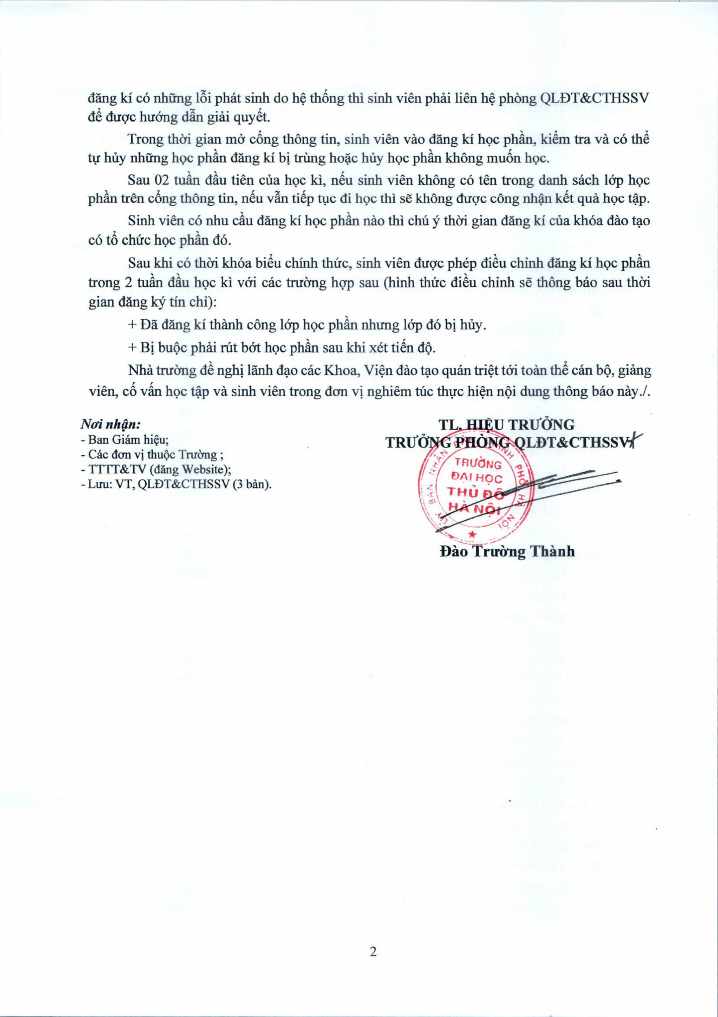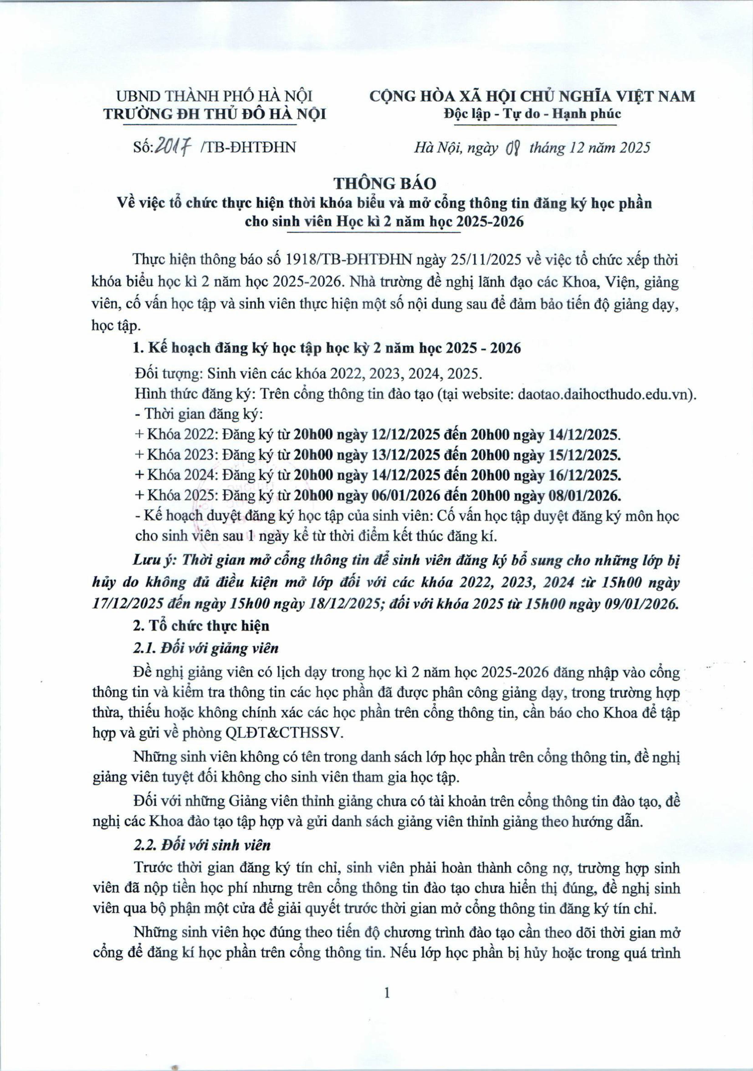 Thông báo tổ chức thực hiện thời khóa biểu và mở cổng thông tin đăng ký học phần cho sinh viên Học kì 2 năm học 2025 - 2026