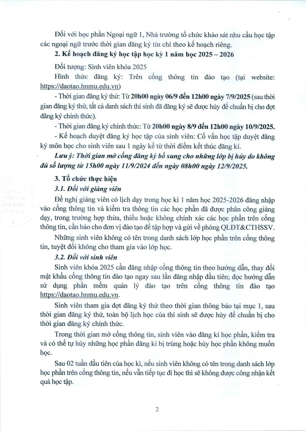 Thông báo tổ chức thực hiện thời khóa biểu và mở cổng thông tin đăng ký học phần cho sinh viên khoá 2025, học kỳ 1 năm học 2025-2026