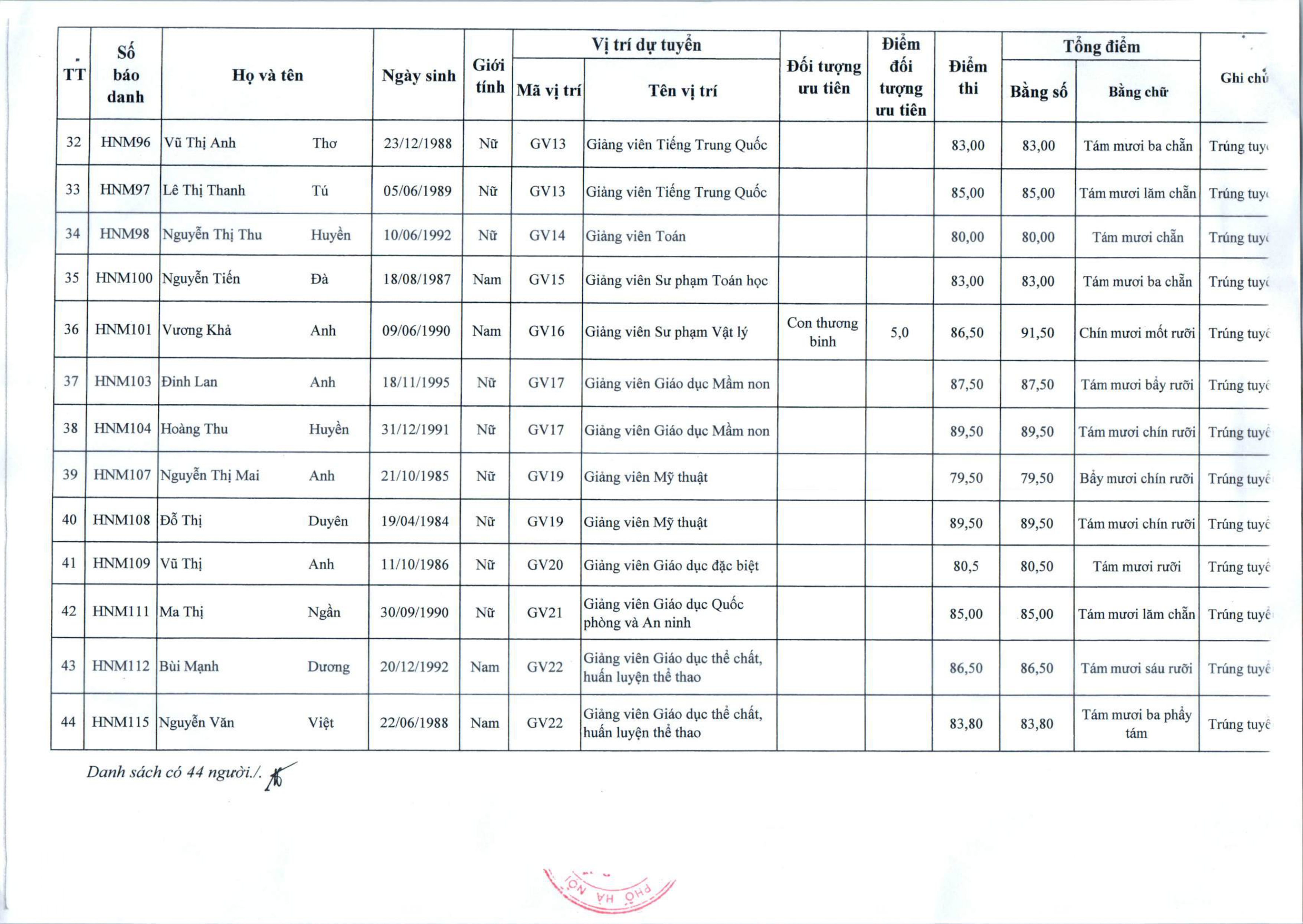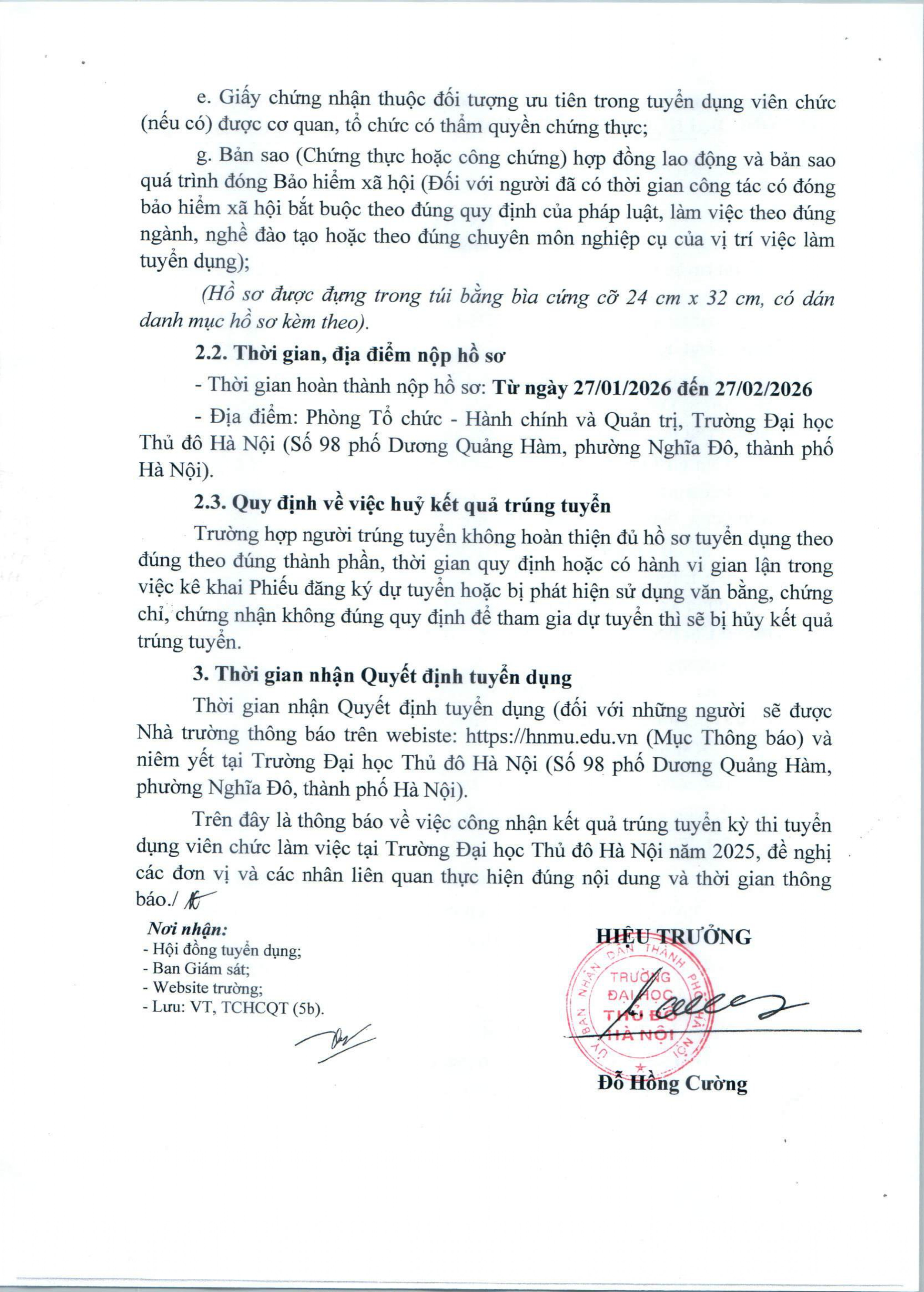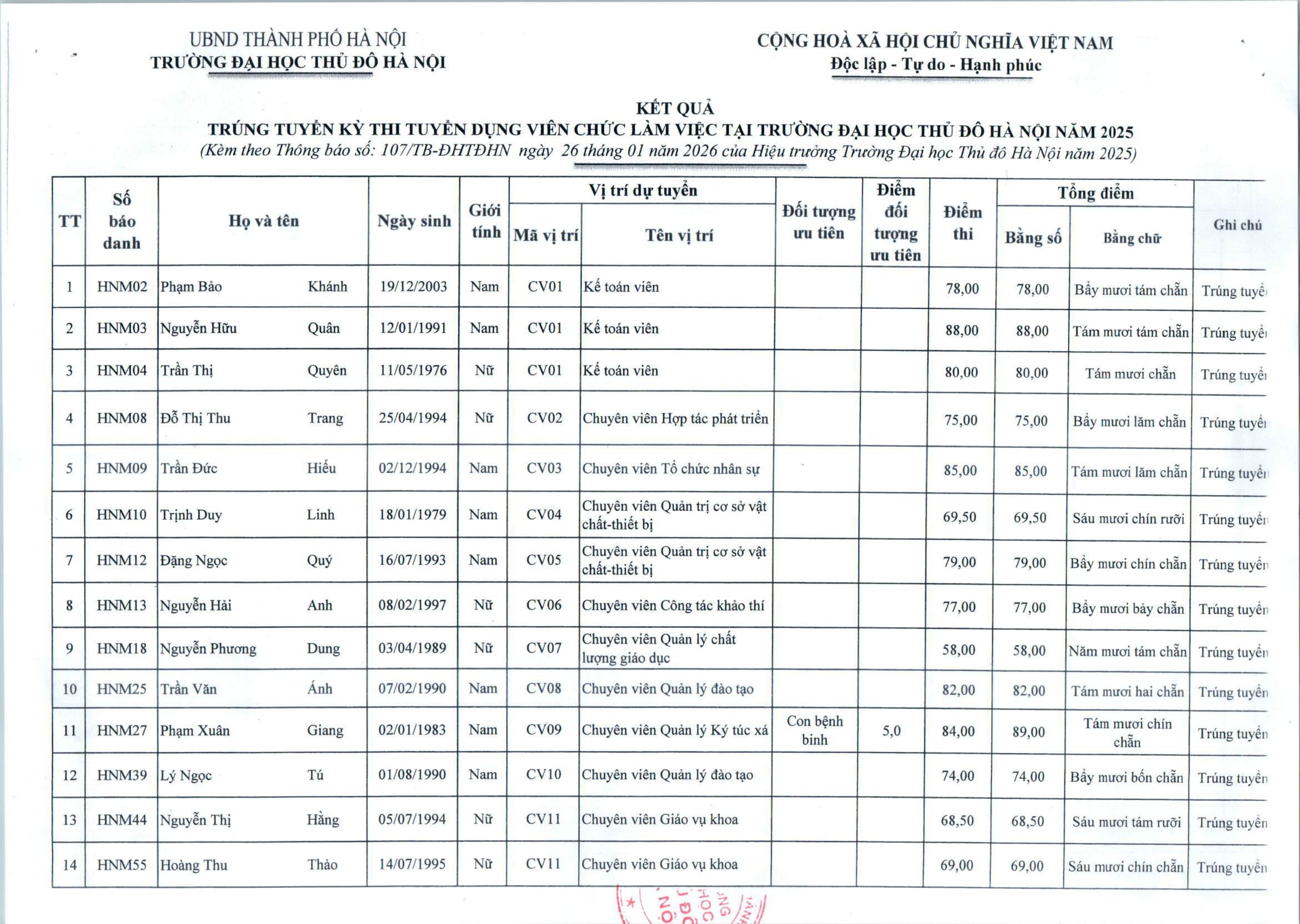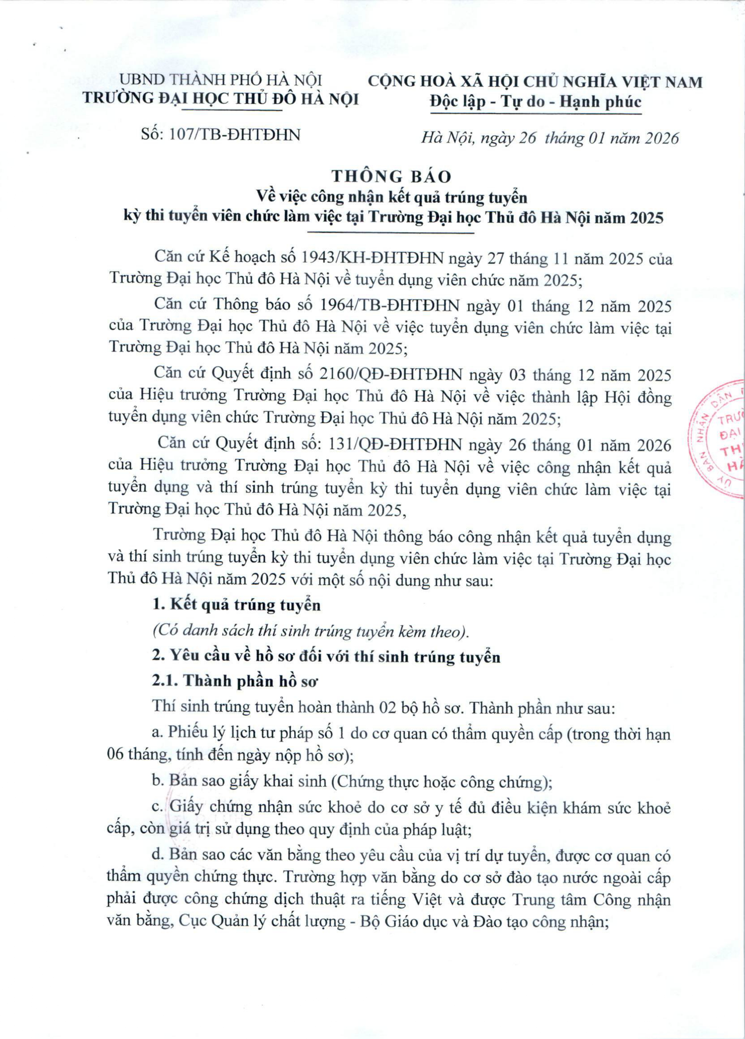 Thông báo công nhận kết quả trúng tuyển kỳ thi tuyển viên chức làm việc tại Trường Đại học Thủ đô Hà Nội năm 2025