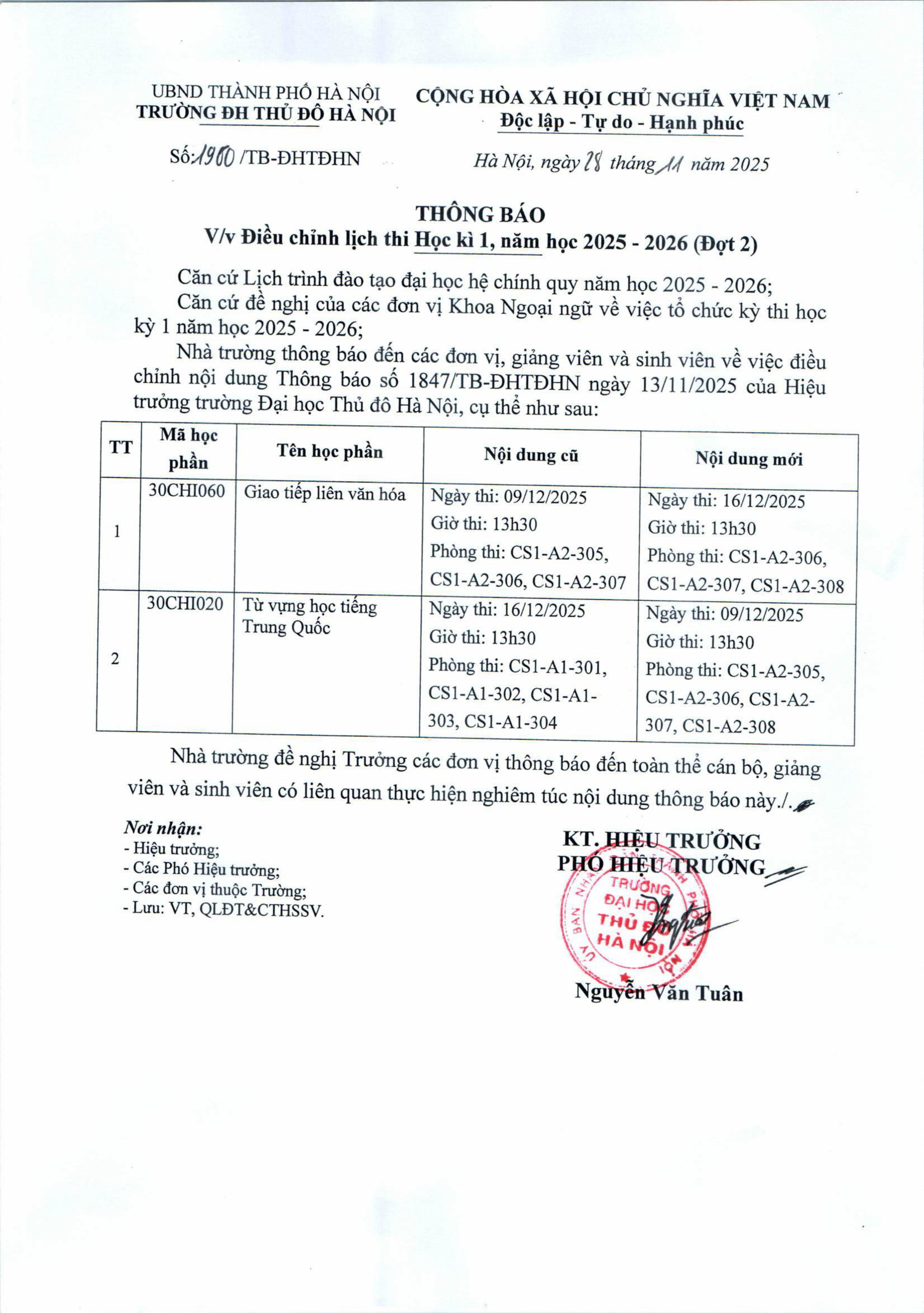 Thông báo điều chỉnh lịch thi Học kì 1, năm học 2025 - 2026 ( Đợt 2 )
