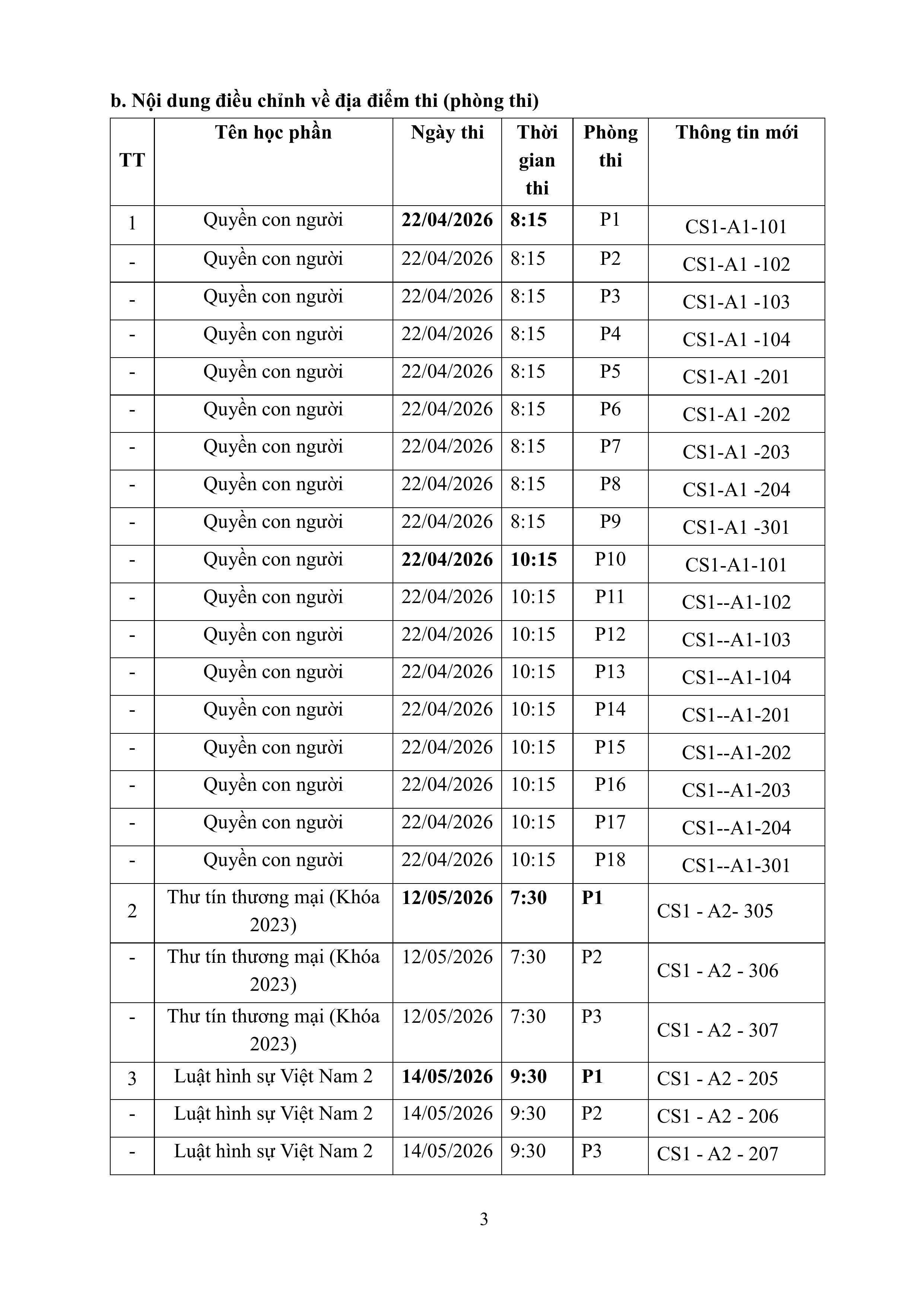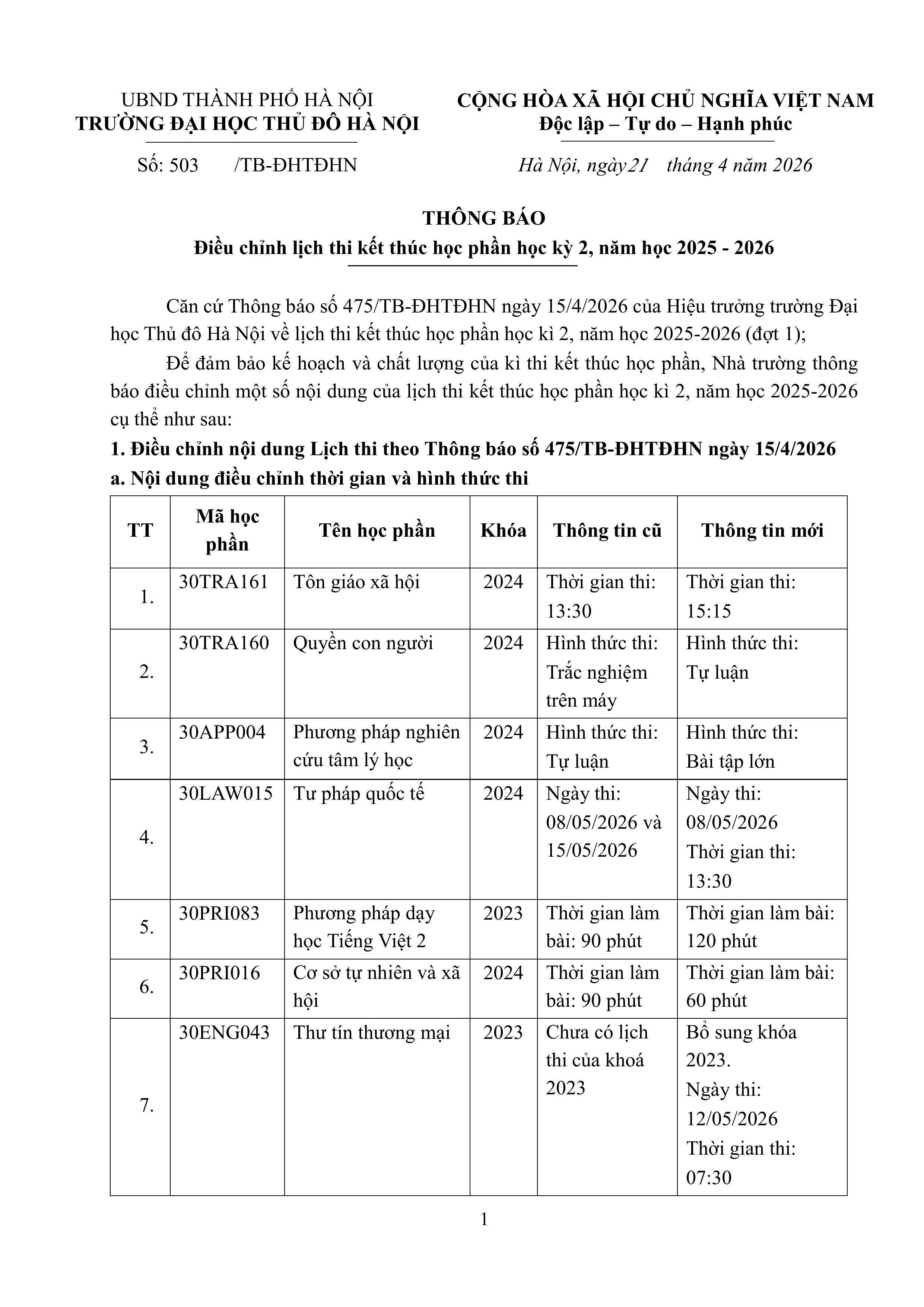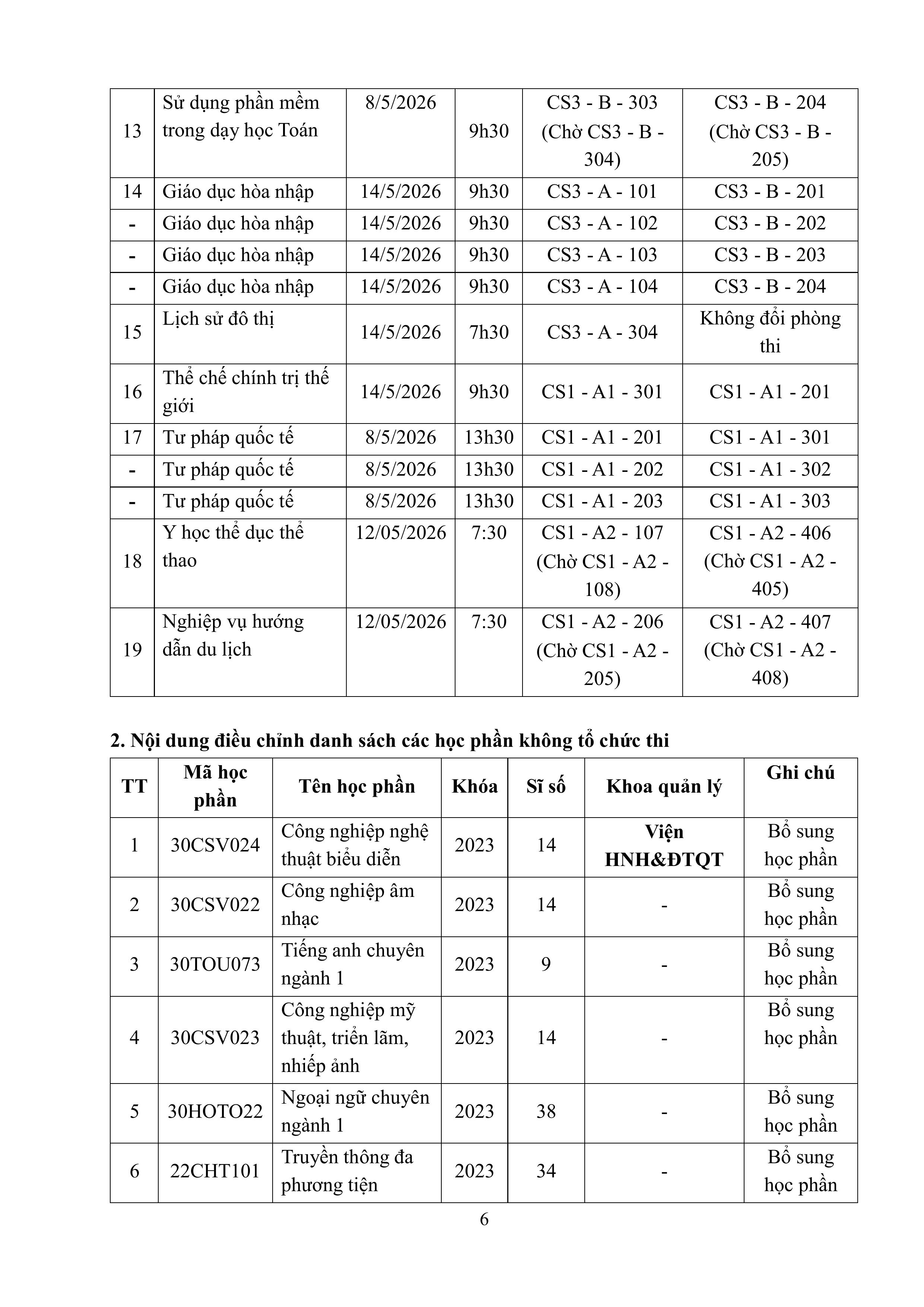 Thông báo điều chỉnh lịch thi kết thúc học phần học kỳ 2, năm học 2025 - 2026