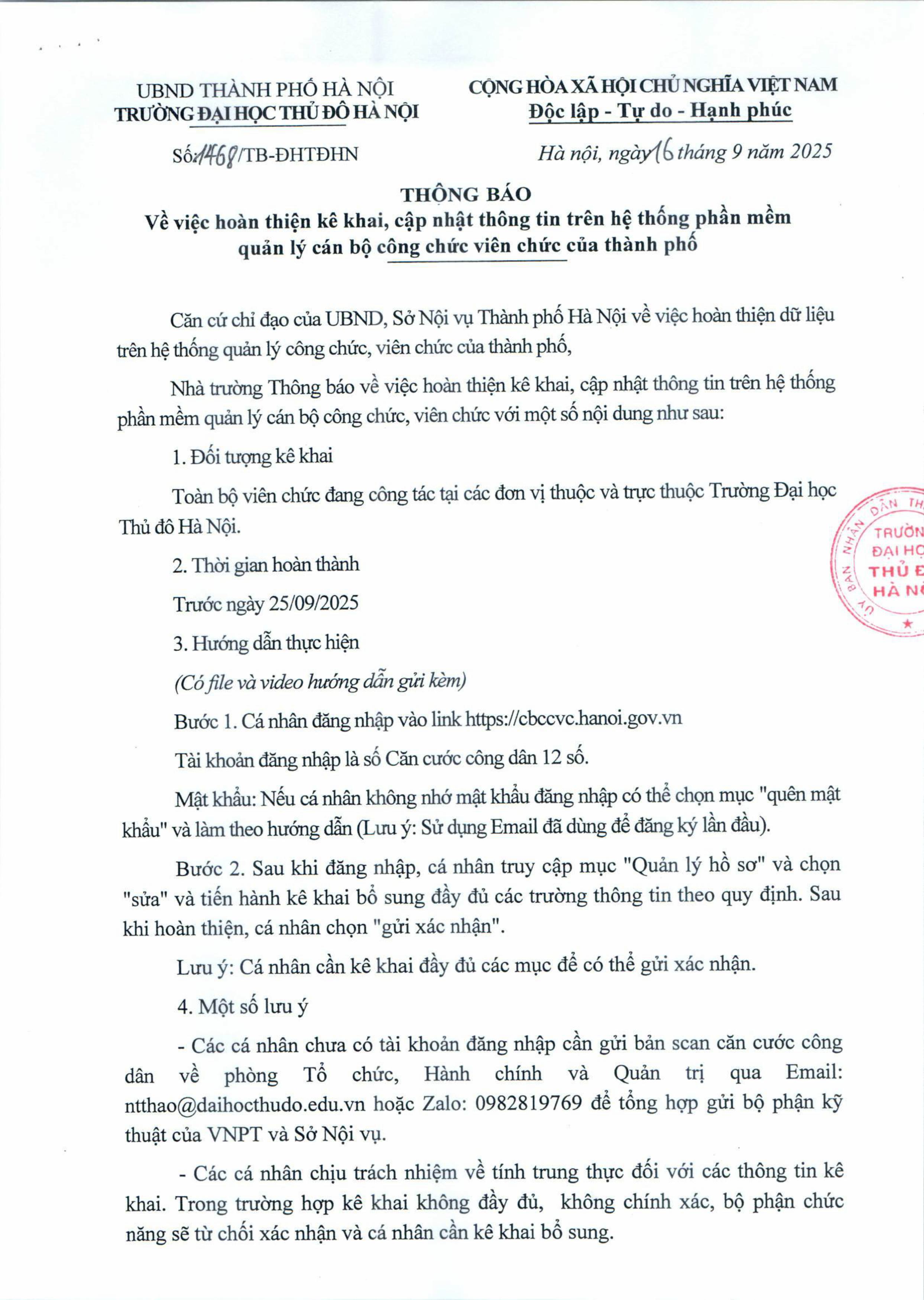 Thông báo Hoàn thiện kê khai, cập nhật thông tin trên hệ thóng phần mềm quản lý cán bộ công chức viên chức của thành phố