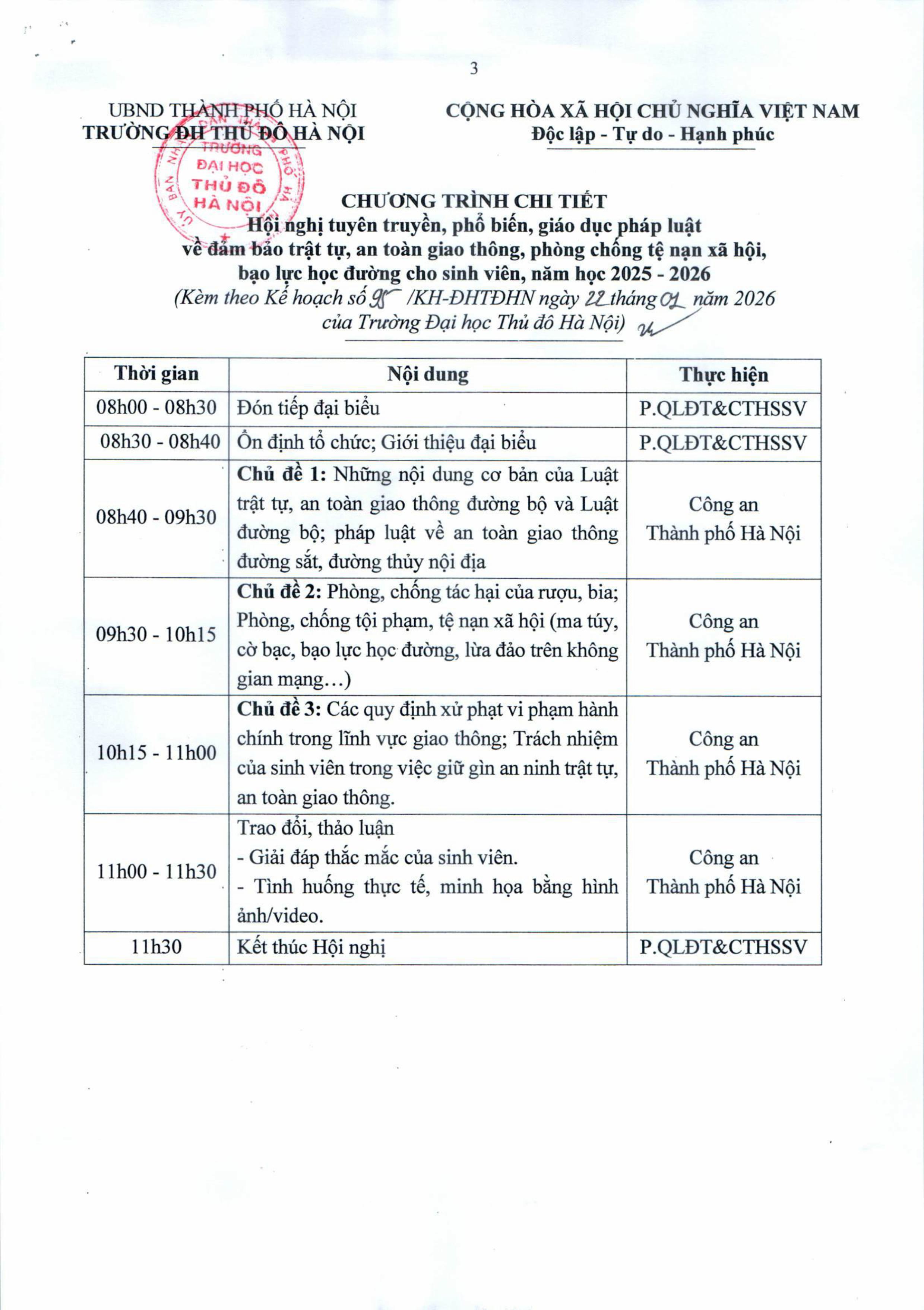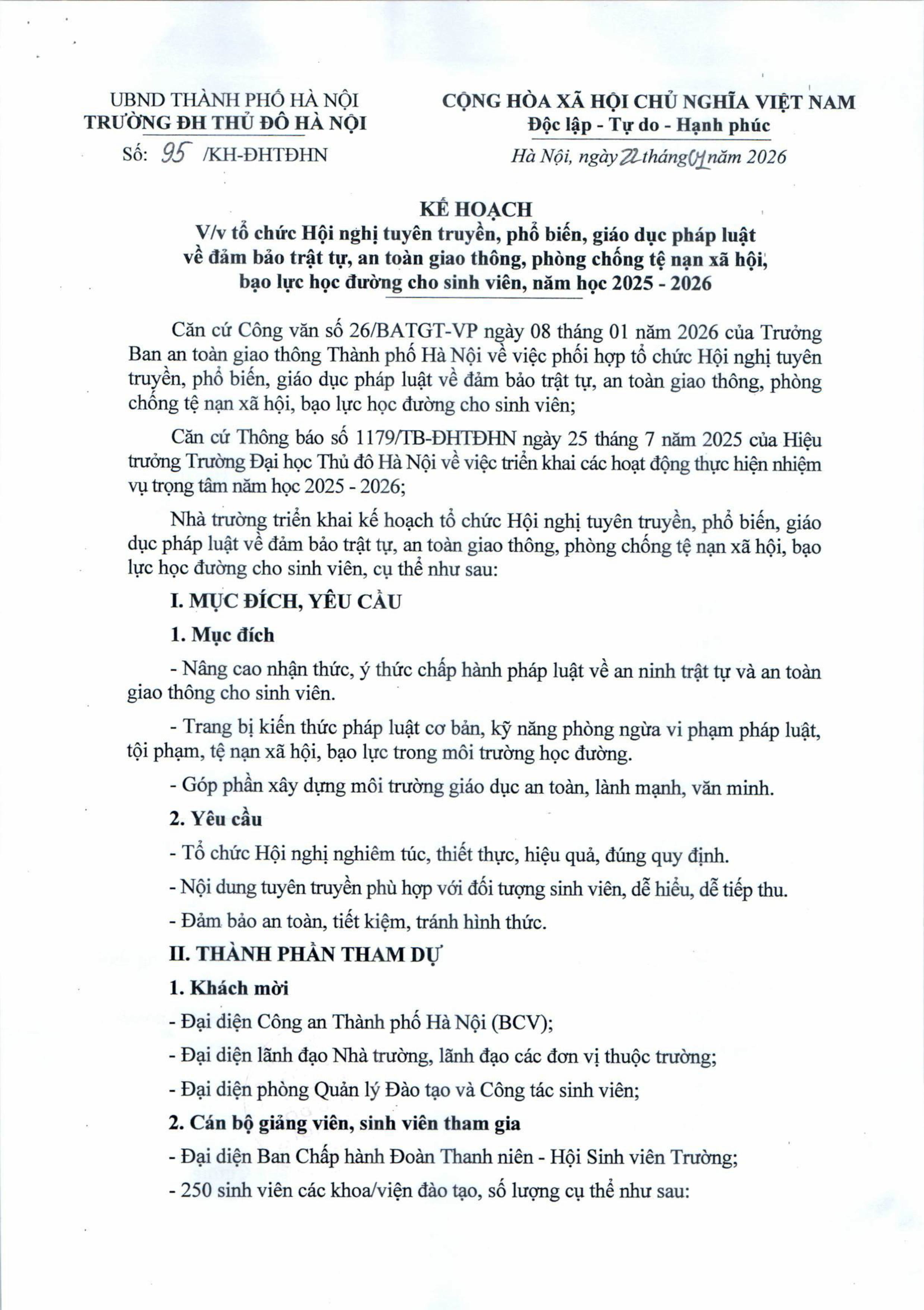 Thông báo kế hoạch tổ chức Hội nghị tuyên truyền, phổ biến, giáo dục pháp luật về đảm bảo trật tự, an toàn giao thông, phòng chống tệ nạn xã hội, bạo lực học đường cho sinh viên, năm học 2025 - 2026