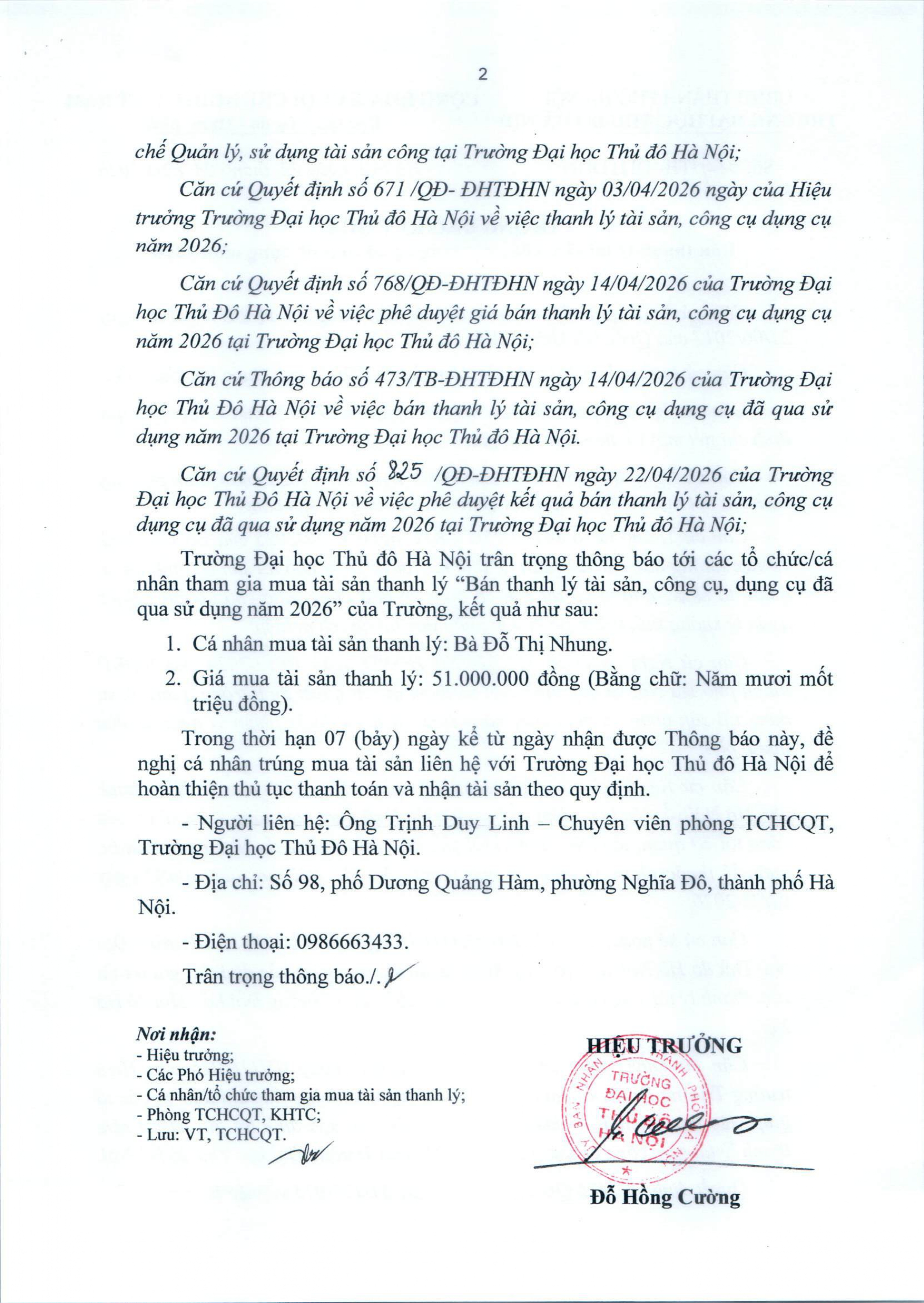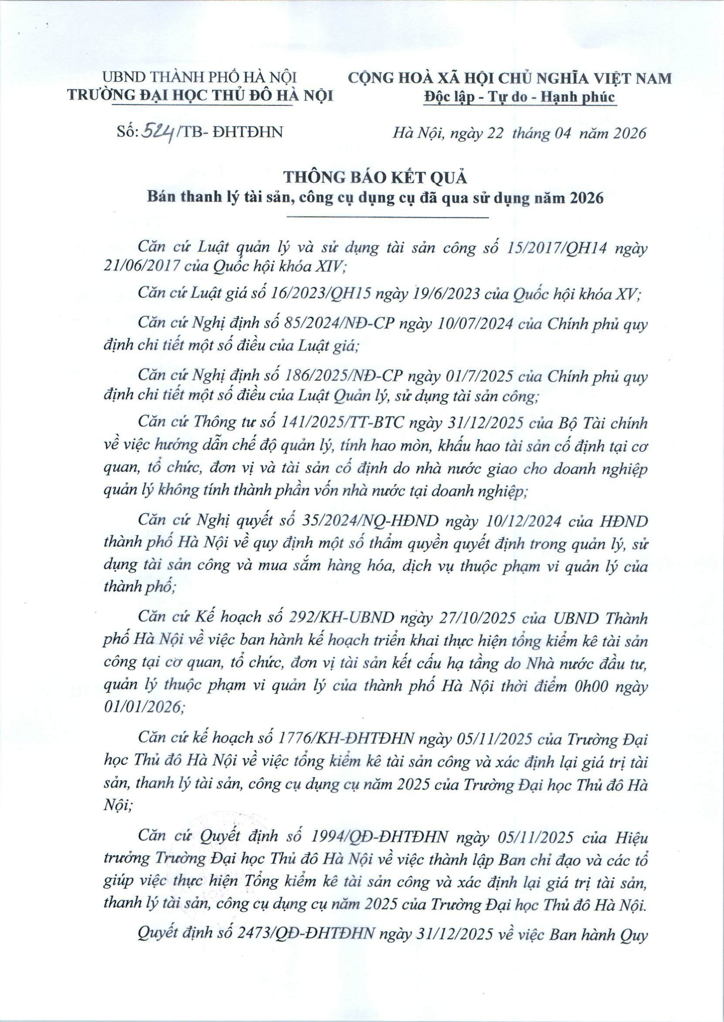 Thông báo kết quả bán thanh lý tài sản, công cụ dụng cụ đã qua sử dụng năm 2026