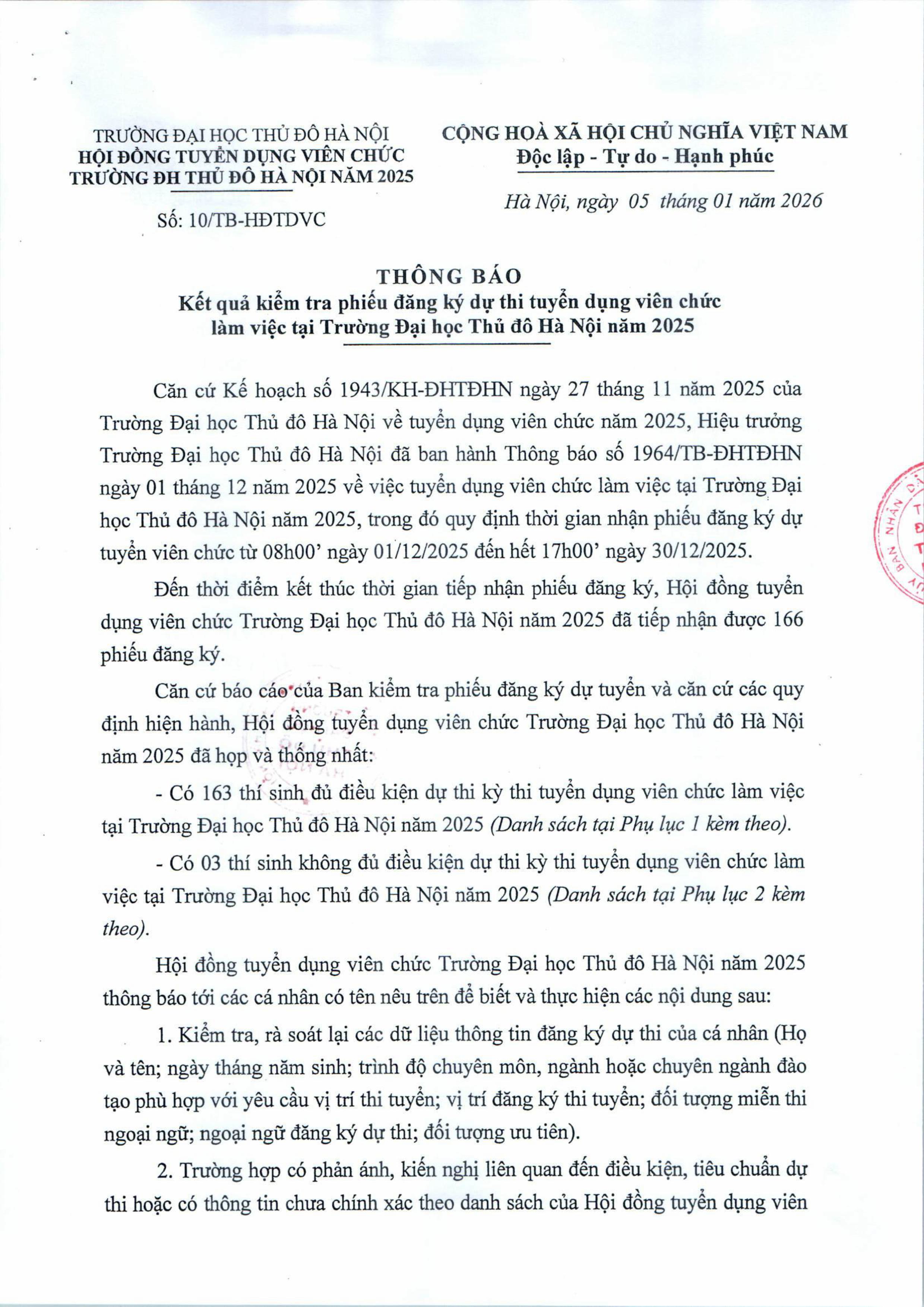 Thông báo Kết quả kiểm tra phiếu đăng ký dự thi tuyển dụng viên chức làm việc tại Trường Đại học Thủ đô Hà Nội năm 2025