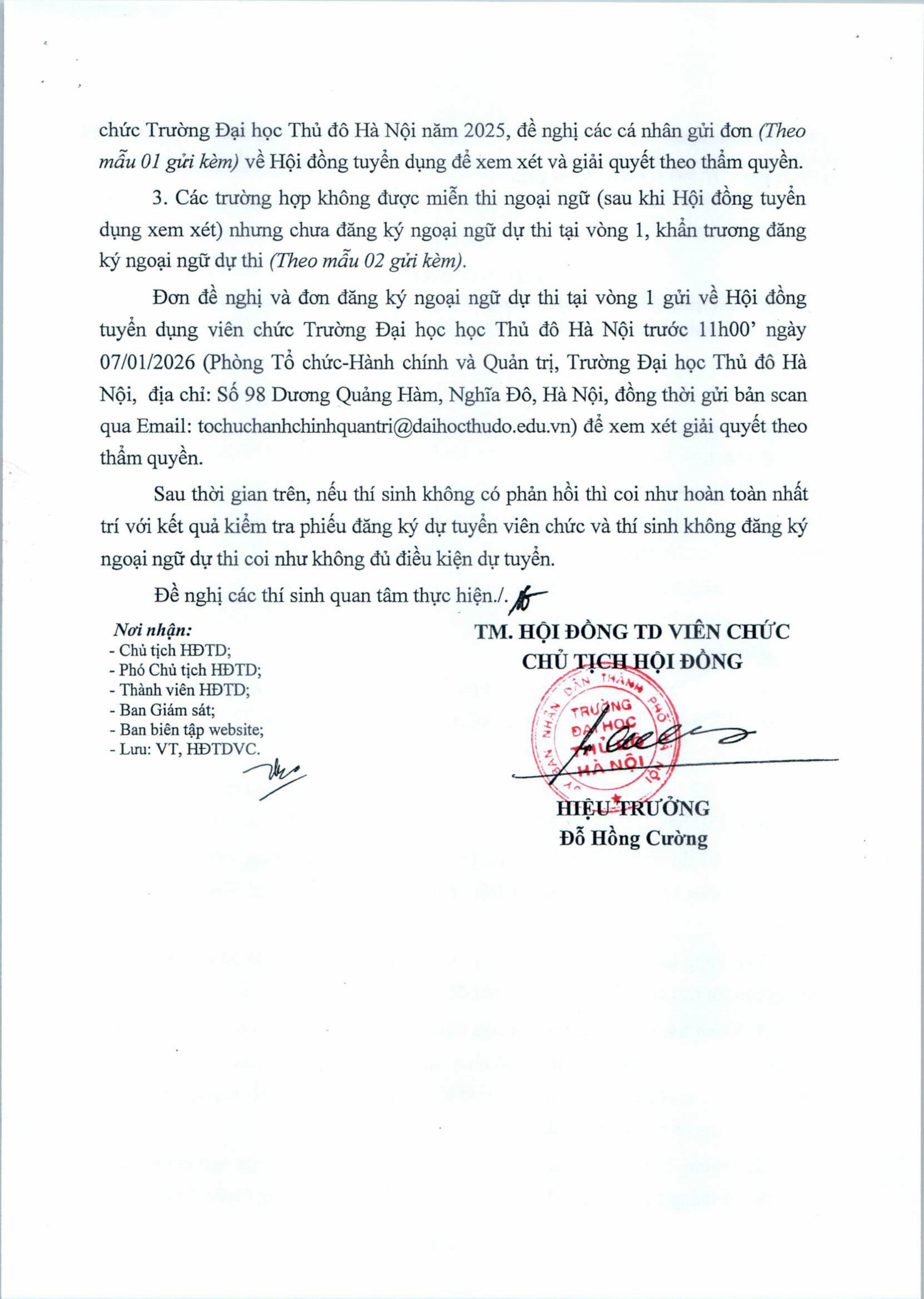 - Mẫu "ĐƠN ĐĂNG KÝ NGOẠI NGỮ DỰ THI TẠI VÒNG 1 Kỳ thì tuyển dụng viên chức làm việc tại Trường Đại học Thủ đô Hà Nội năm 2025" tải TẠI ĐÂY