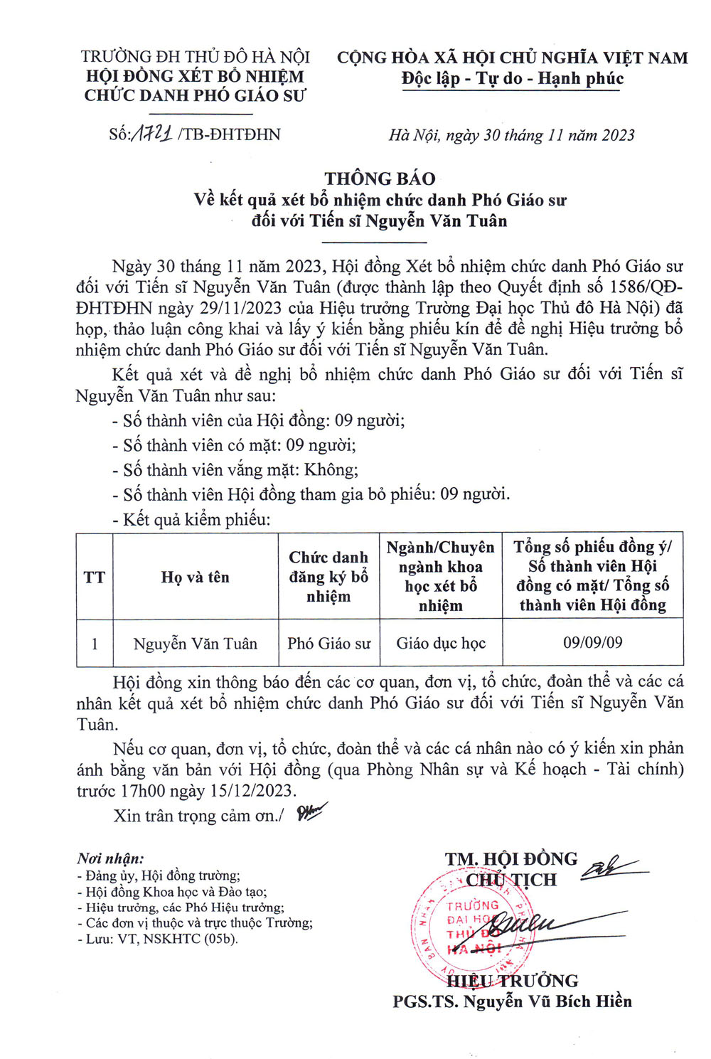 Thông báo kết quả xét bổ nhiệm chức danh Phó Giáo sư đối với Tiến sĩ Nguyễn Văn Tuân
