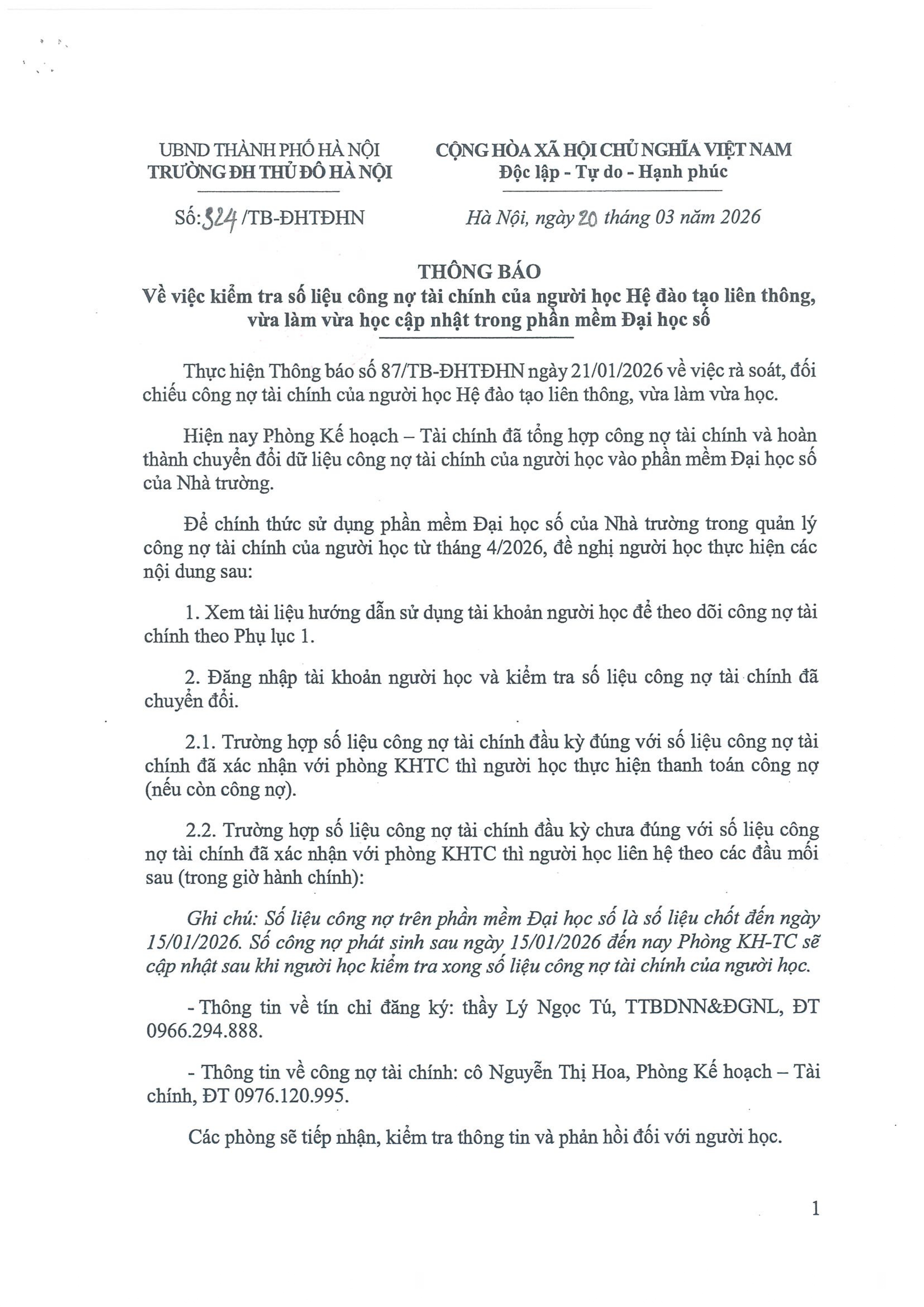 Thông báo kiểm tra số liệu công nợ tài chính của người học Hệ đào tạo liên thông, vừa làm vừa học cập nhật trong phần mềm Đại học số